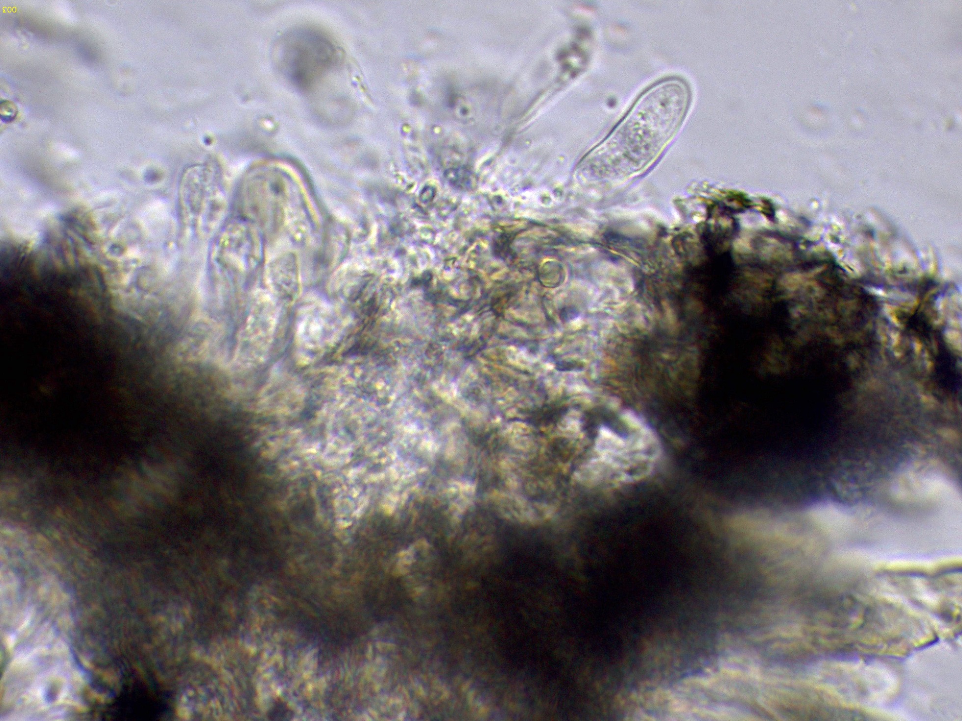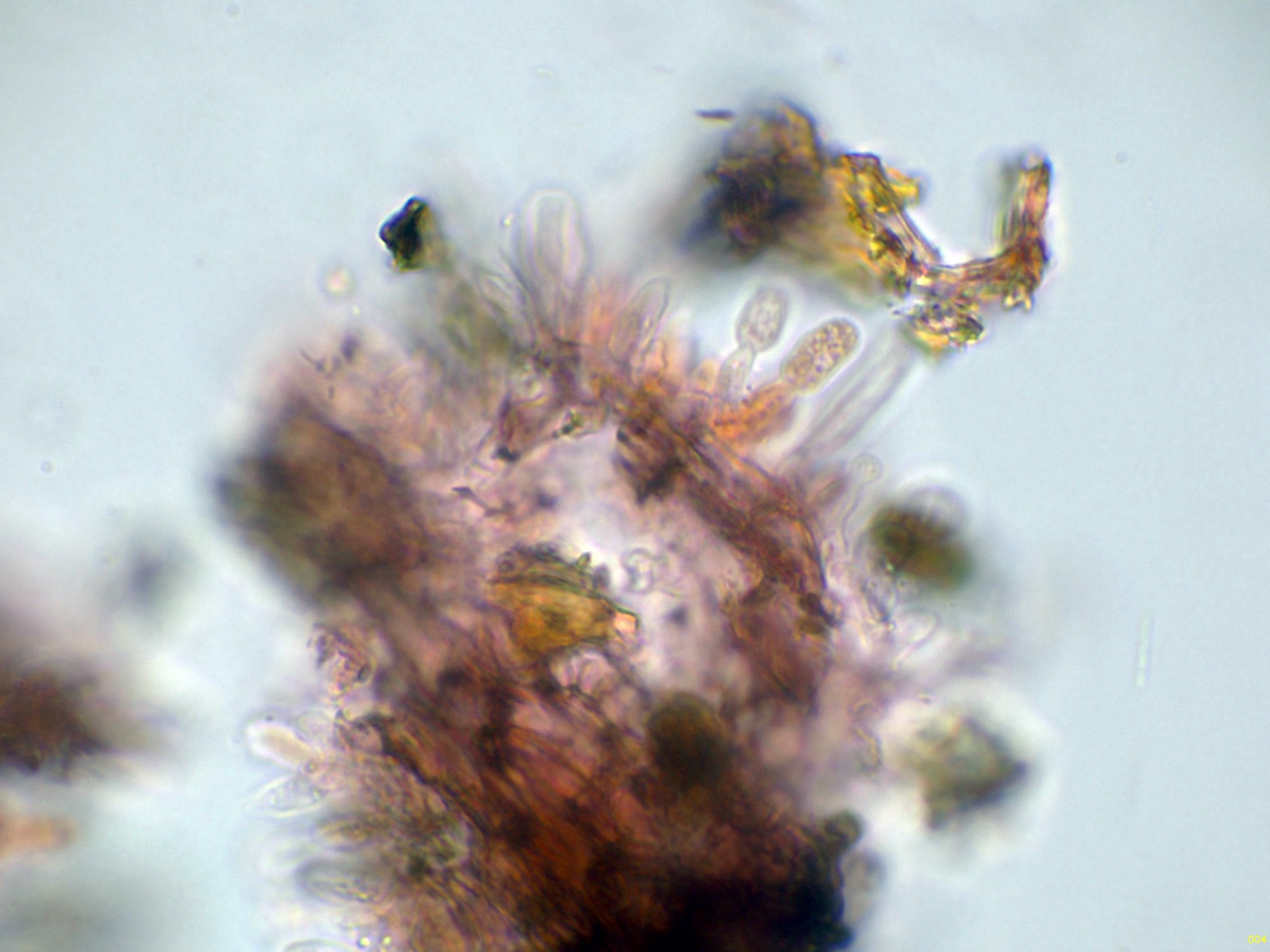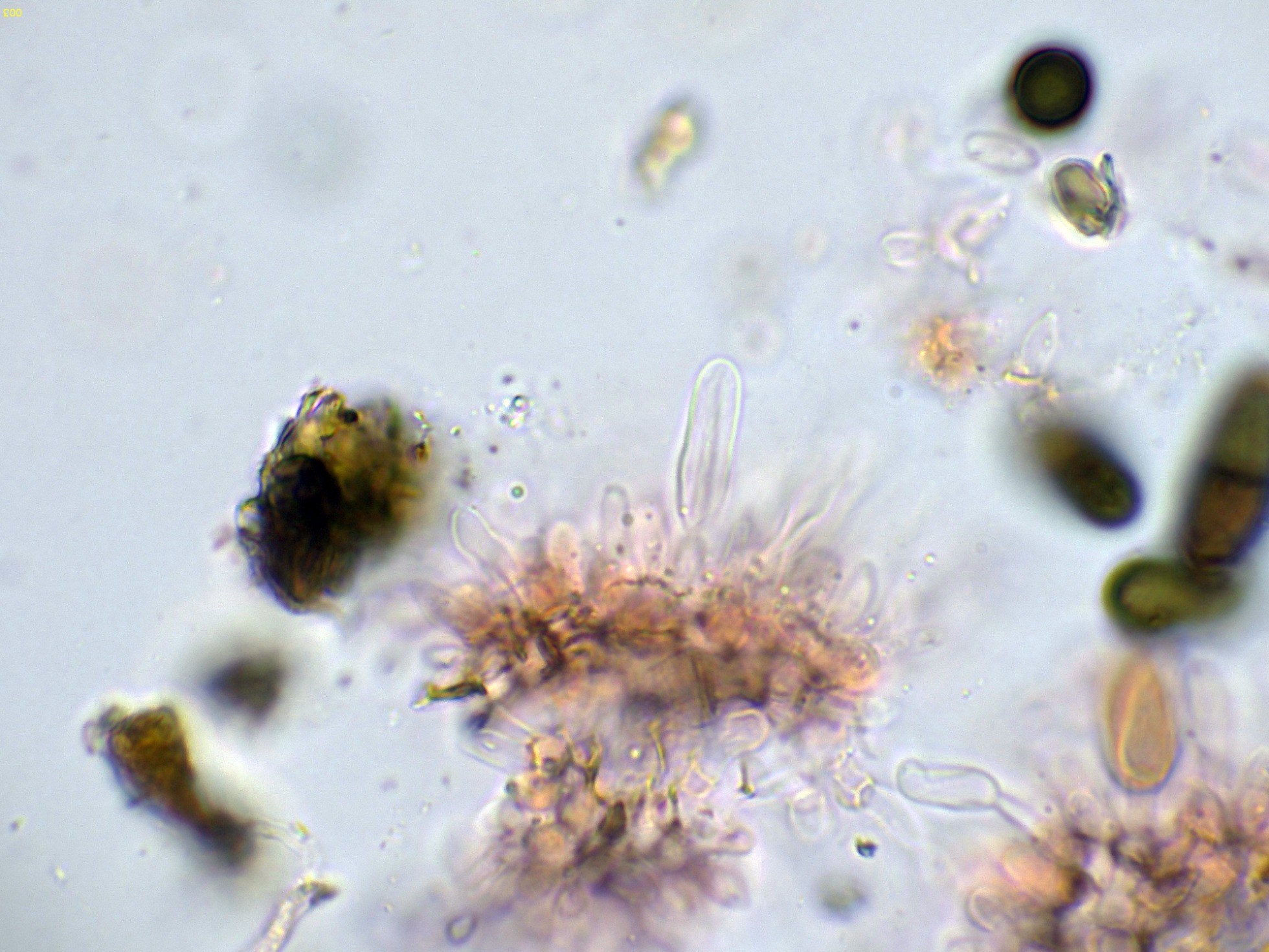El primero un anamorfo formando synnemata brotando de manera dispersa sobre la superficie, atendiendo a su conidiogénesis y la morfología de los conidios, debo considerar un Clonostachys, hasta incluso por la medida de los conidios Clonostacys rosea, pero resulta que este ya creo haberlo estudiado en el pasado, y presentaba un aspecto muy distinto al de ahora, muy parecido a esporodoquios, con lo queda en mis archivos como Clonostachys sp.