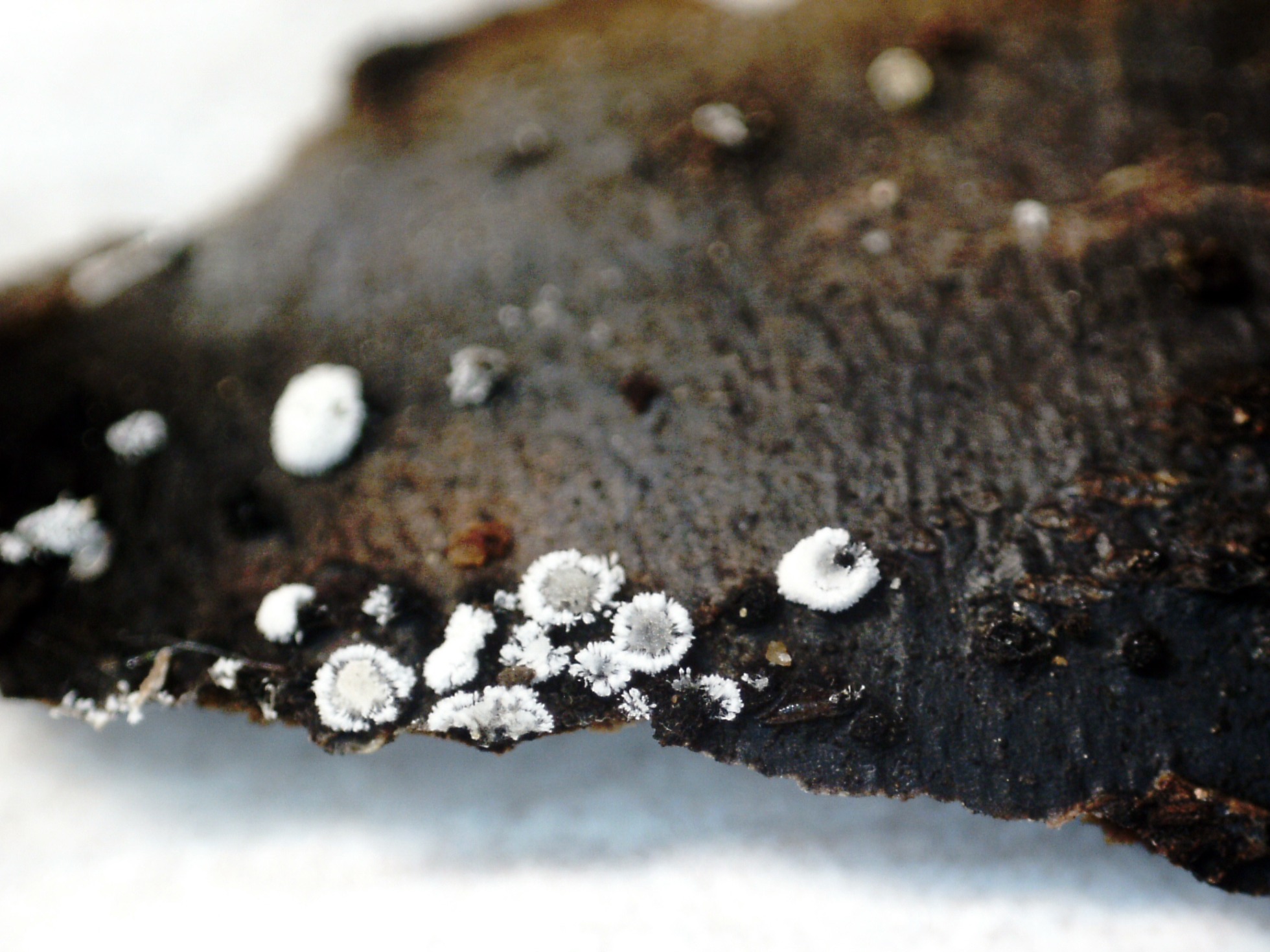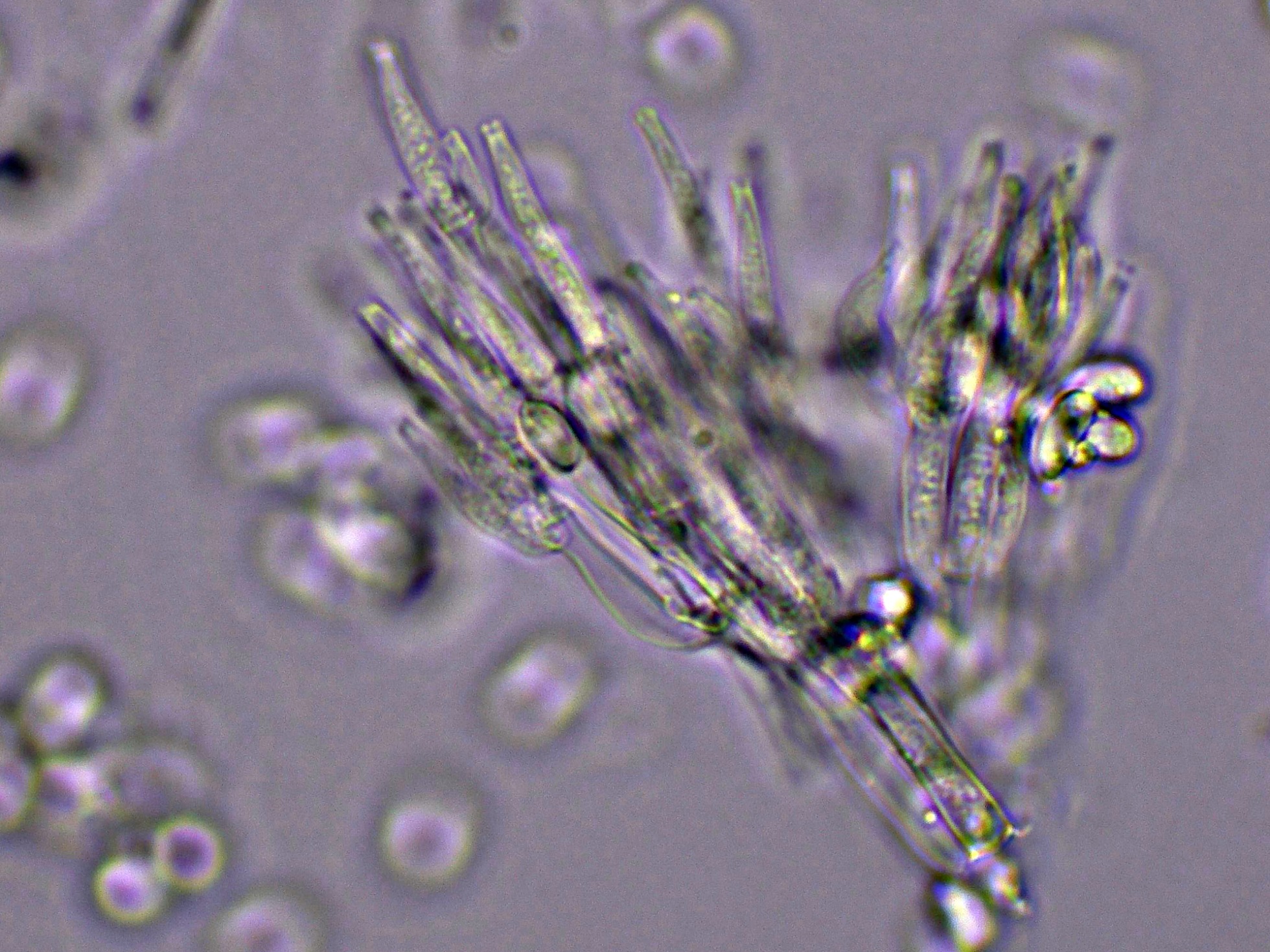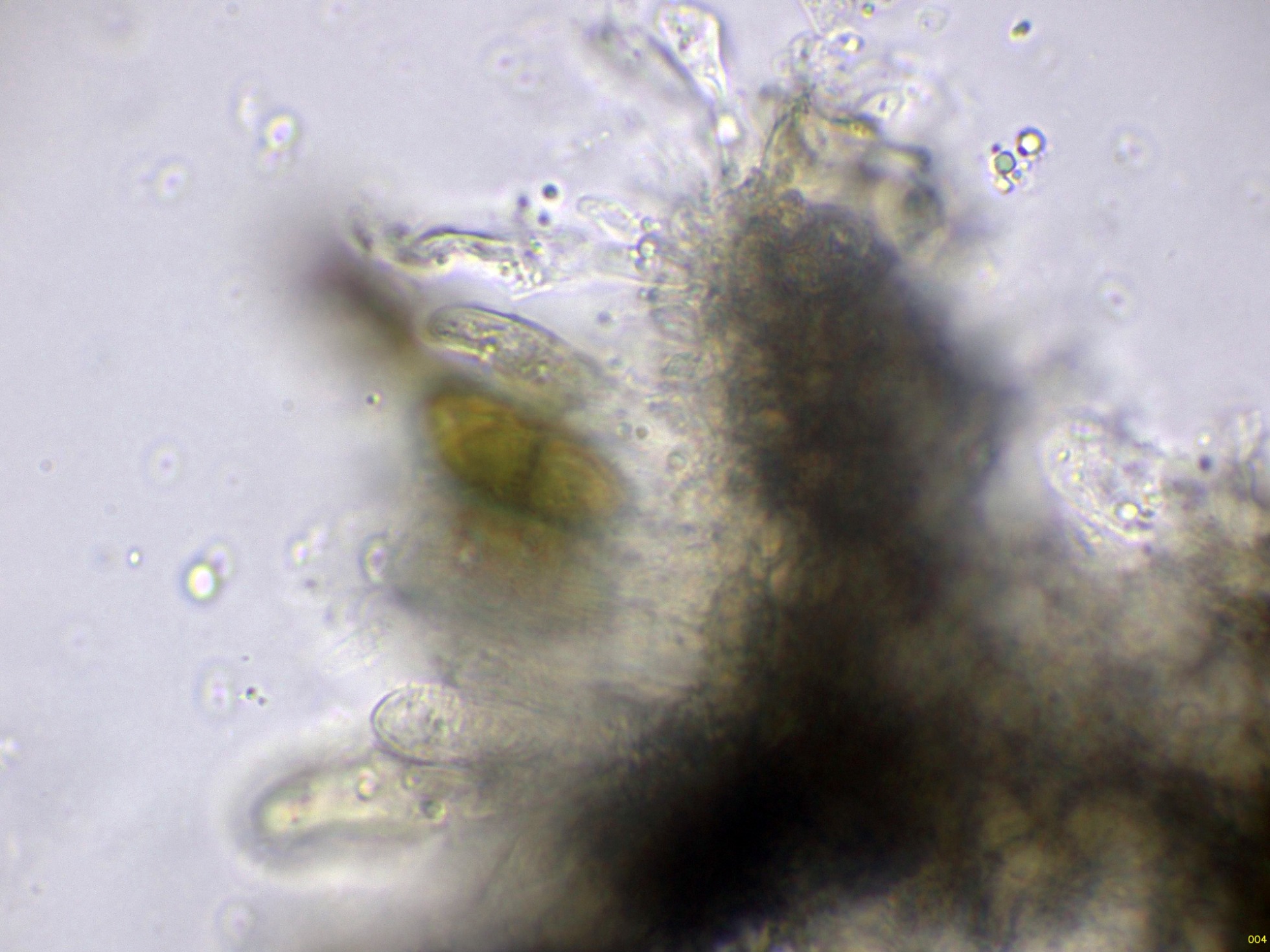 El primero un anamorfo formando synnemata brotando de manera dispersa sobre la superficie, atendiendo a su conidiogénesis y la morfología de los conidios, debo considerar un Clonostachys, hasta incluso por la medida de los conidios Clonostacys rosea, pero resulta que este ya creo haberlo estudiado en el pasado, y presentaba un aspecto muy distinto al de ahora, muy parecido a esporodoquios, con lo queda en mis archivos como Clonostachys sp.