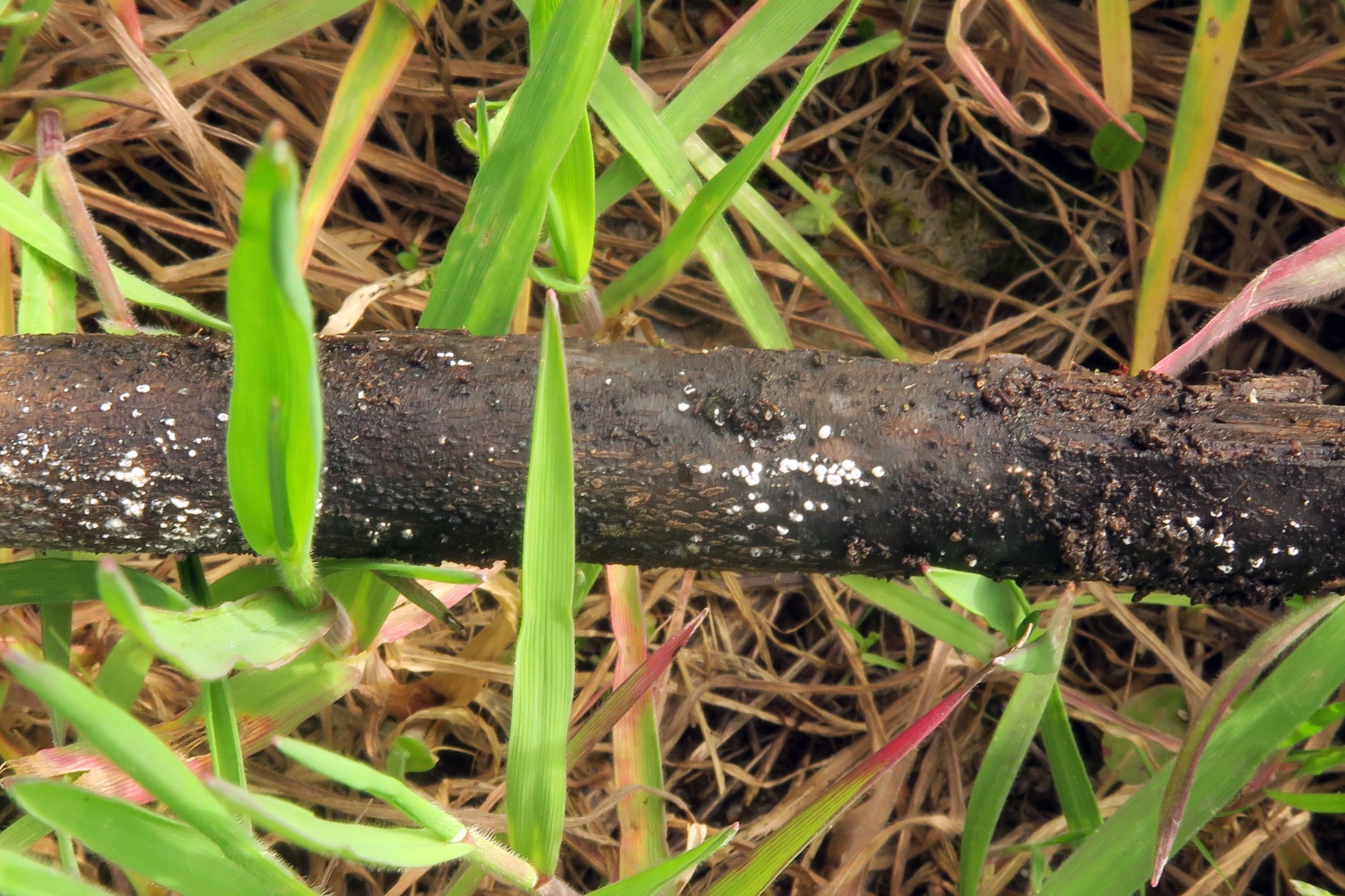 Unos hongos del sábado 22 de marzo, localizados sobre un pequeño tronco de rosácea del suelo, al lado de un campo de árboles frutales y procedente de labores de desescombro de una acequia cercana.