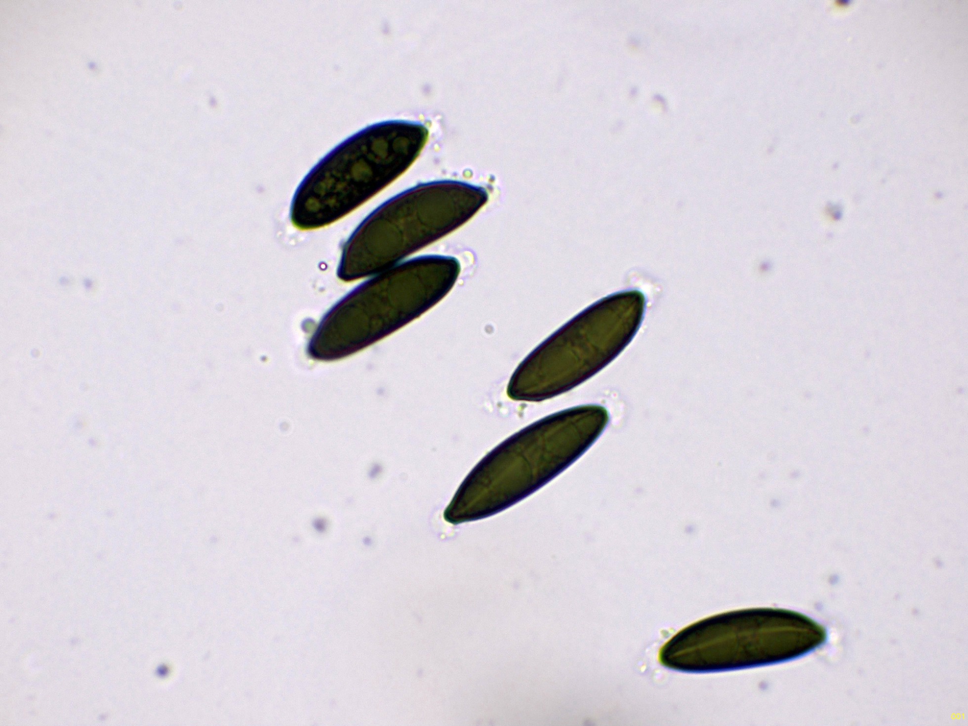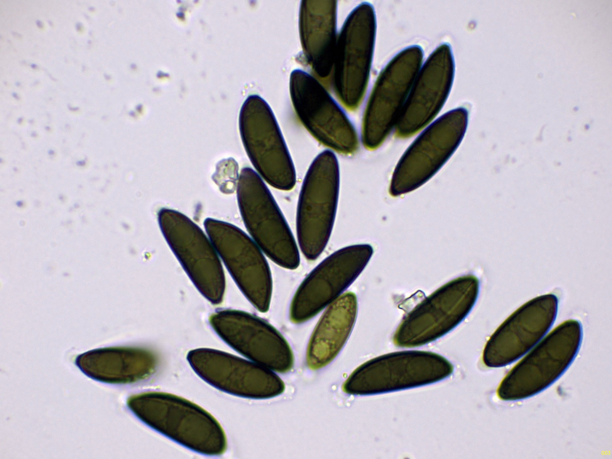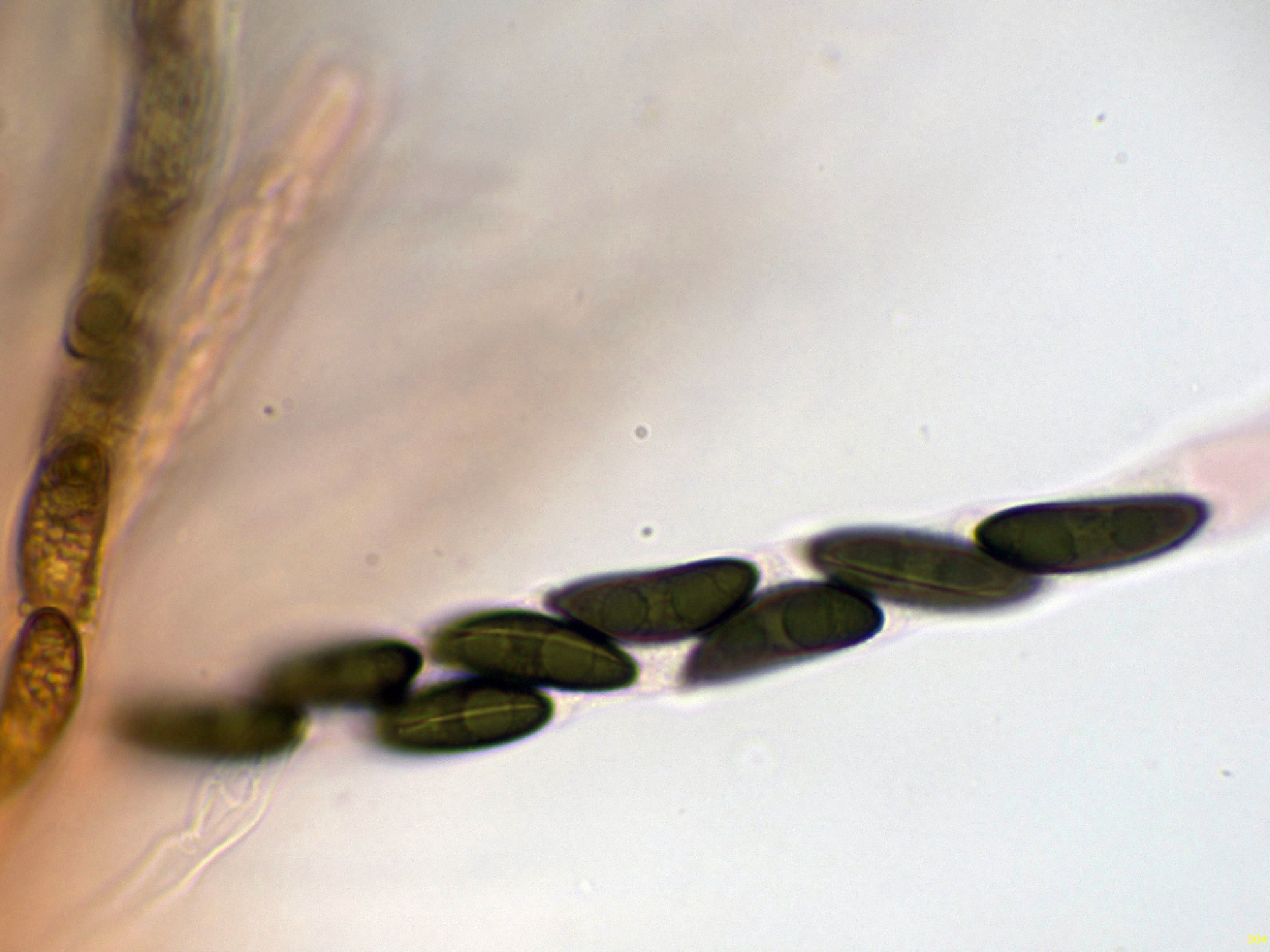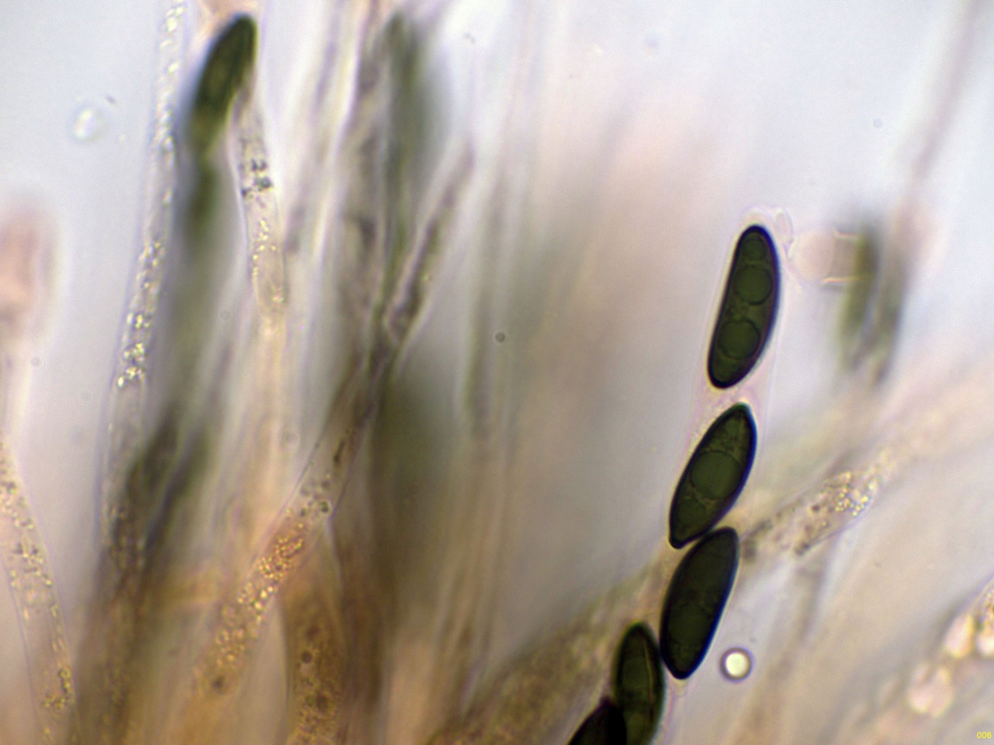 Ascosporas inequilaterales, de color marrón oscuro, con una vaina viscosa que envuelve toda la espora, esta vaina más visible en los polos.