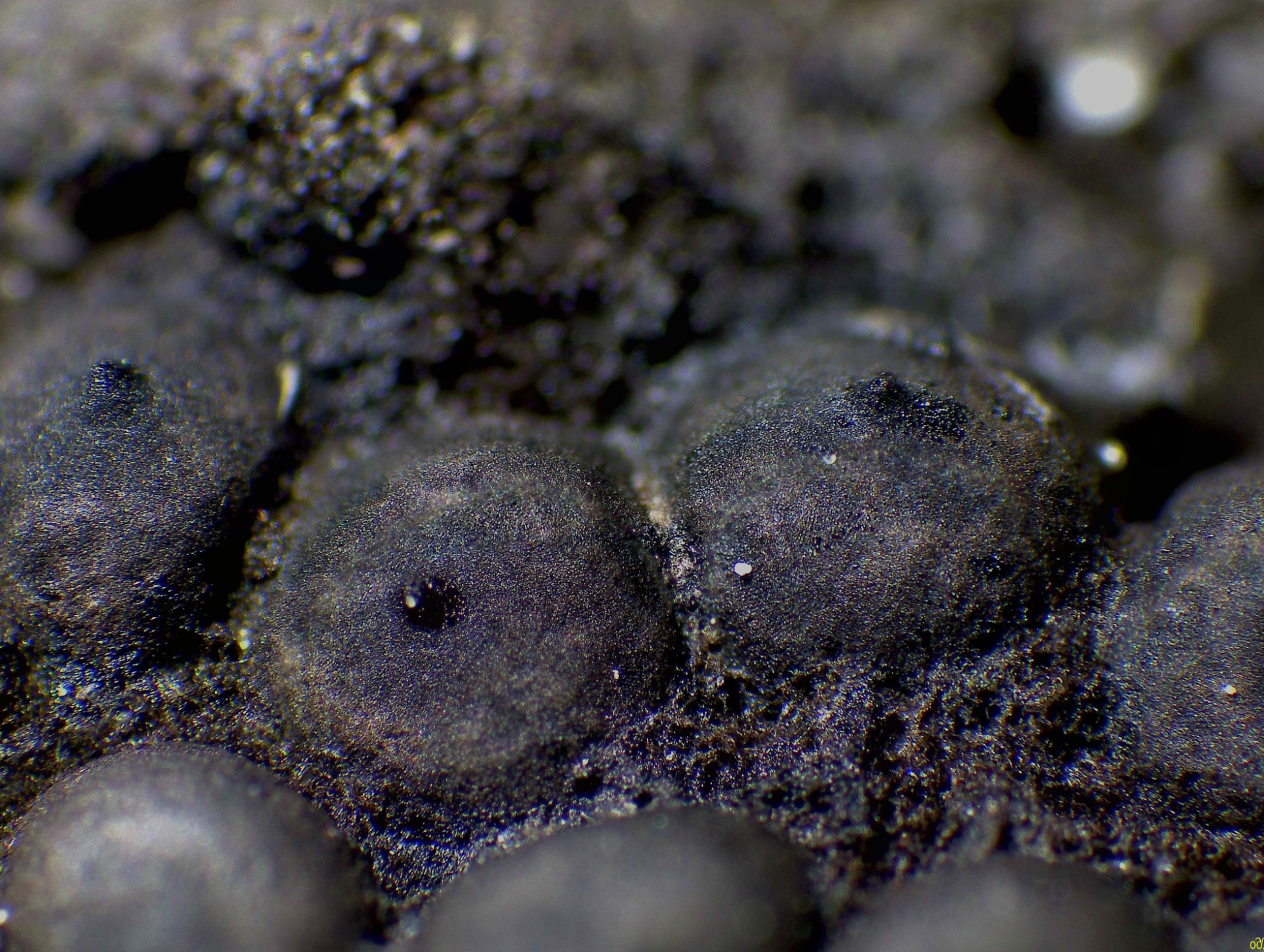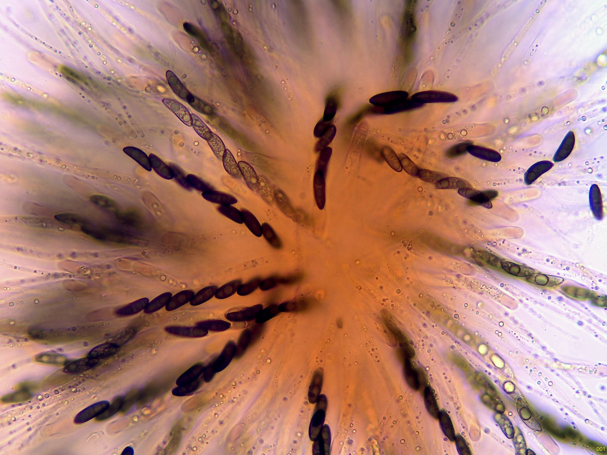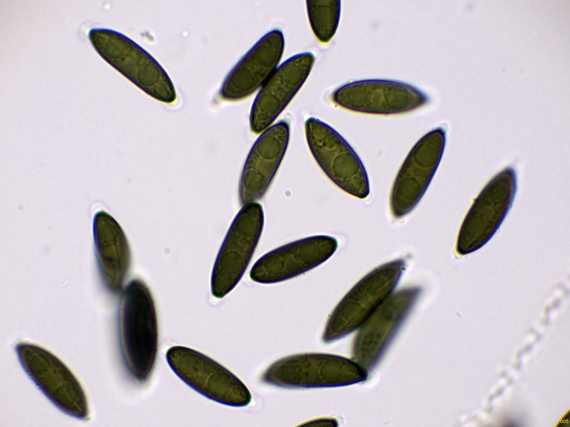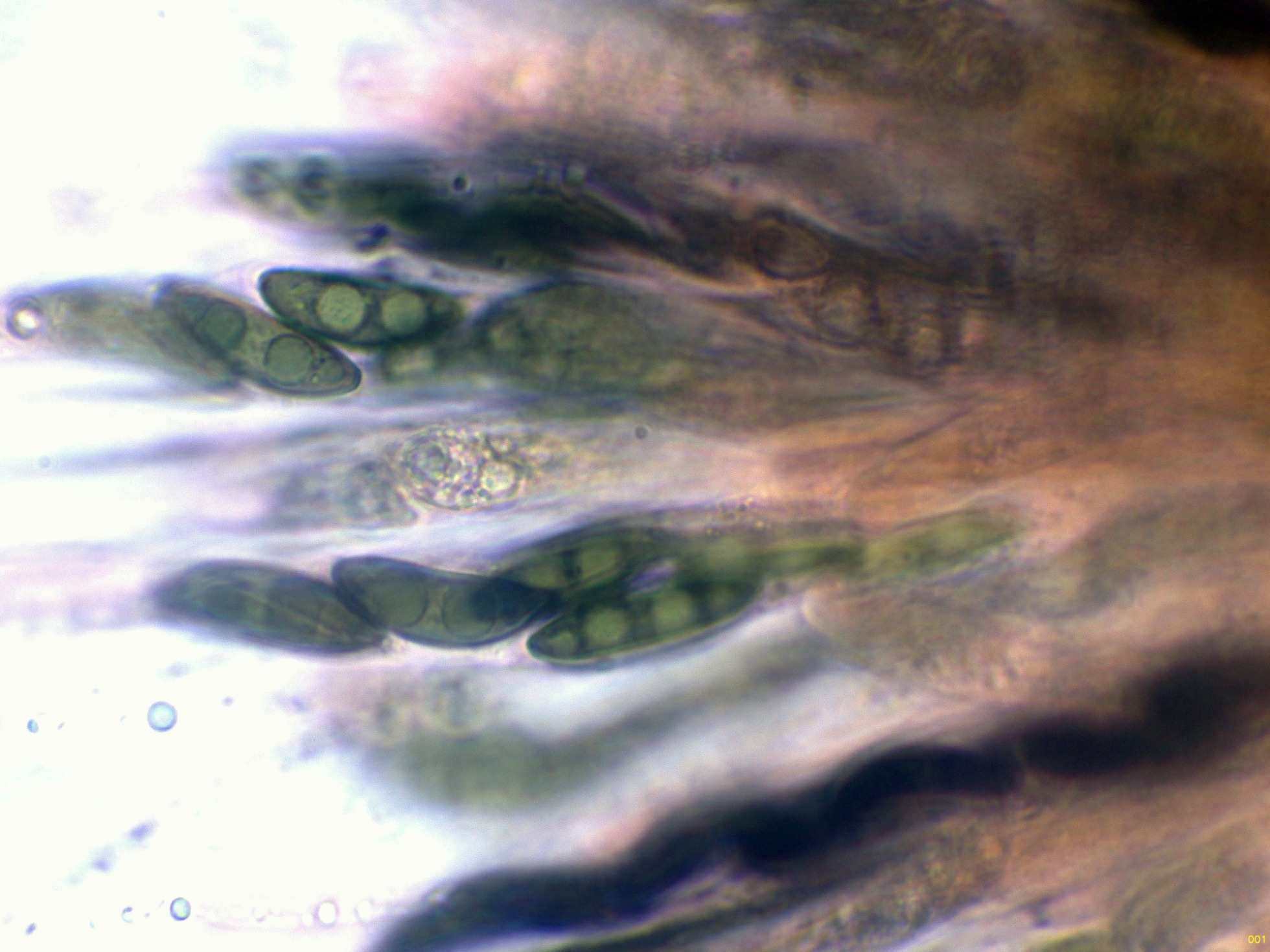 Ascosporas inequilaterales, de color marrón oscuro, con una vaina viscosa que envuelve toda la espora, esta vaina más visible en los polos.