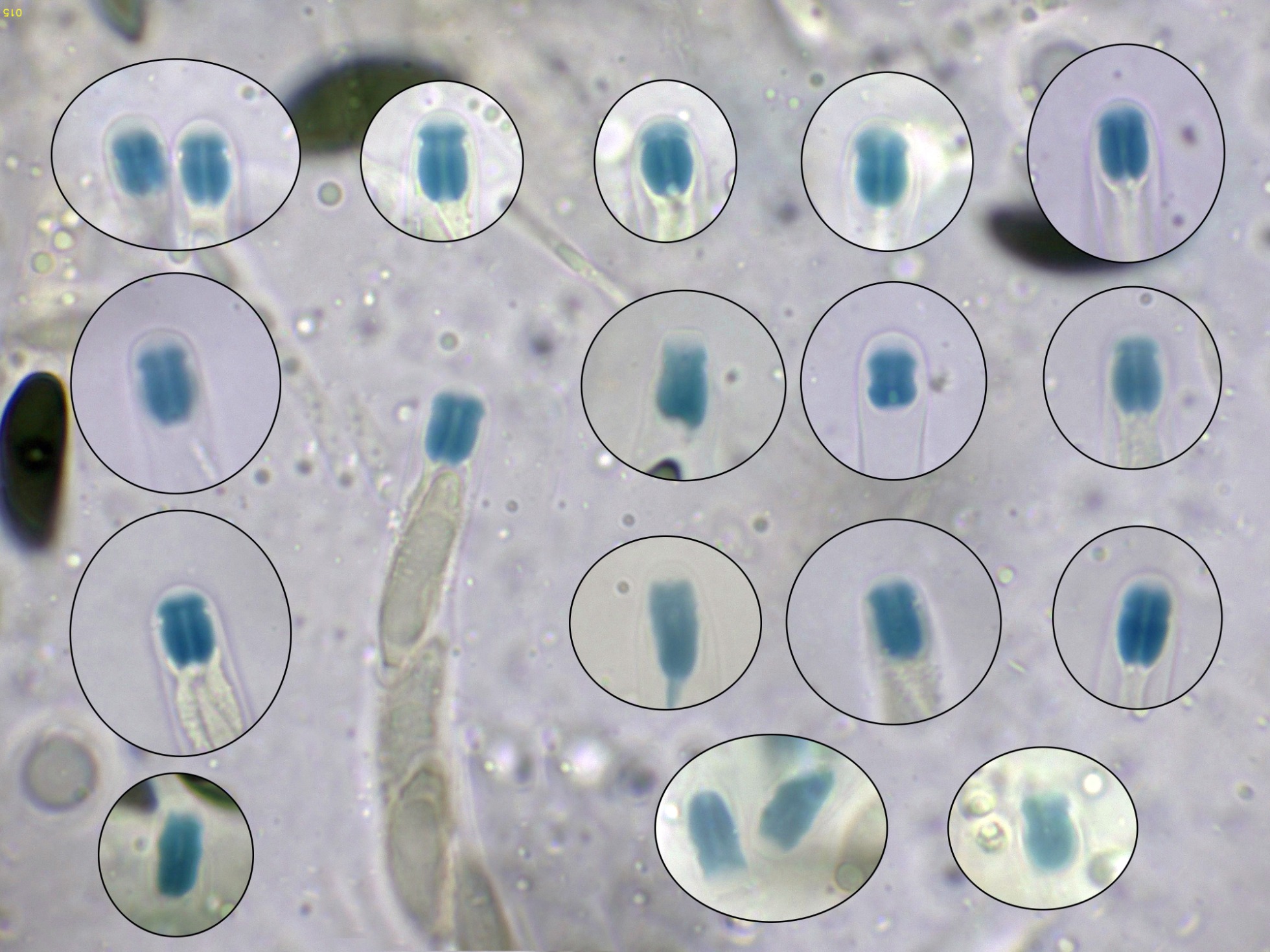 Aparato apical en Reactivo de Melzer, este aparato apical con unas medidas de (7.2) 8.1 - 9.6 (10.6) × (4.5) 4.8 - 5.8 (6) µm.