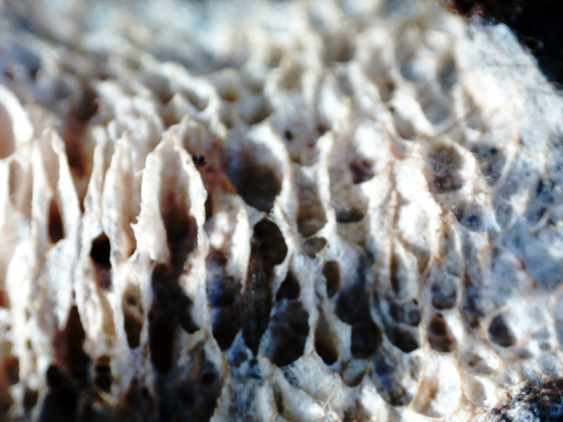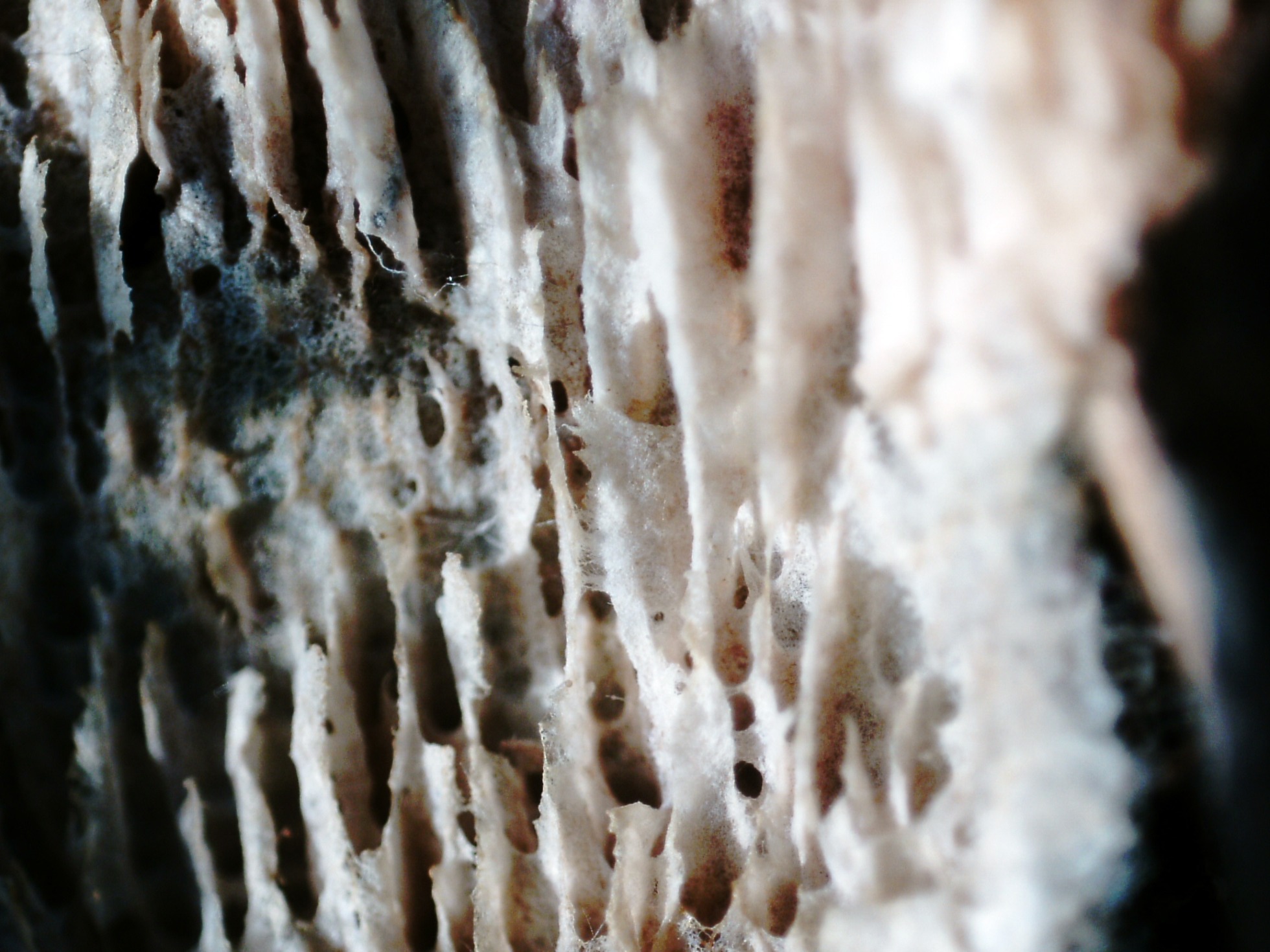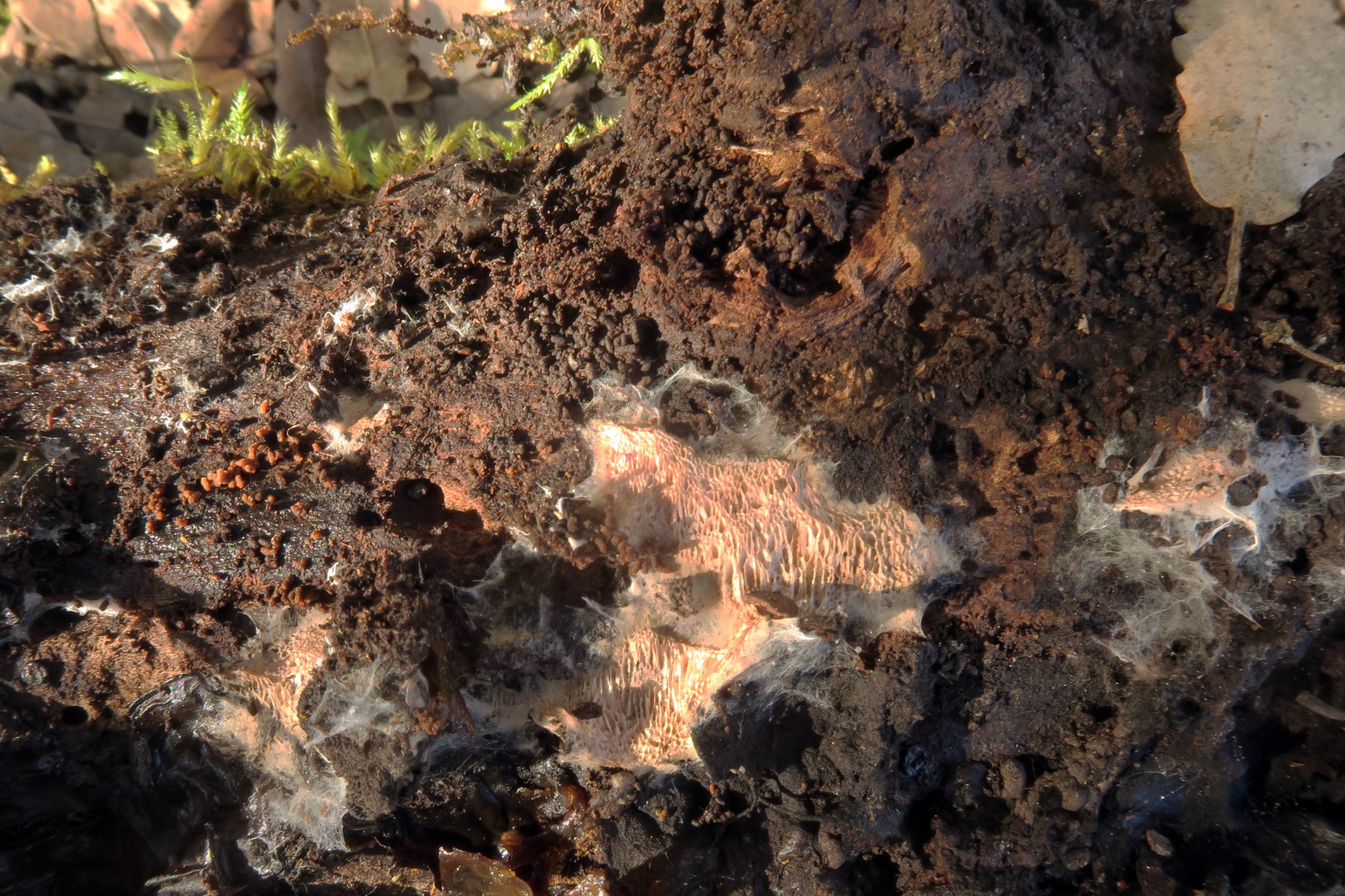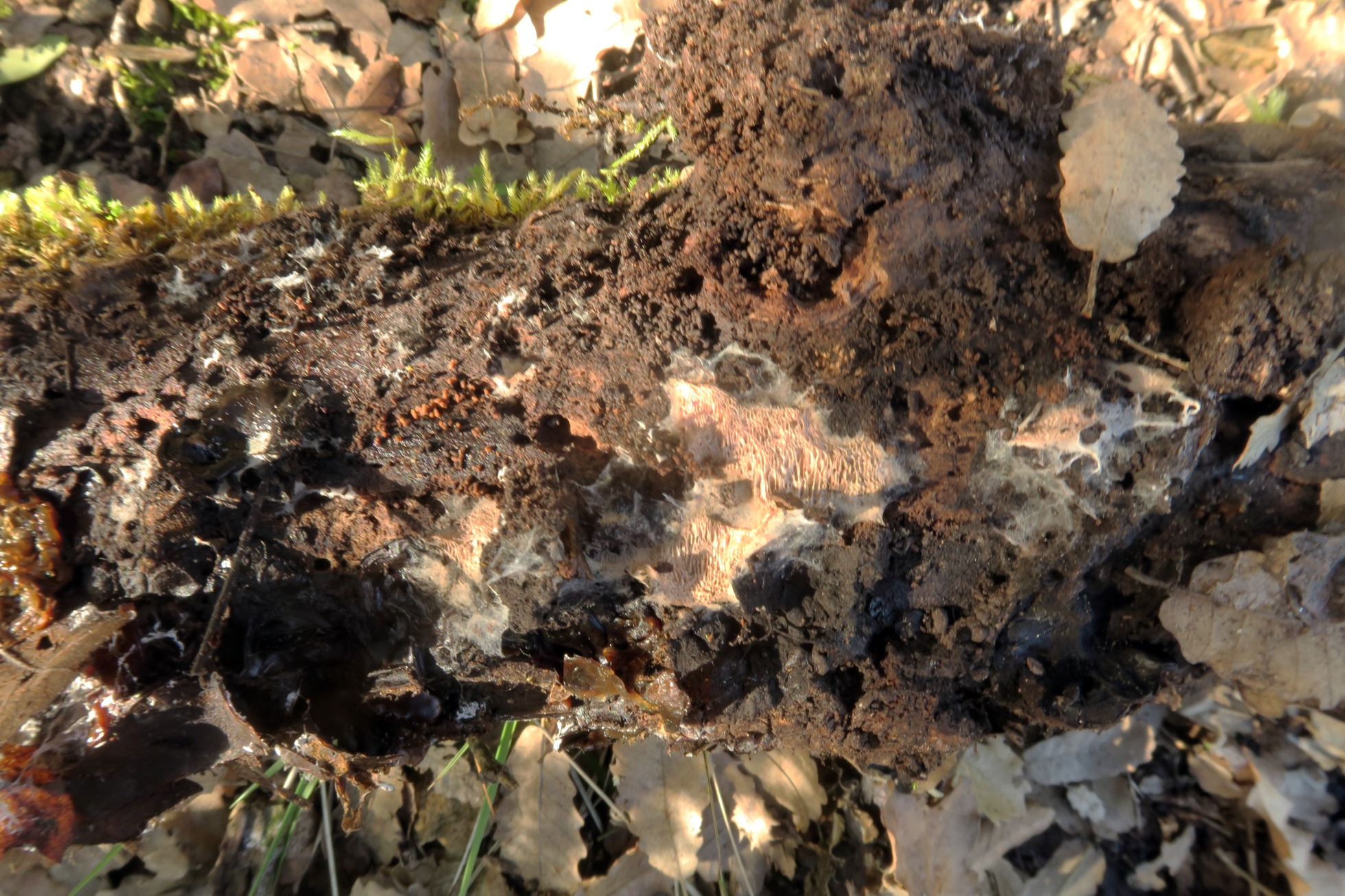 Un Corticial del 30 de marzo, con aspecto de poros desgarrados y textura filamentosa, apareciendo sobre la superficie de un tronco por la parte que está en contacto con el suelo.