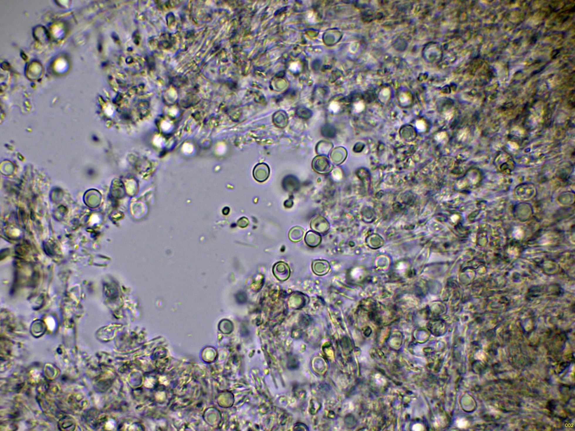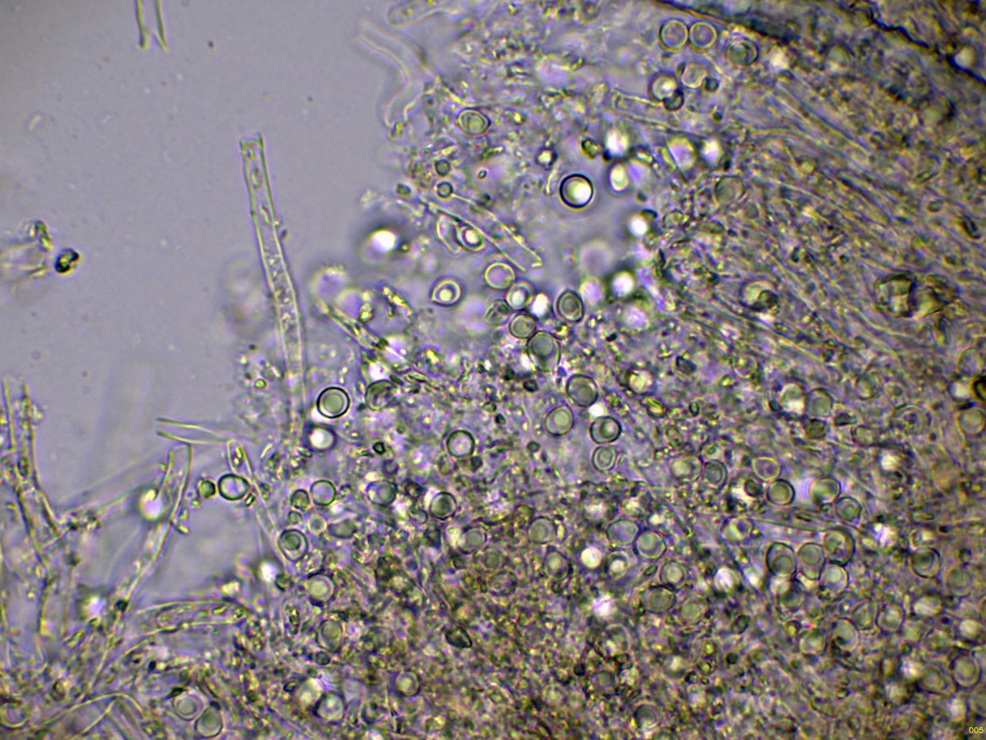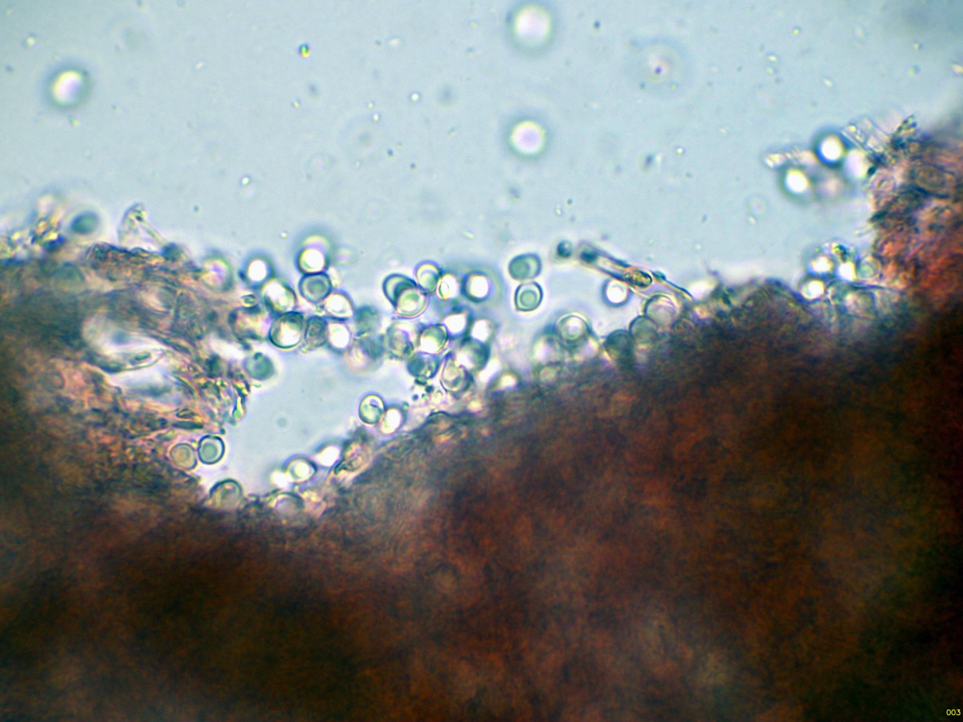 Observaciones: Como que el basidioma ya estaba muerto, no pude observar con claridad todos los elementos que confirmarían la especie, la determinación se ha hecho en base al aspecto del basidioma, a su sistema hifal monomítico y sin fíbulas, y especialmente a la morfología y medidas esporales, que por este último dato ya me conducen a Physisporinus. Los datos obtenidos coinciden perfectamente con los del trabajo de mi maestro y mejor amigo Enrique Rubio, dejo el enlace: