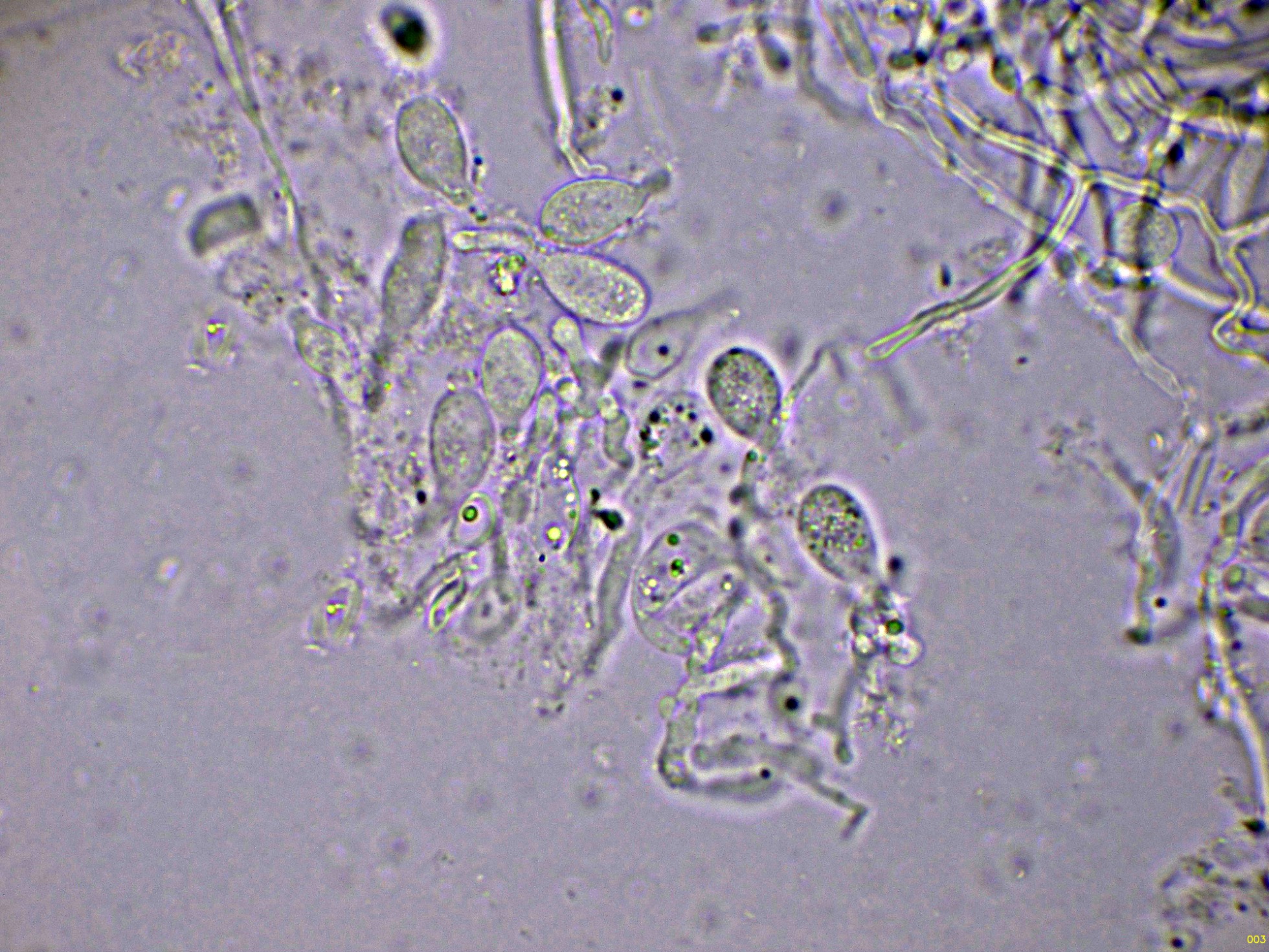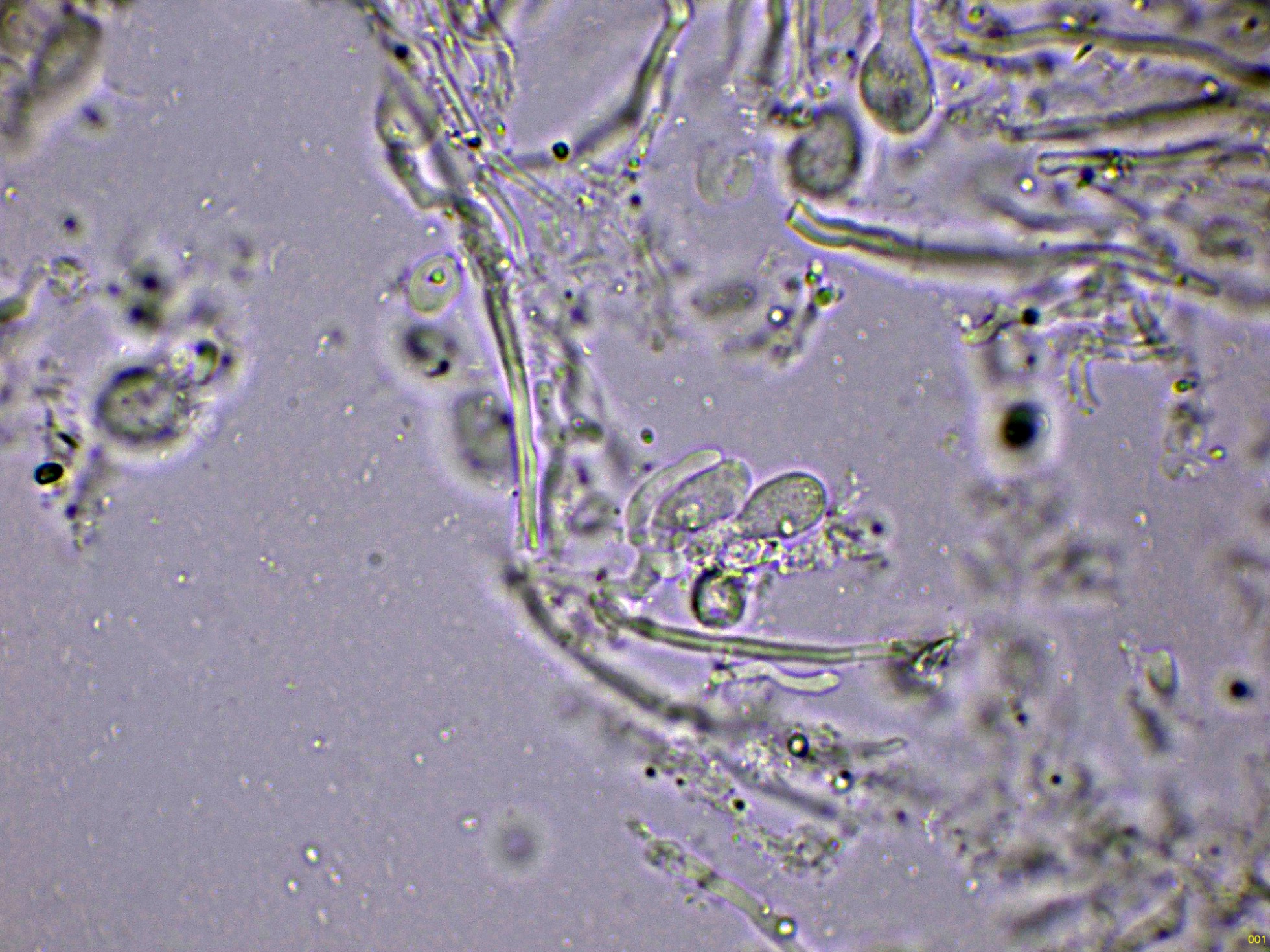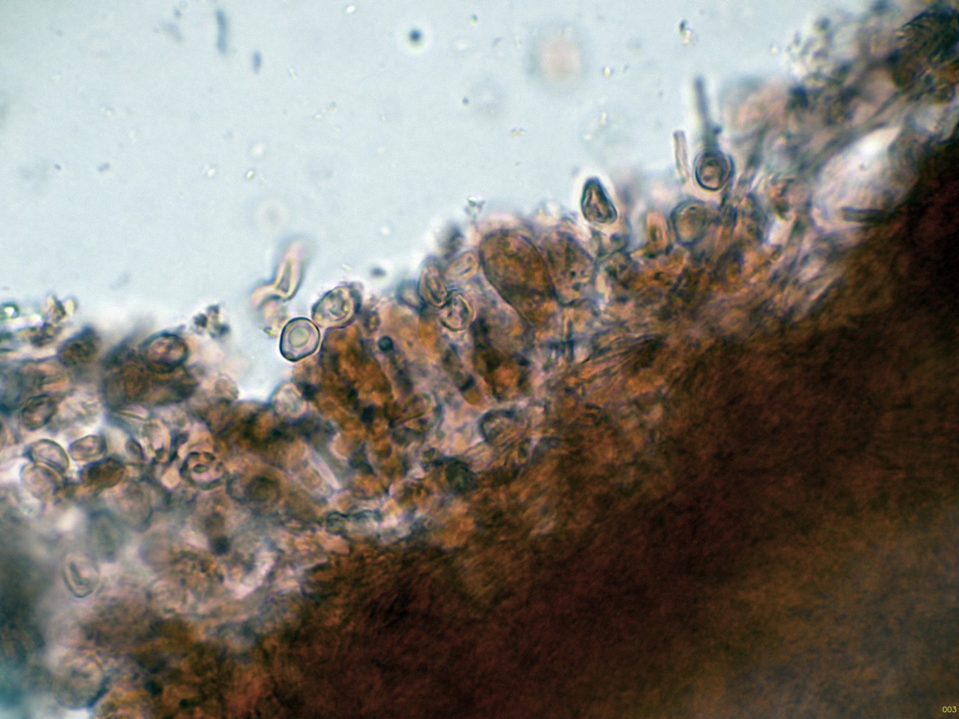 Los basidios en solución de Rojo Congo al 0,5%, con unas medidas de (13.4) 13.5 - 19.4 (19.5) × (6.3) 6.4 - 8.1 (8.4) µm.: