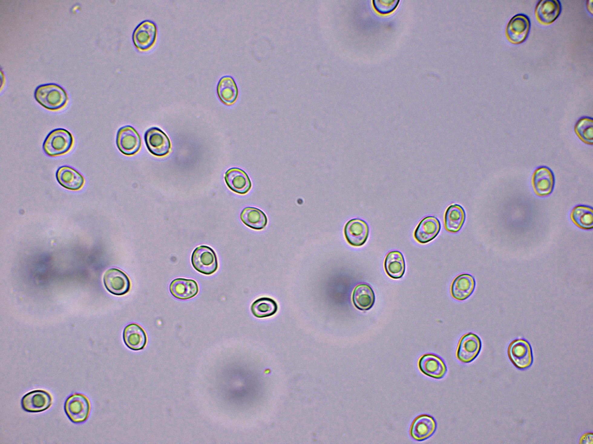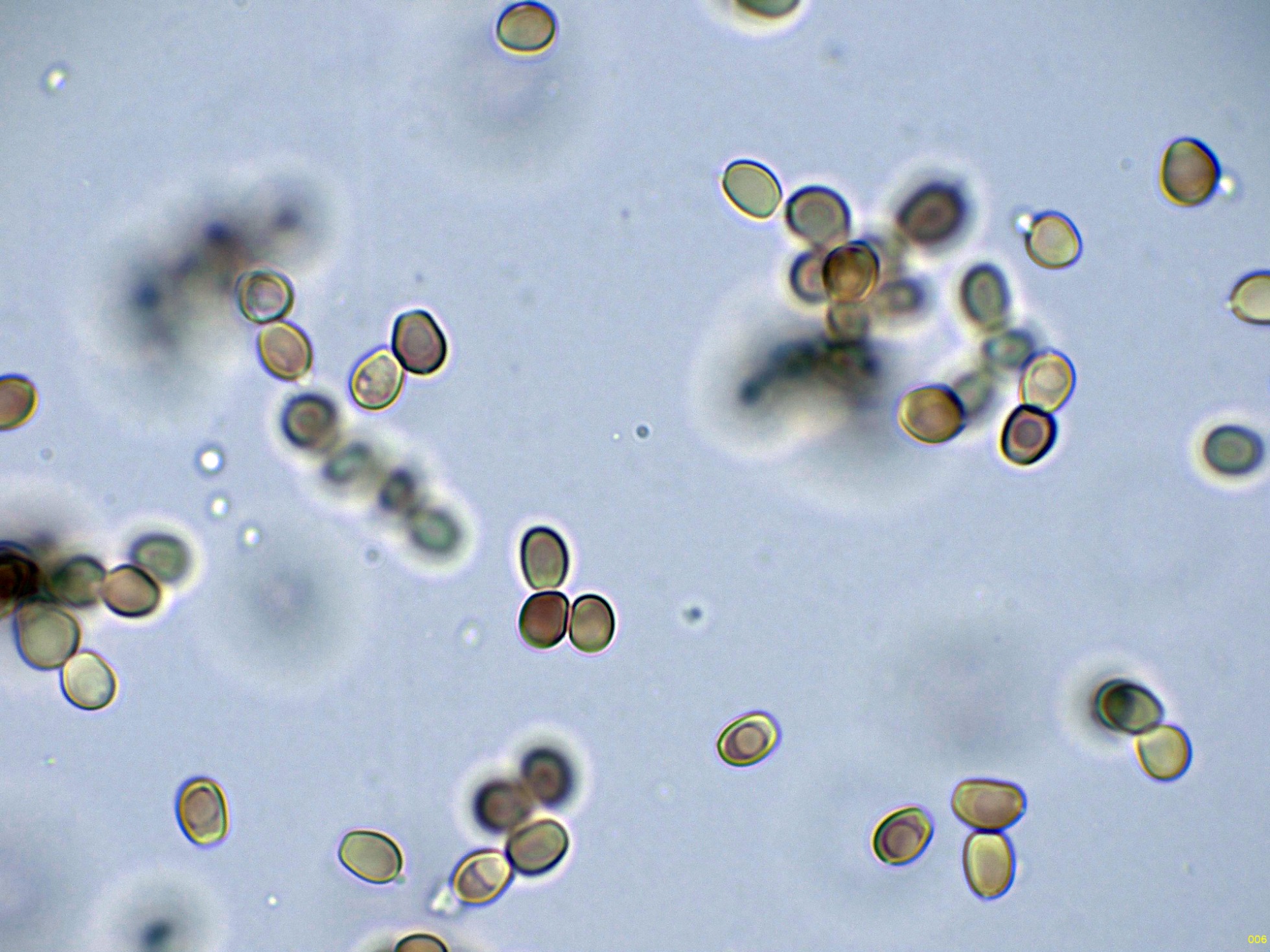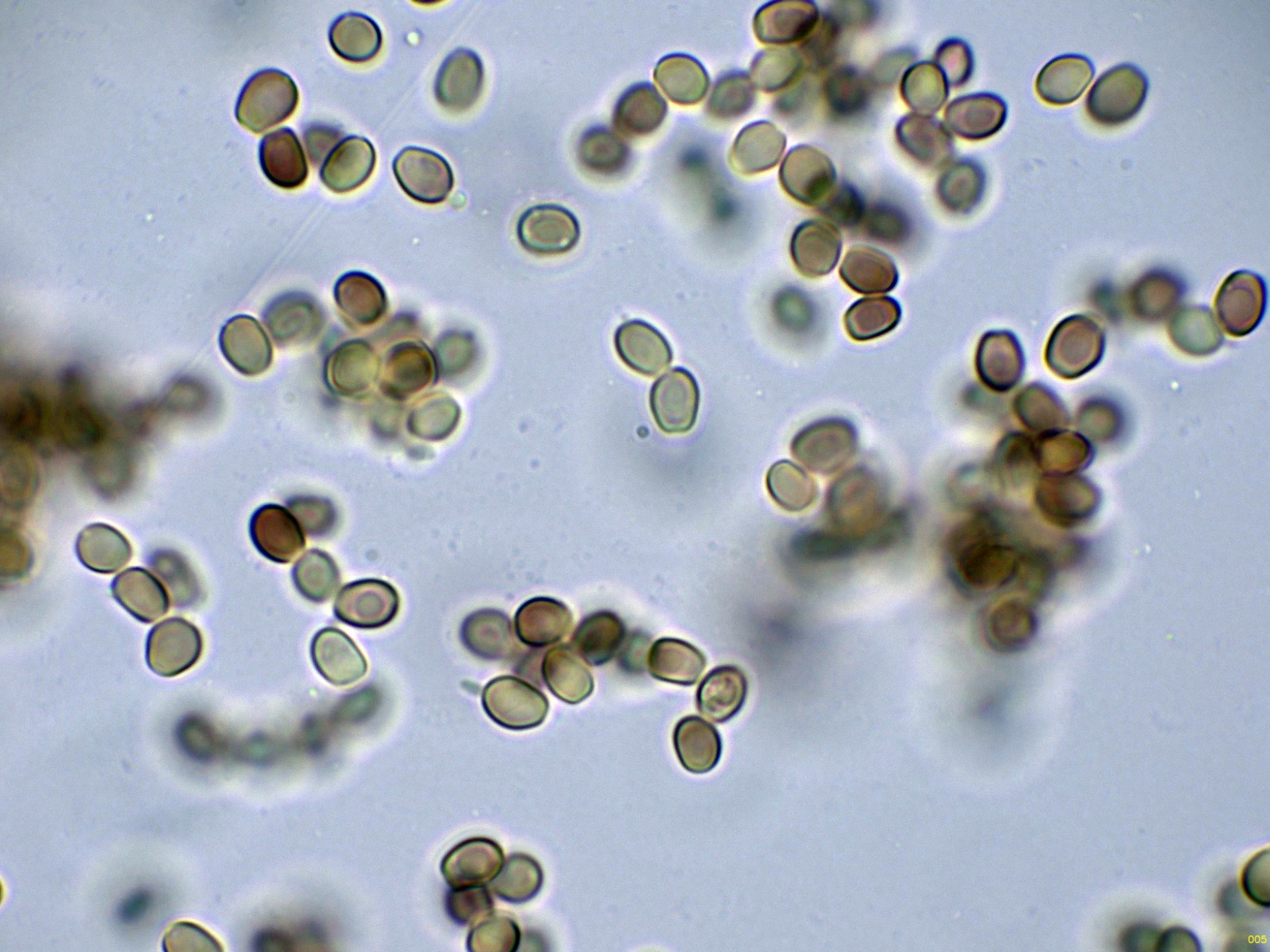 Las esporas en reactivo de Melzer, con reacción dextrinoide: