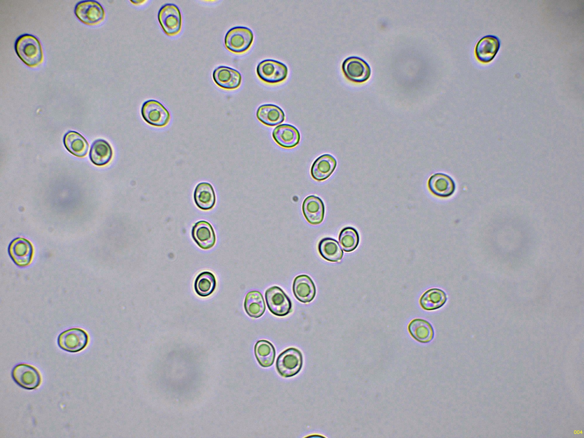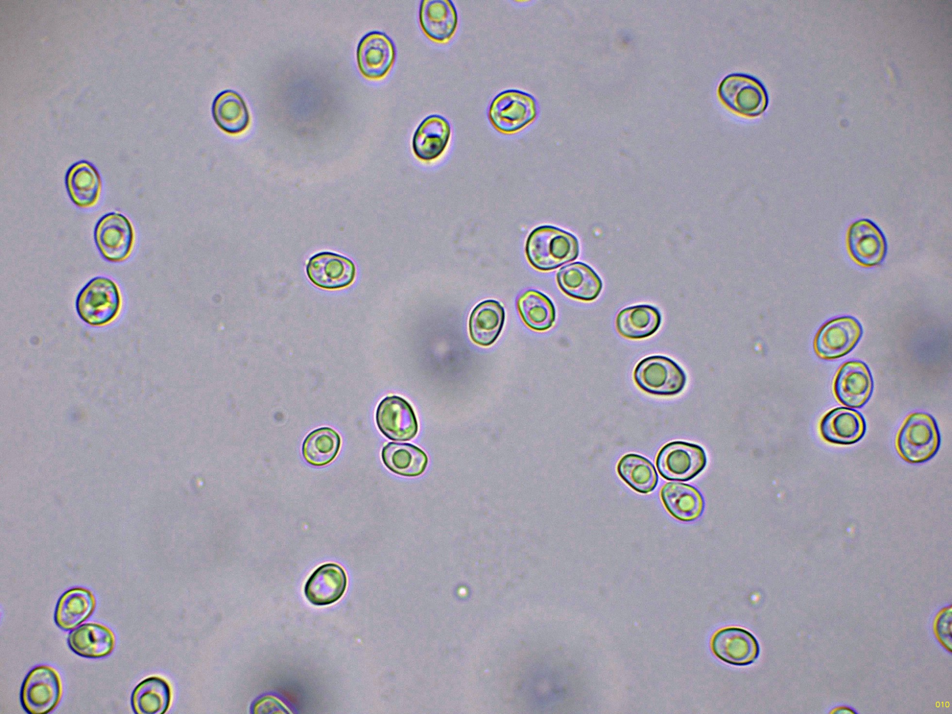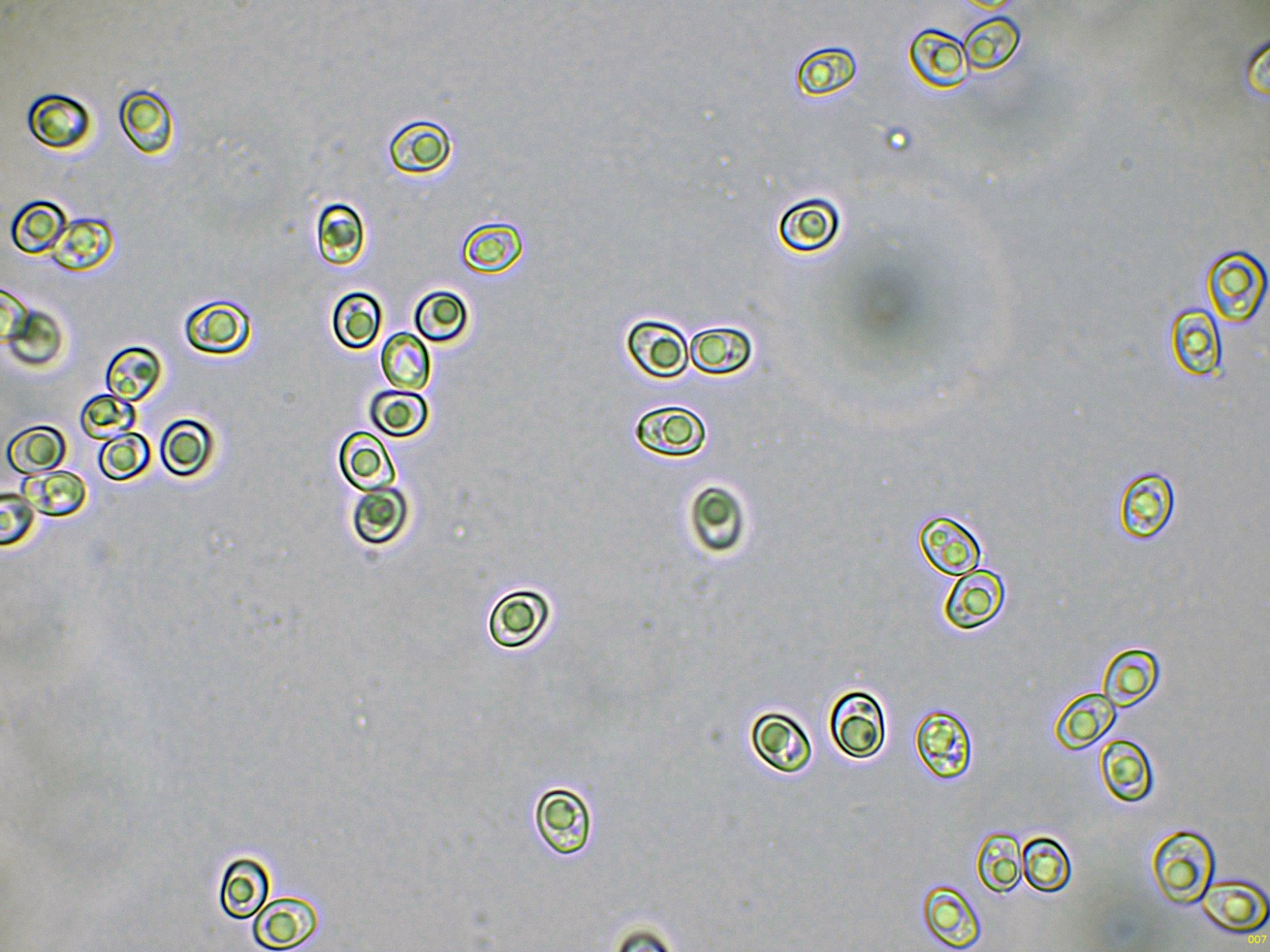 Las esporas en reactivo de Melzer, con reacción dextrinoide: