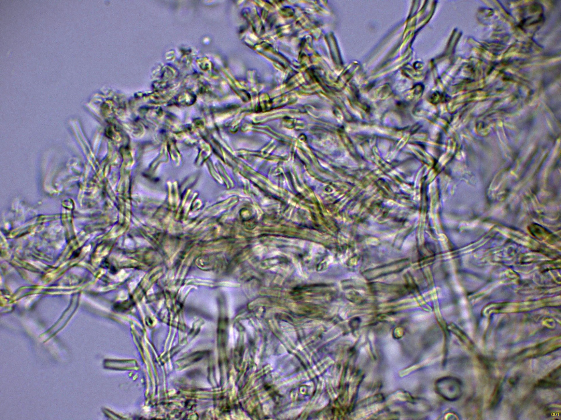 Las hifas en reactivo de Melzer, con sistema hifal dimítico: