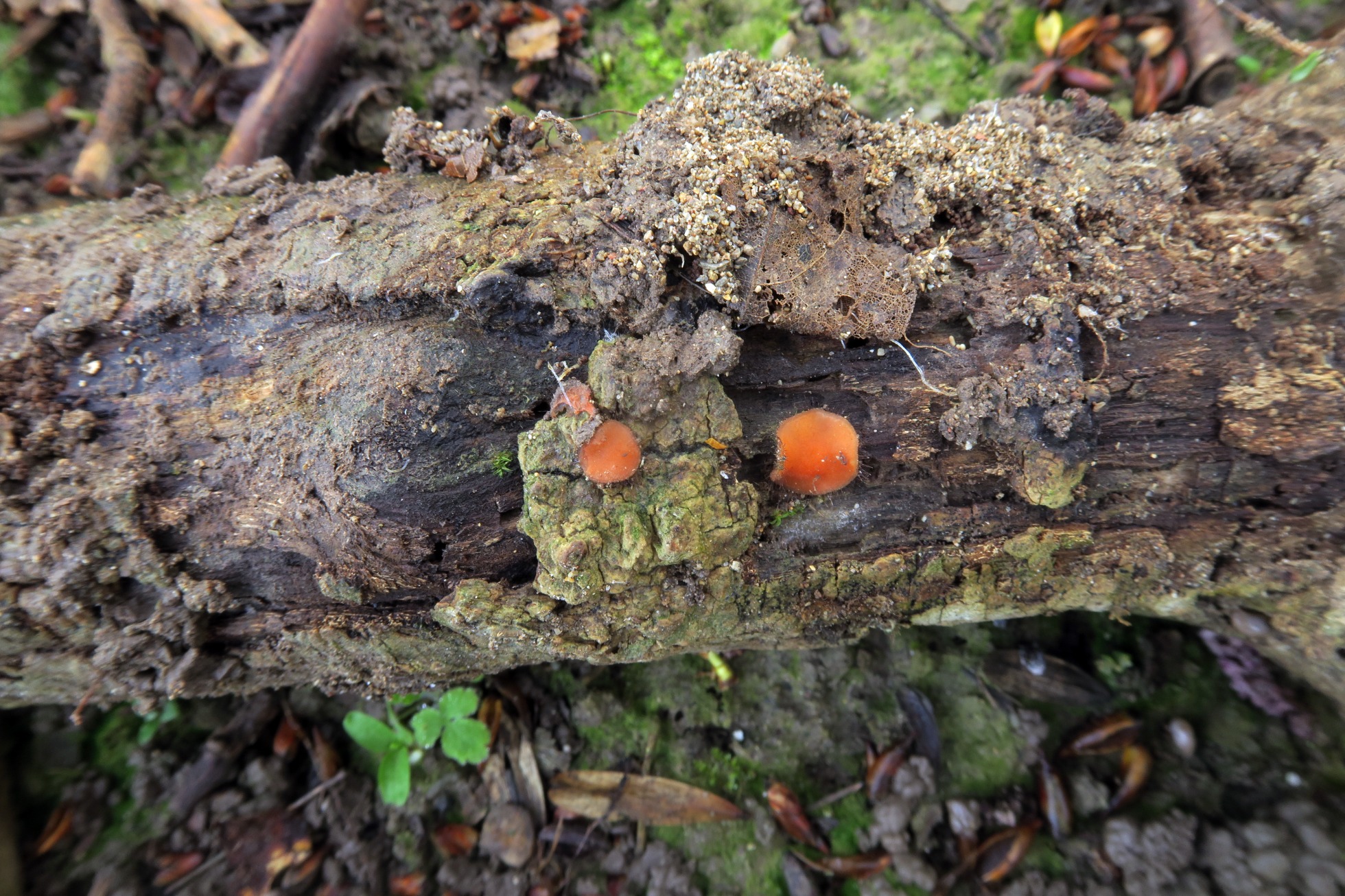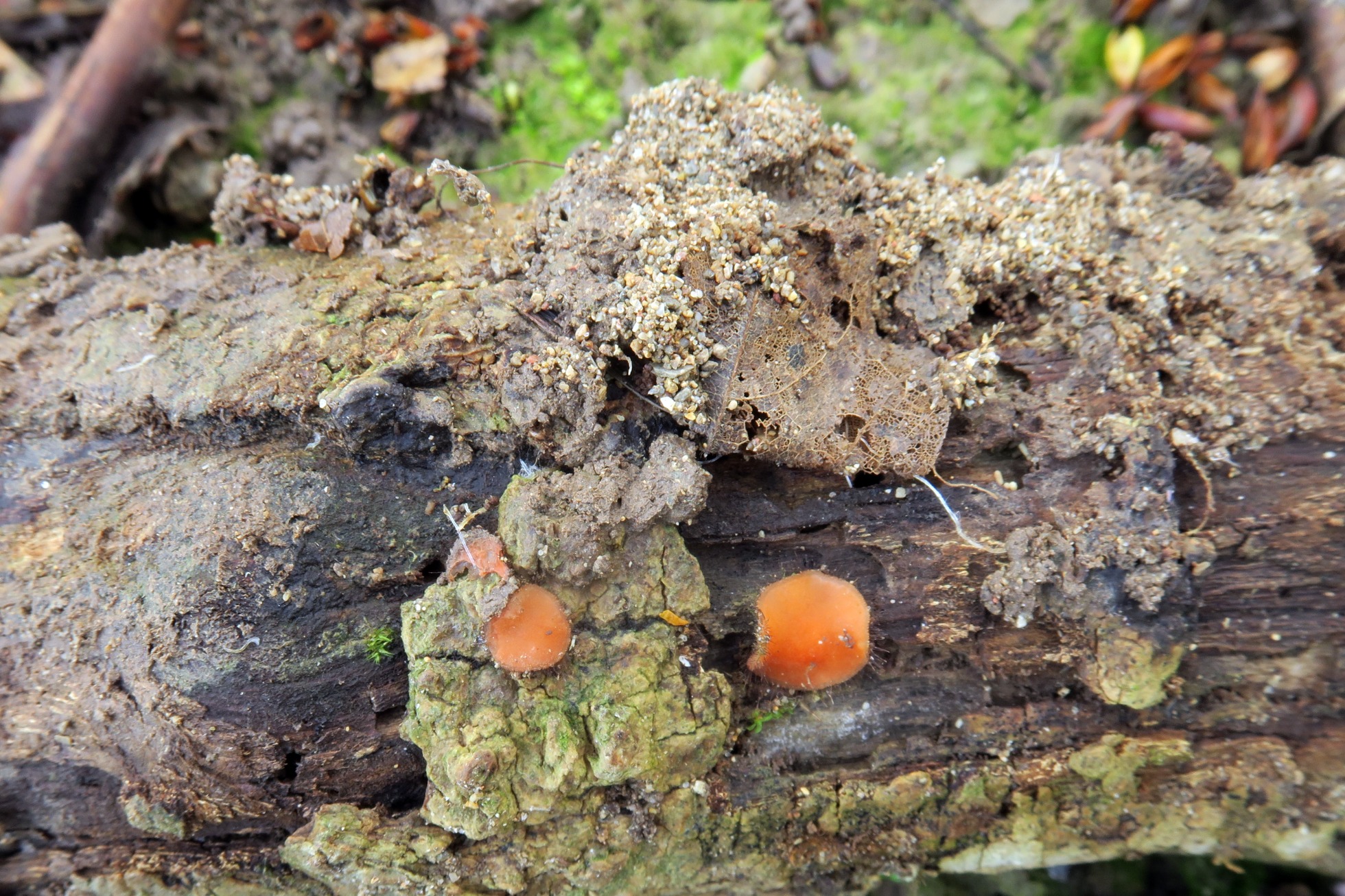 Tres ejemplares de Scutellinia fotografiados el pasado 6 de abril, en soto fluvial, brotando tanto sobre la corteza como sobre la parte descortezada de un tronco tumbado del suelo.