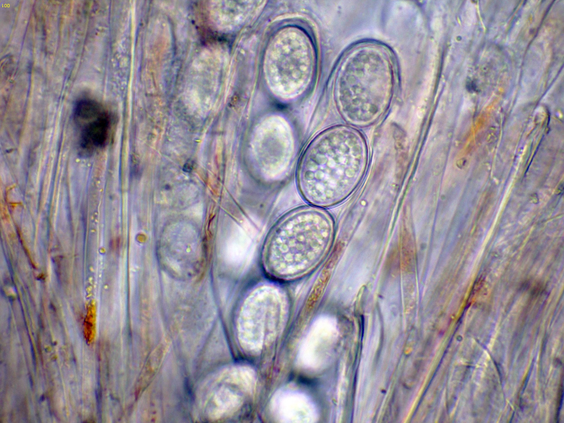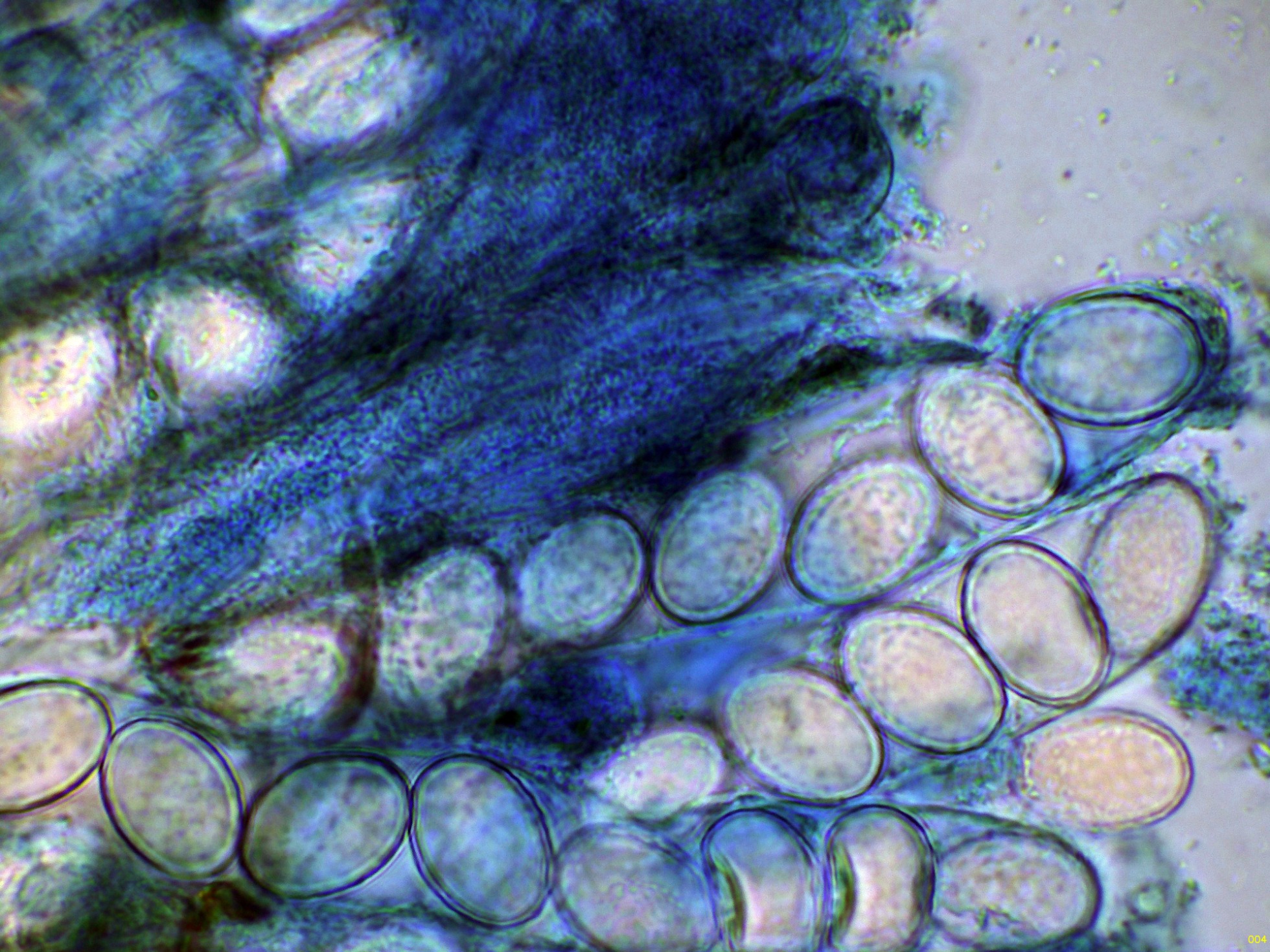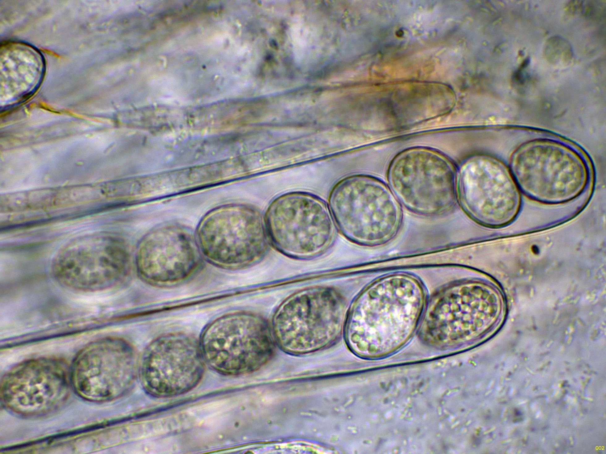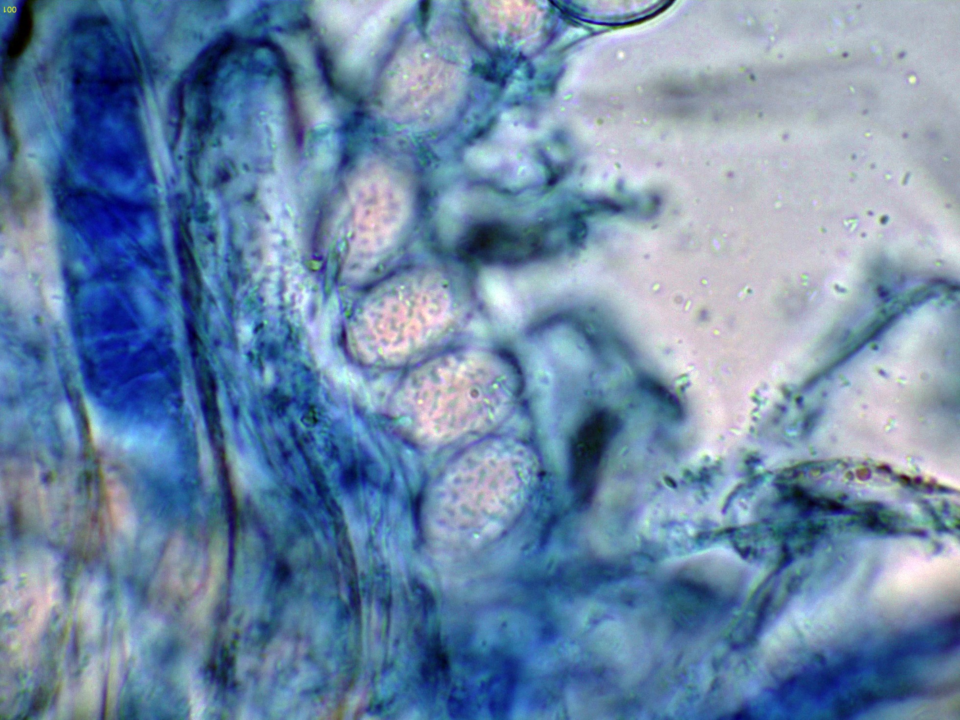 Y por último un par de imágenes de estas esporas dentro del asco, utilizando el Azul de Lactofenol, para poder observar mejor su ornamentación: