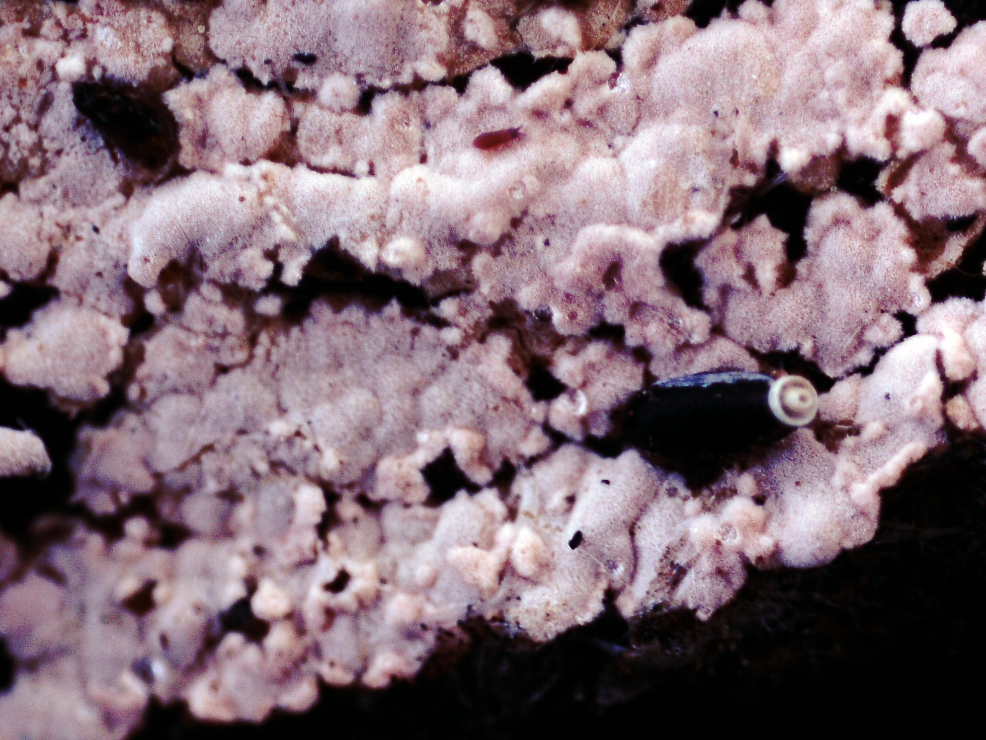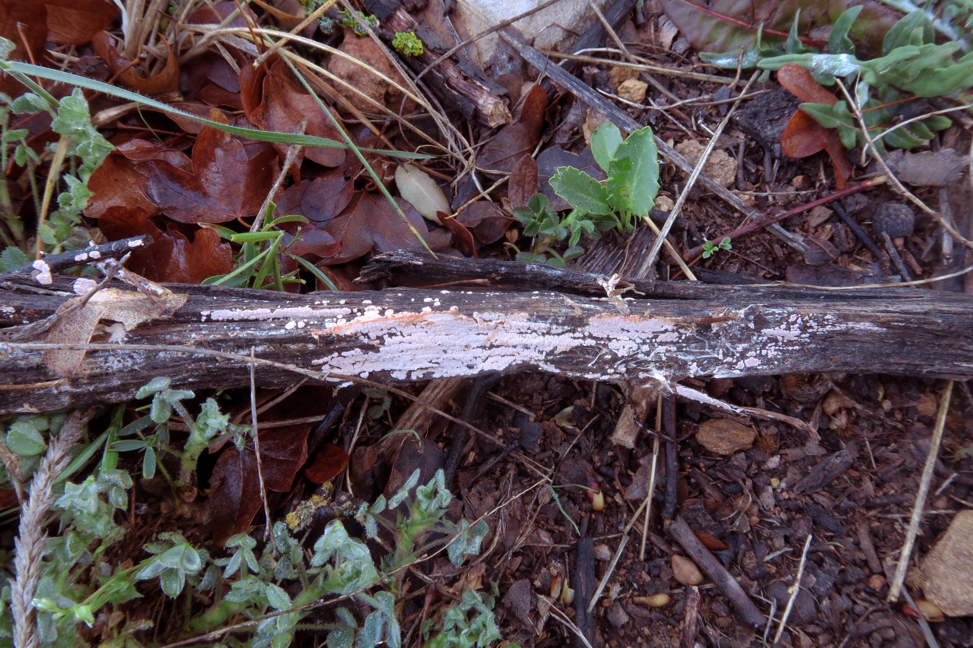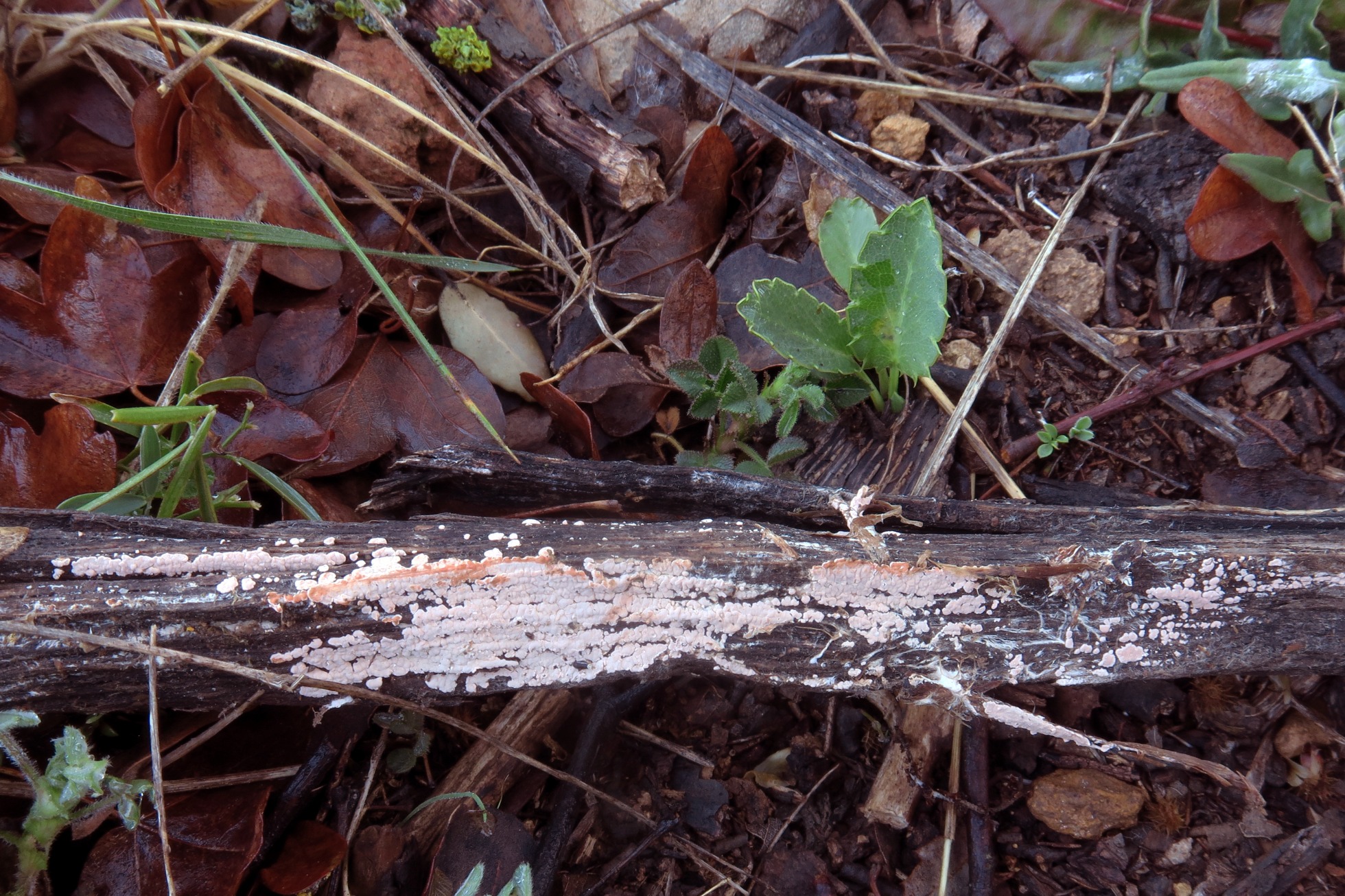 Un Corticial rosado del domingo 13 de abril, brotando sobre un pequeño tronco del suelo de muy probablemente Juniperus sp.