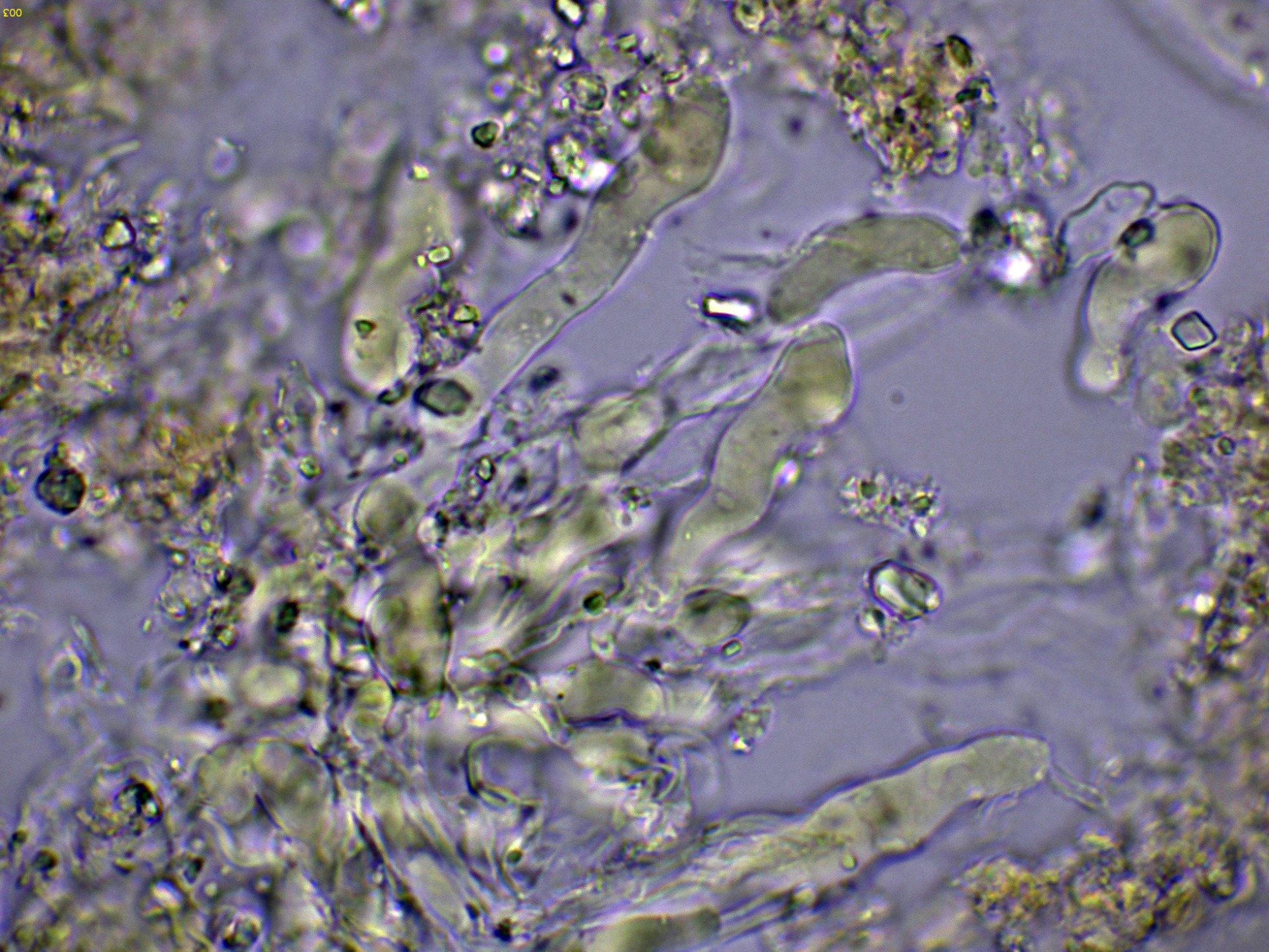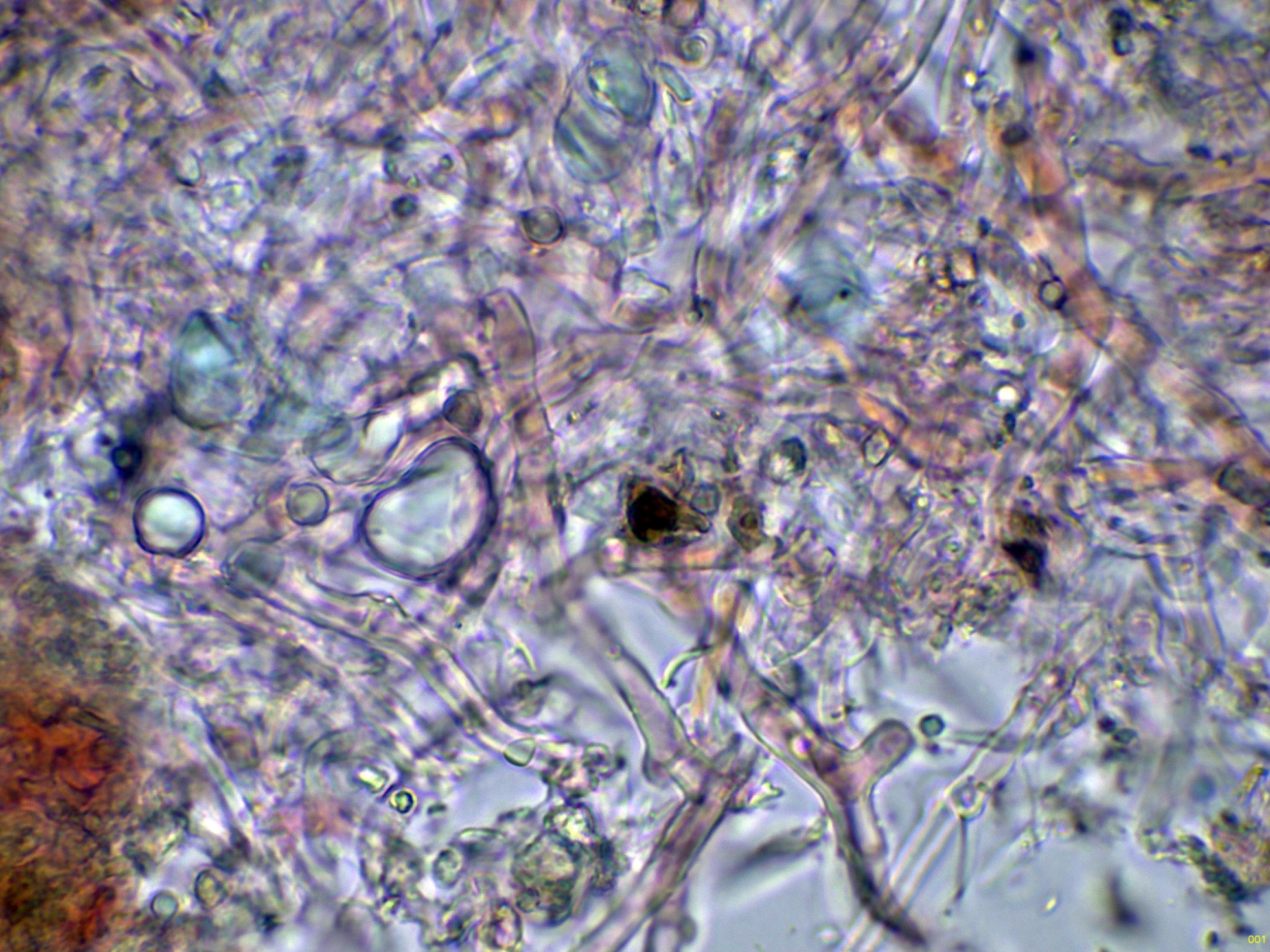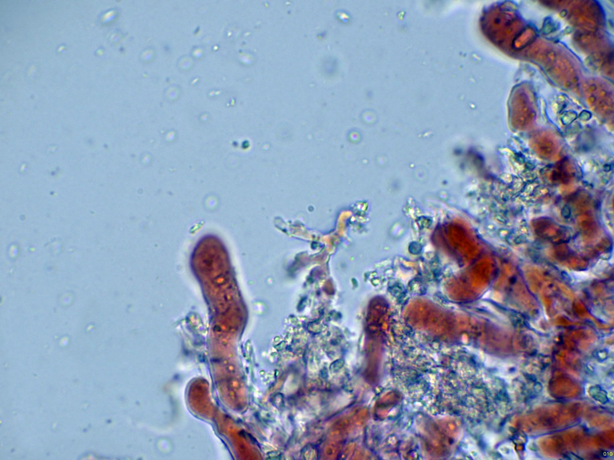 Las fifas subiculares fibuladas que se corresponden con un sistema hifal monomítio, estas hifas con una anchura de entre 2,5 y 4 micras.