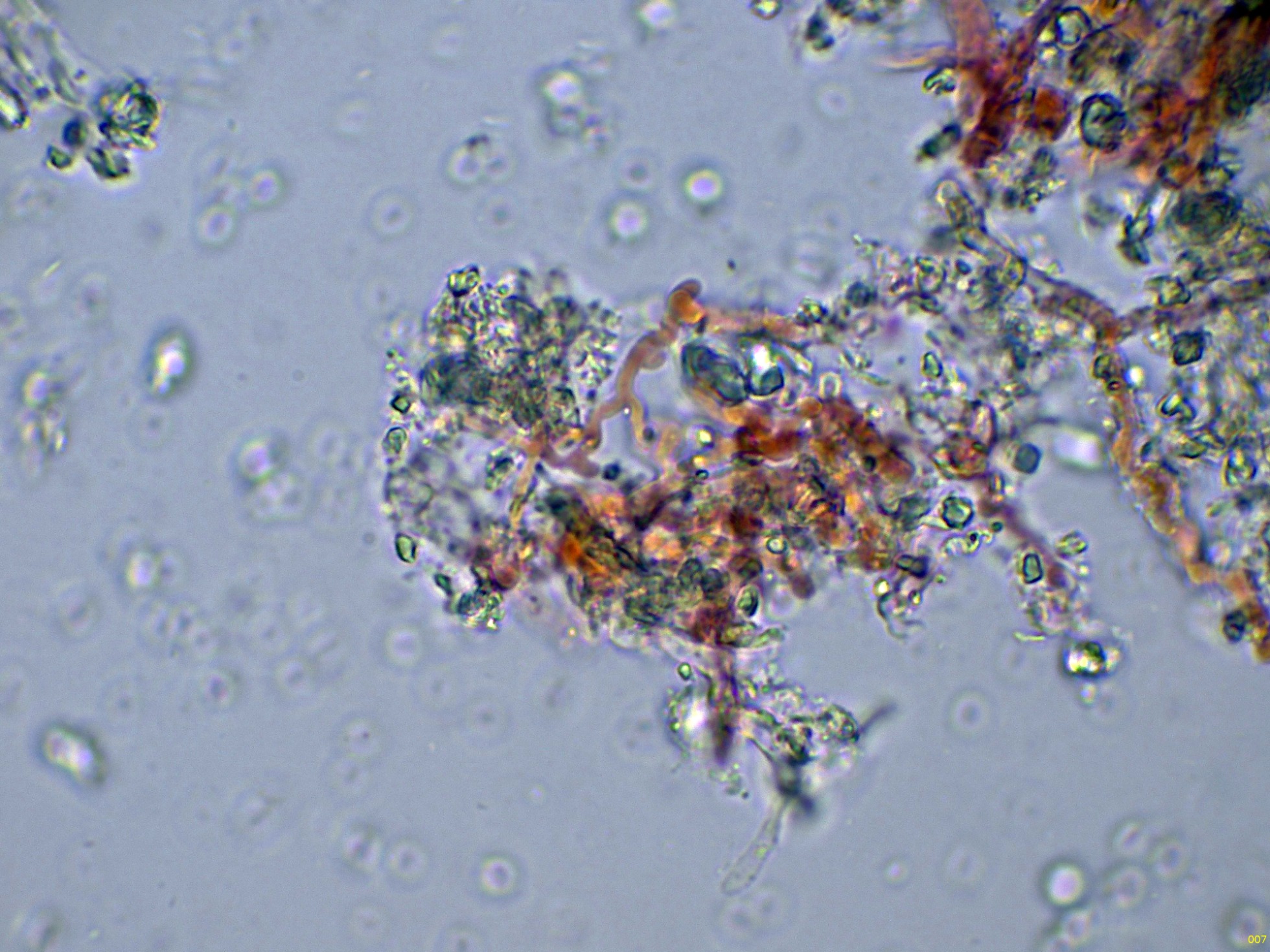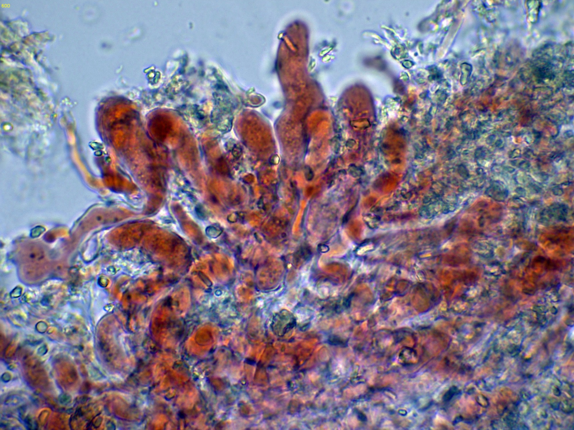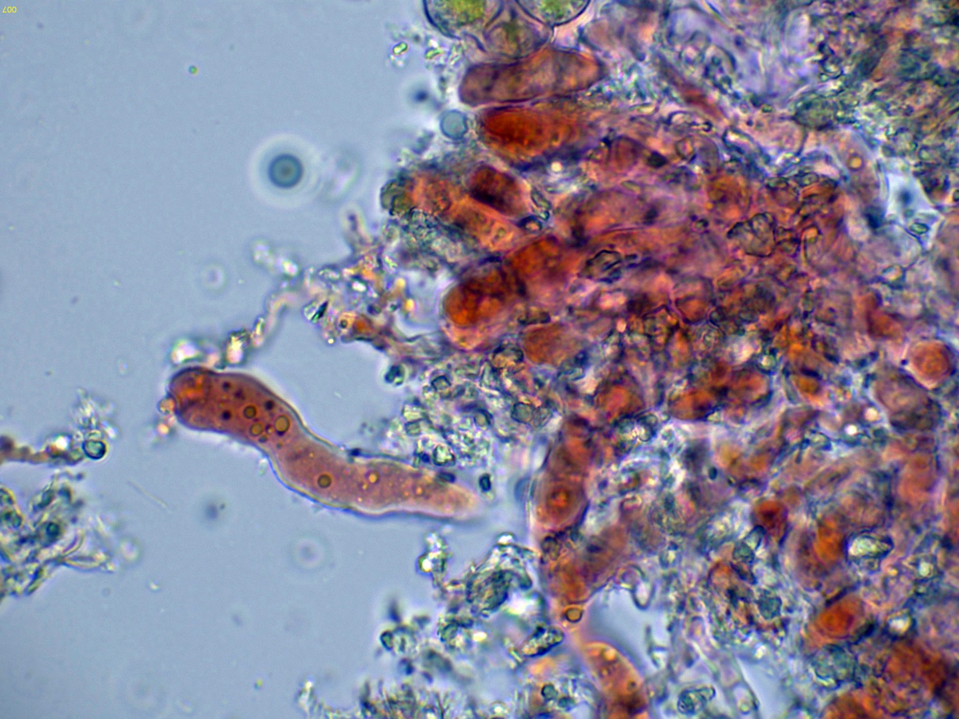 Las fifas subiculares fibuladas que se corresponden con un sistema hifal monomítio, estas hifas con una anchura de entre 2,5 y 4 micras.