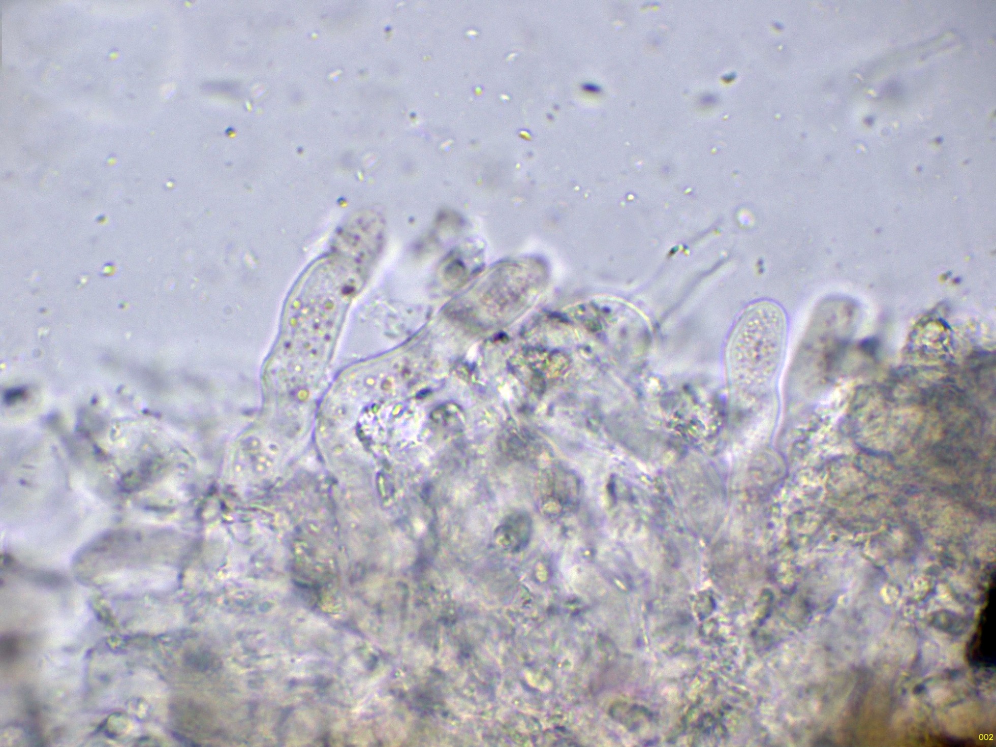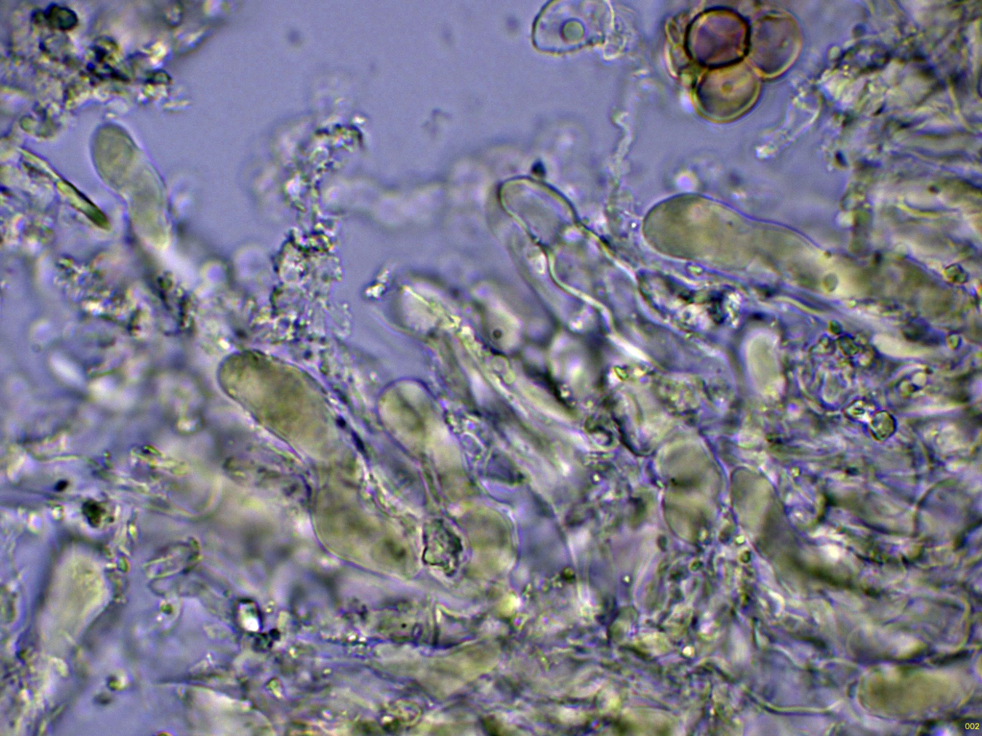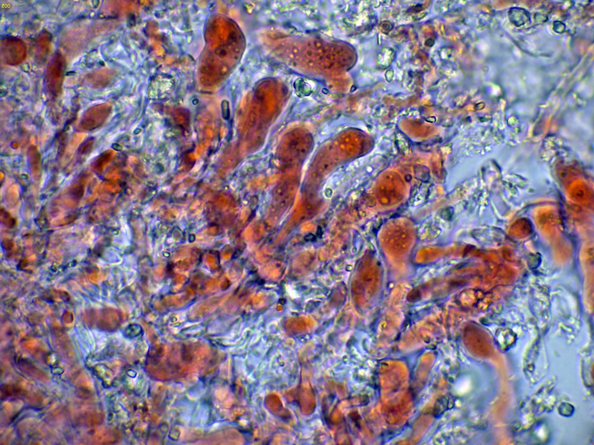 En el himenio solo unos basidios inmaduros de grandes dimensiones (probasidios), estos probasidios con unas medidas de (42.1) 49.5 - 72.6 (78) × (1.4) 6.6 - 10.1 (10.8) µm., aunque según bibliografía pueden llegar a las 90 micras de largo.