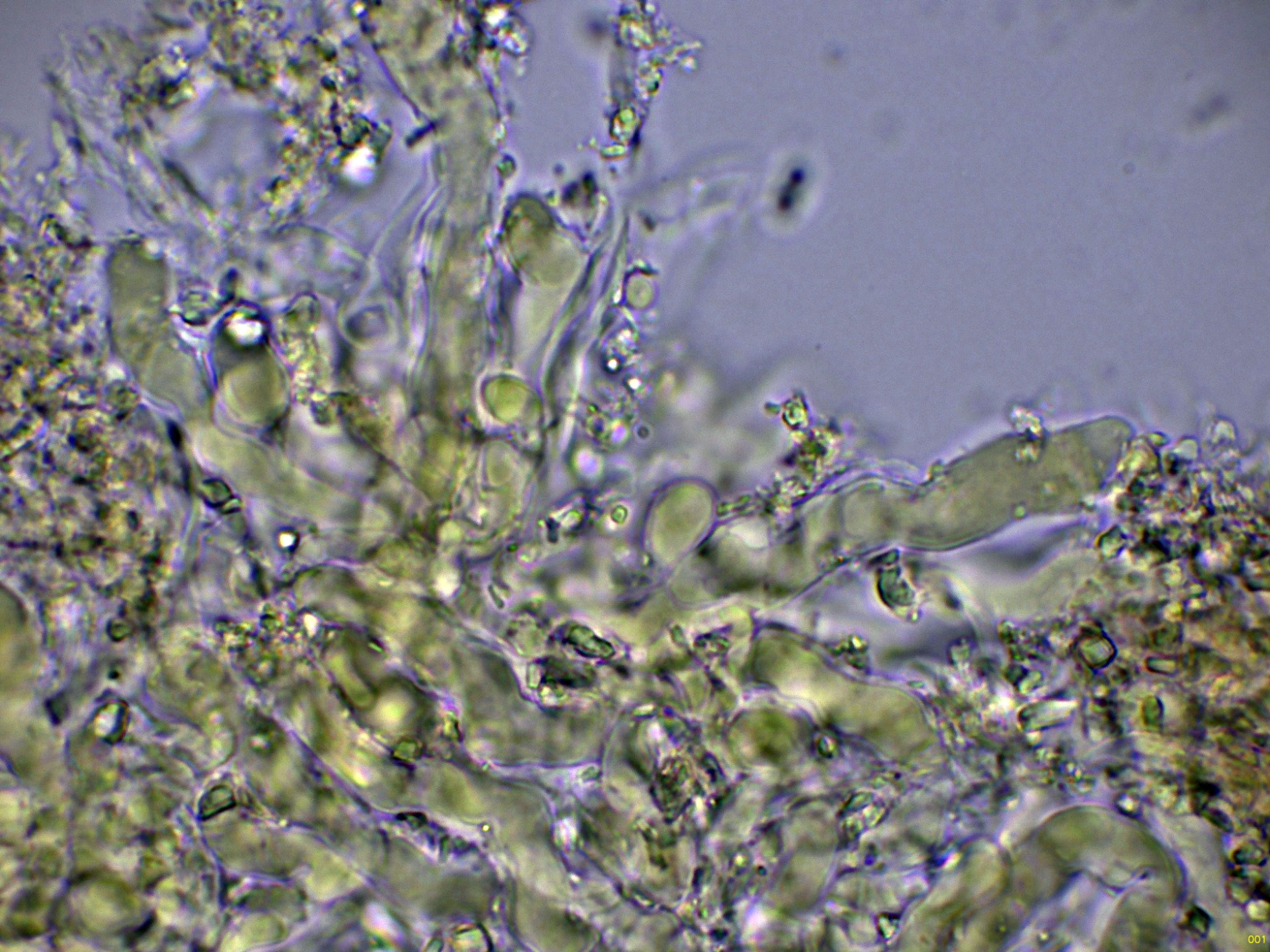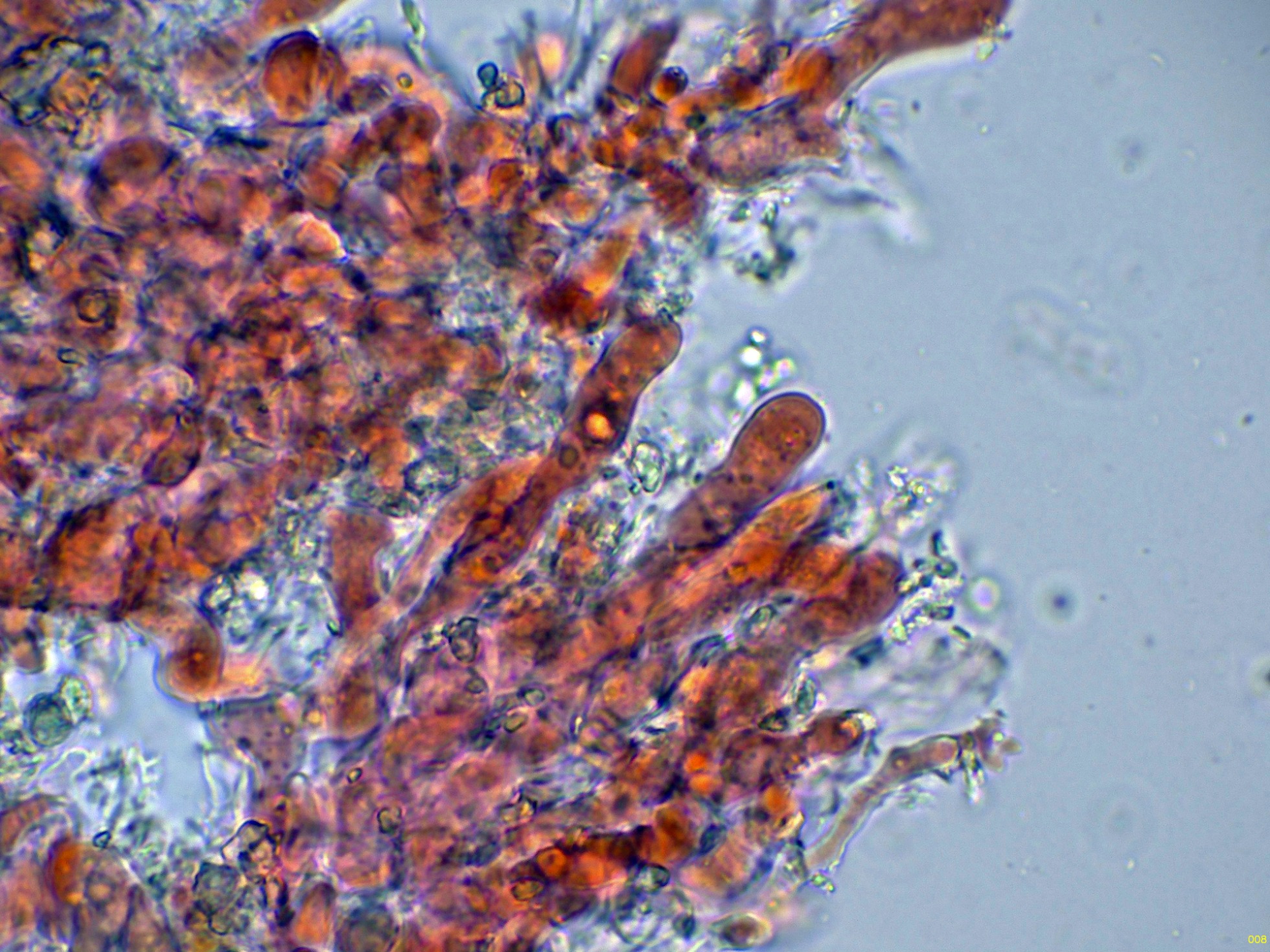Dadas las características de estos basidios, para poder descartar la presencia de gloeocistidios, hice una prueba utilizando la Sulfovainillina.