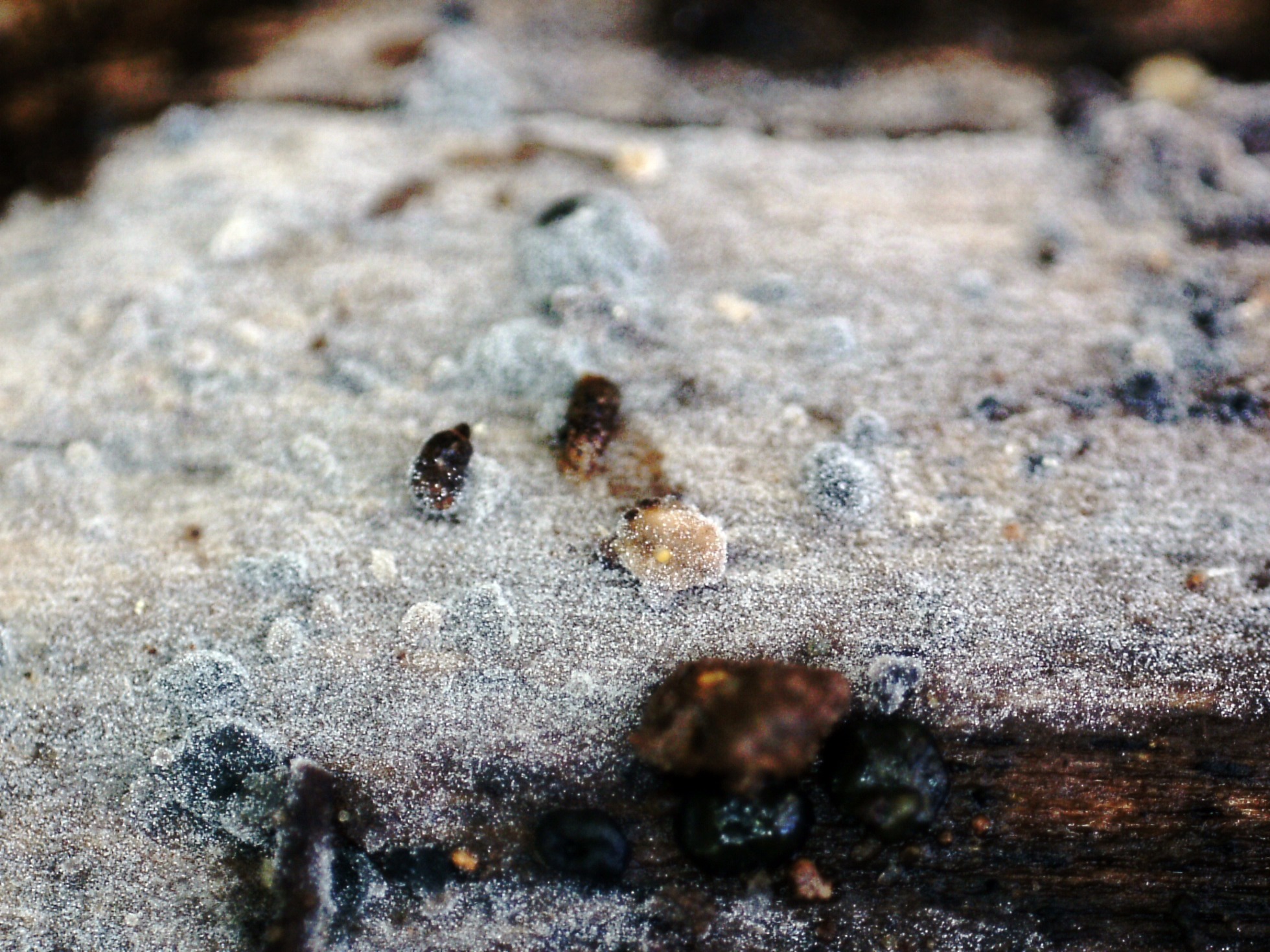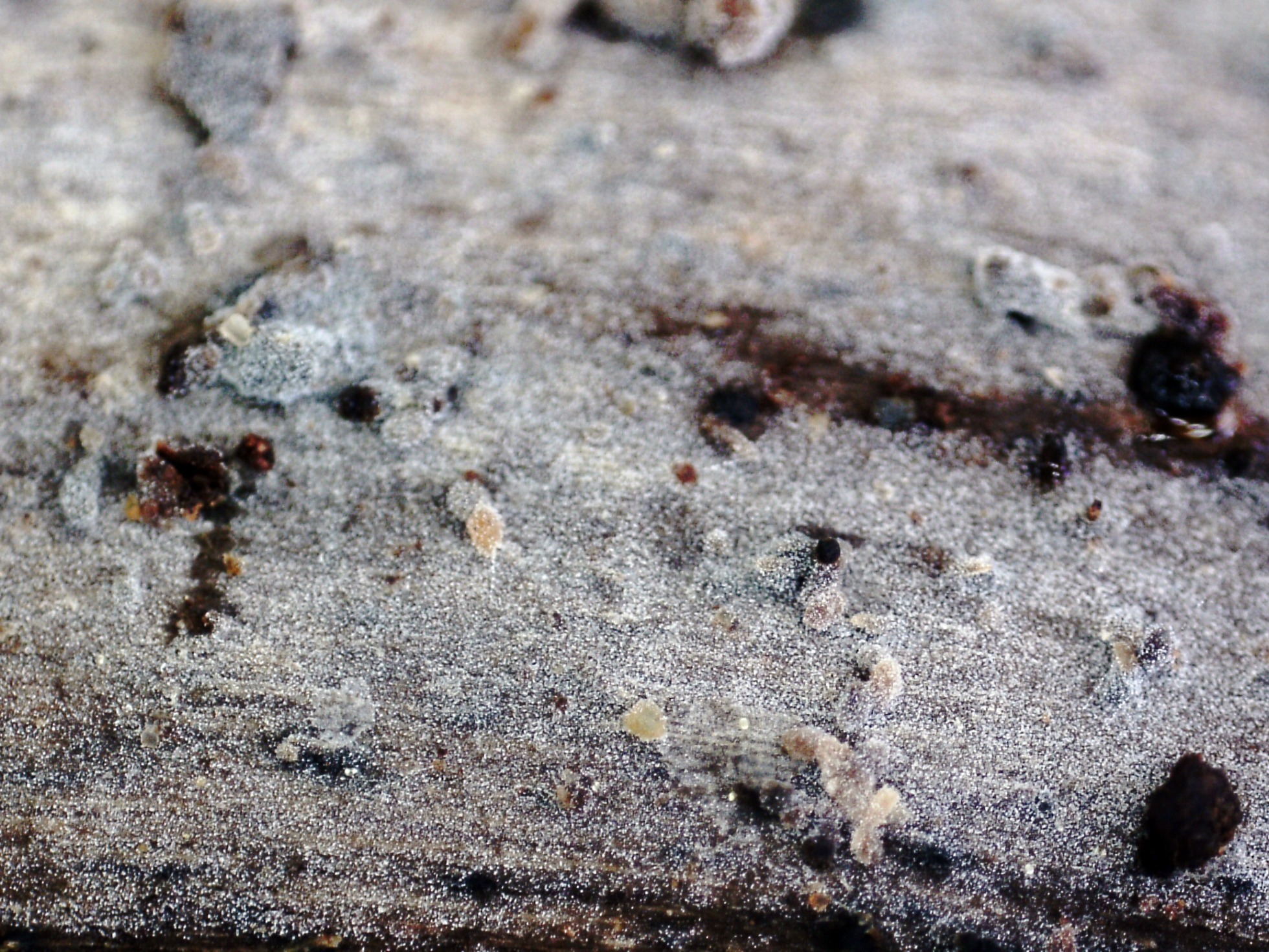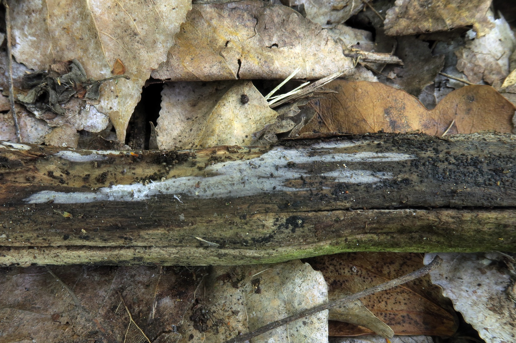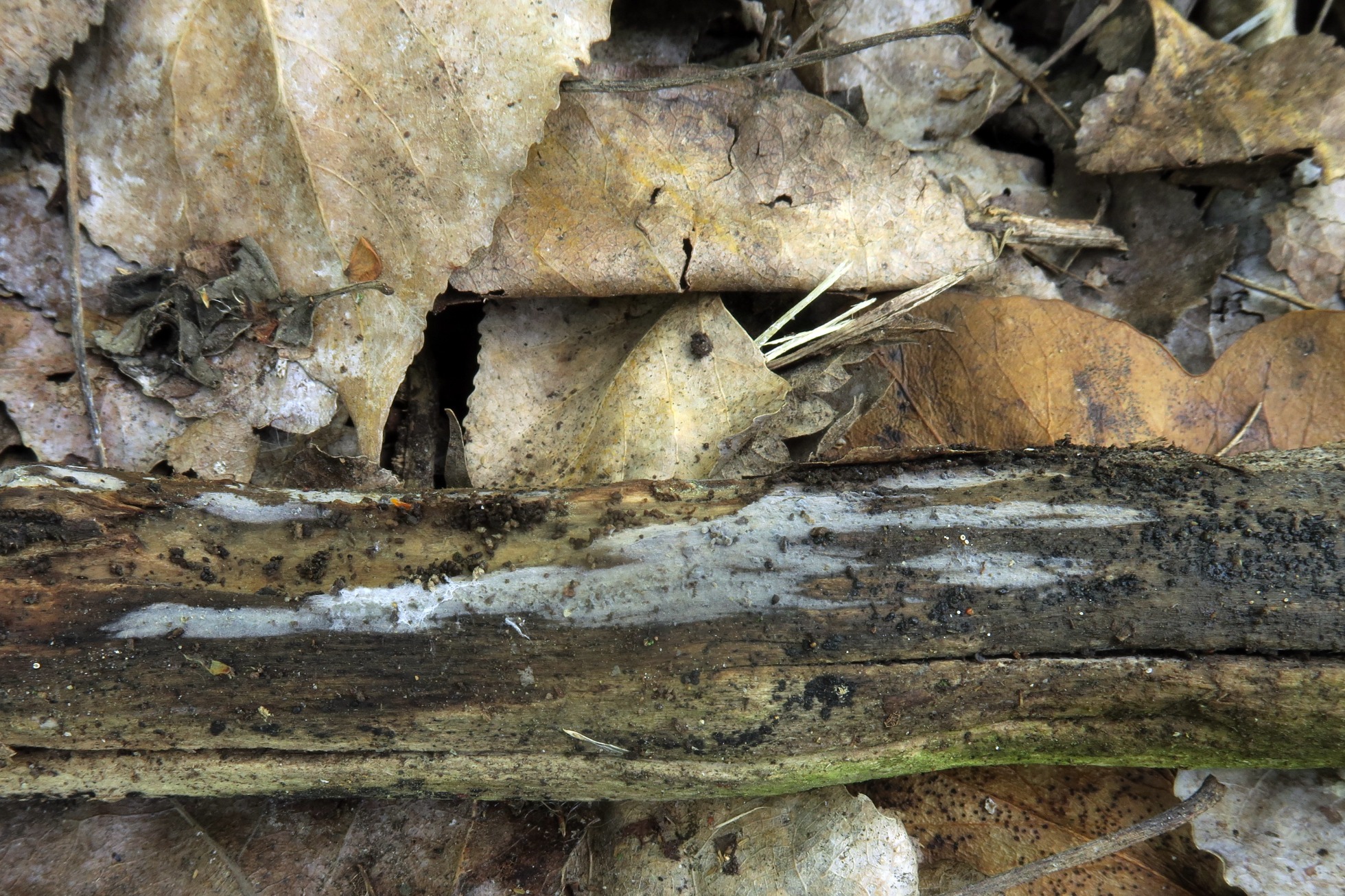 Un Corticial de muy poco grosor, de color grisáceo, fotografiado el pasado 18 de abril, en soto fluvial, brotando sobre la superficie descortezada de un tronco tumbado del suelo.