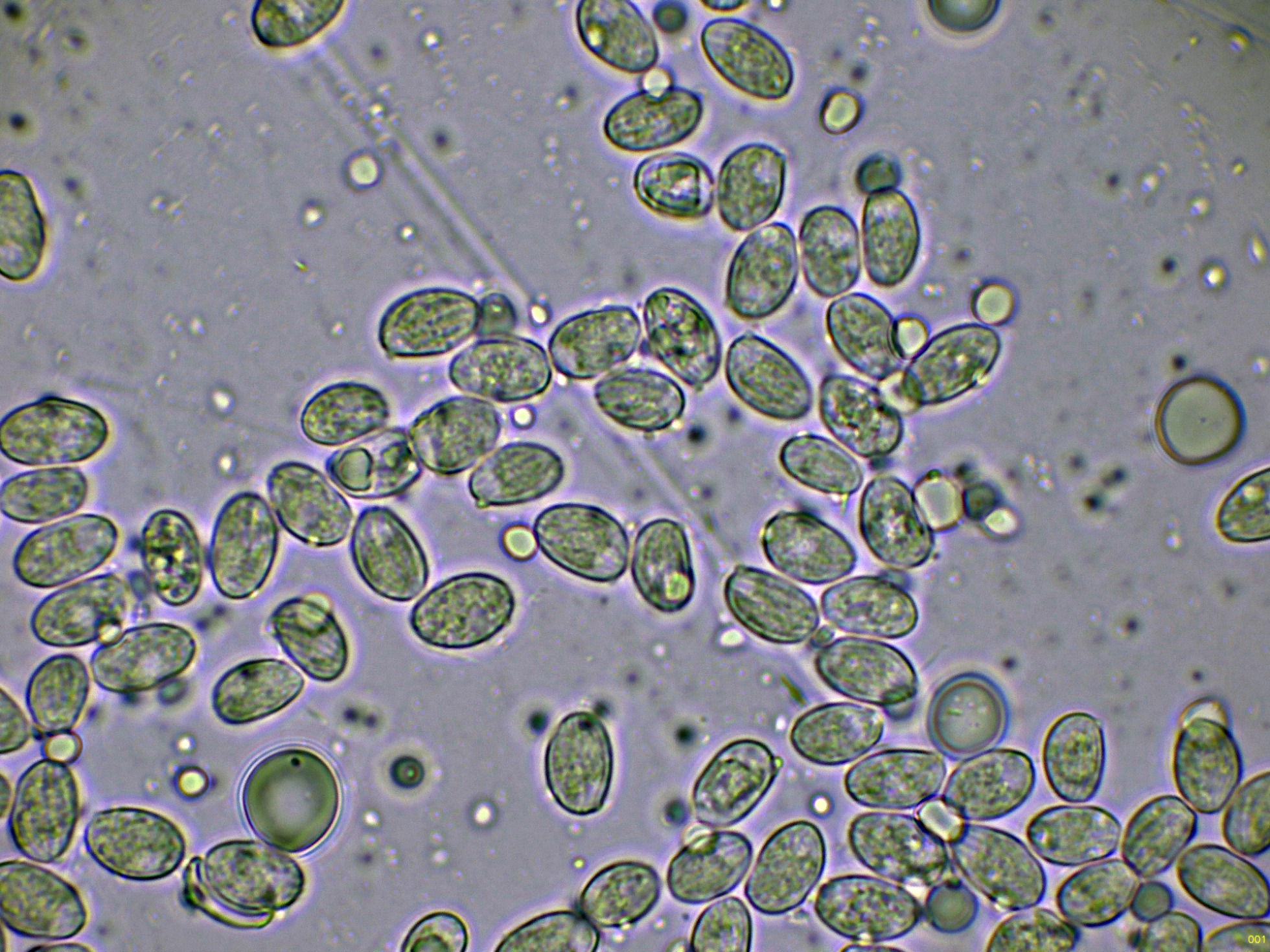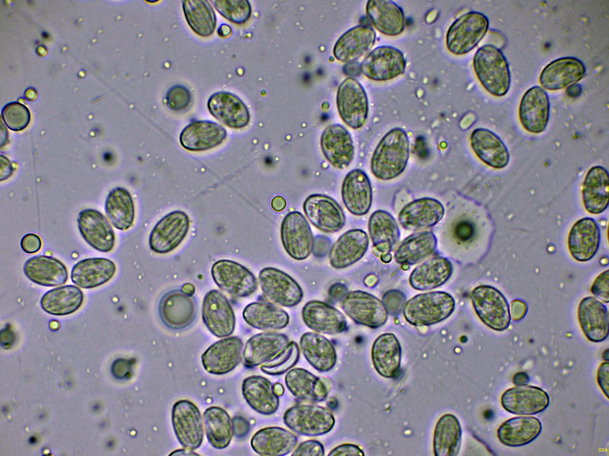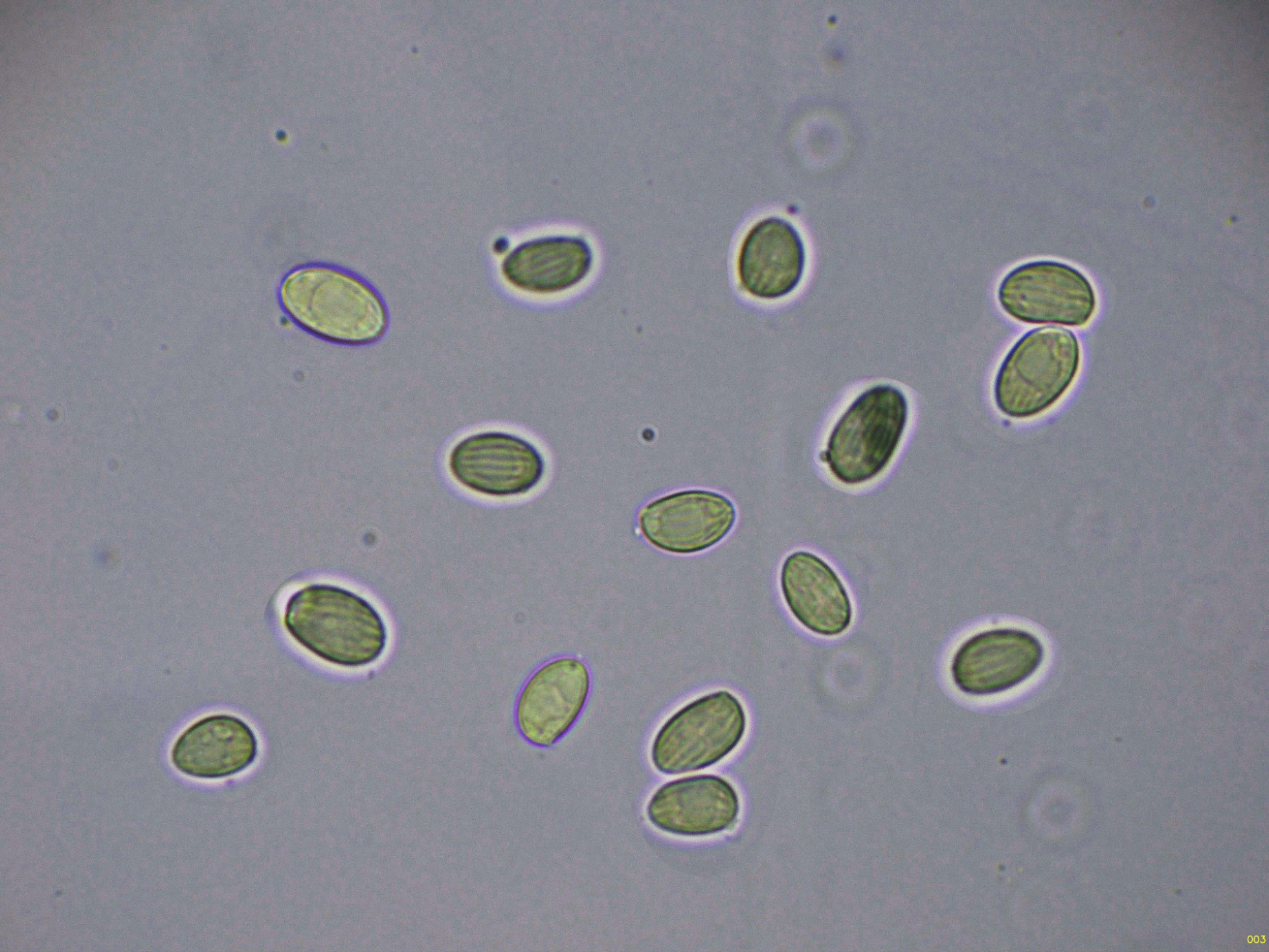 Las esporas en agua, a destacar las estrías que presentan en su superficie, características de la especie: