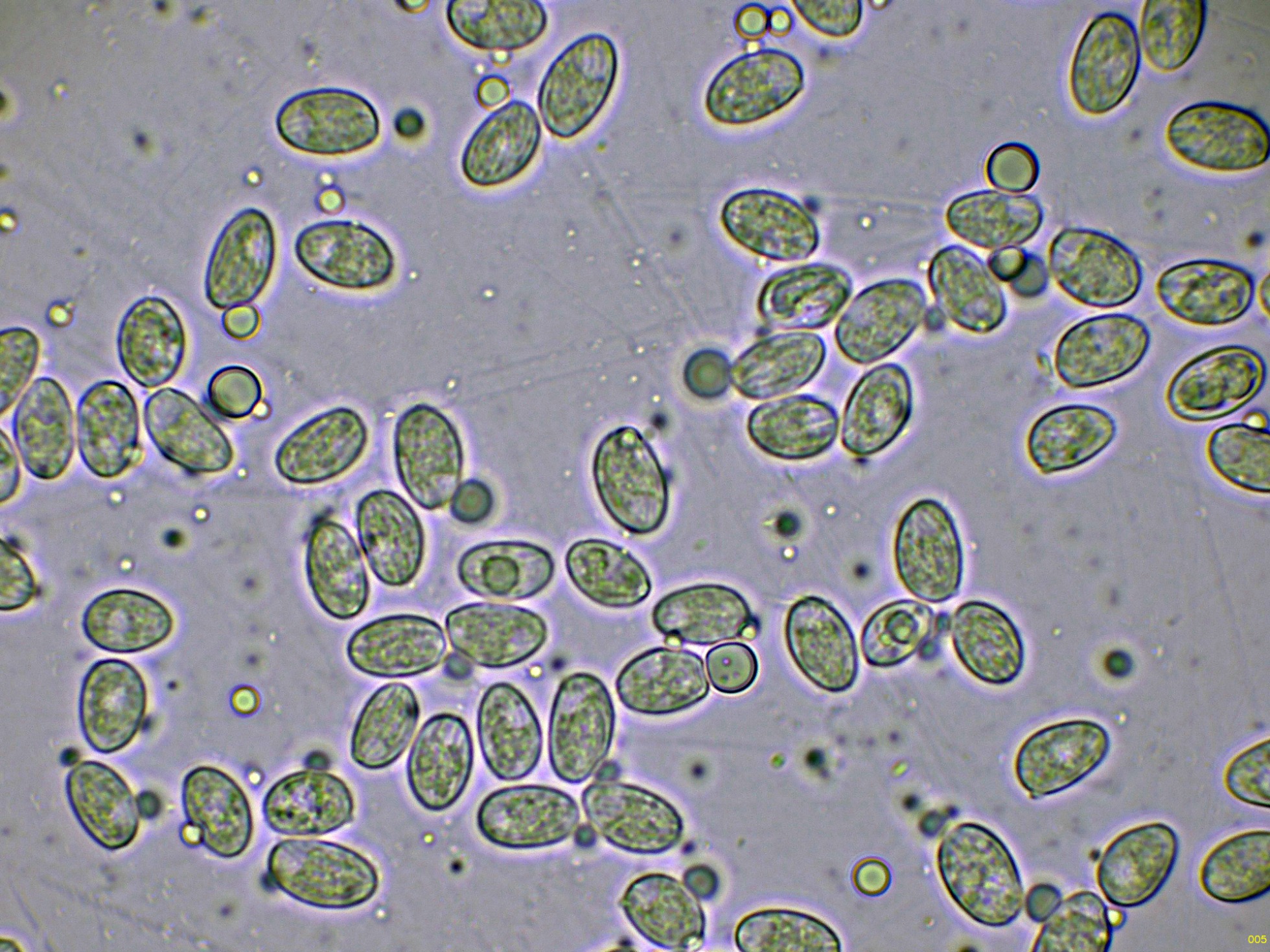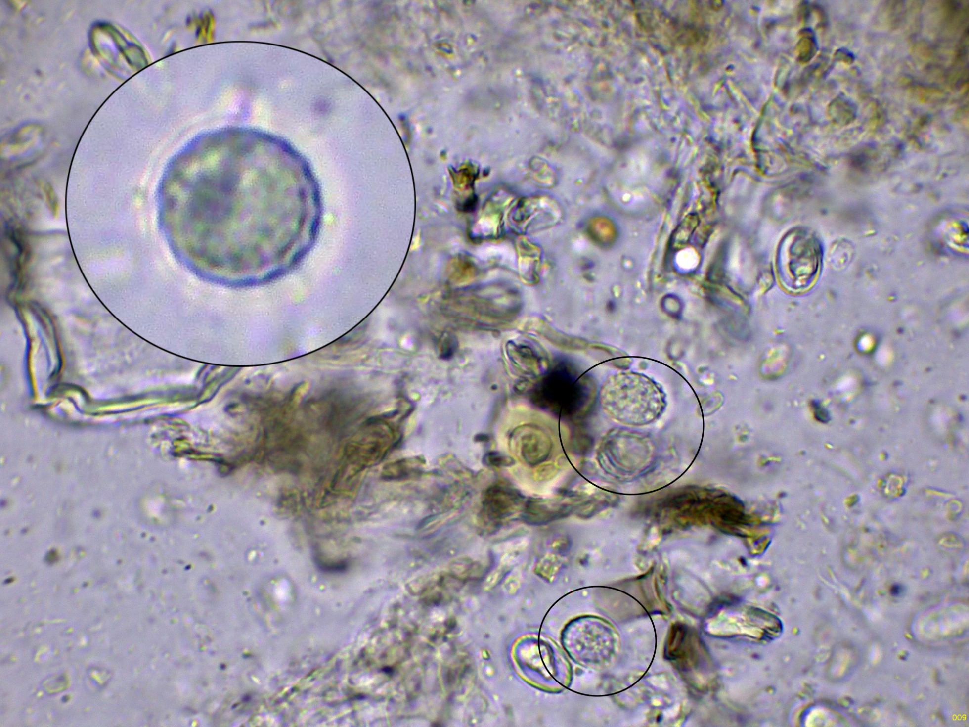 Y por último unas esporas en vista frontal, con una ampliación en la parte superior izquierda: