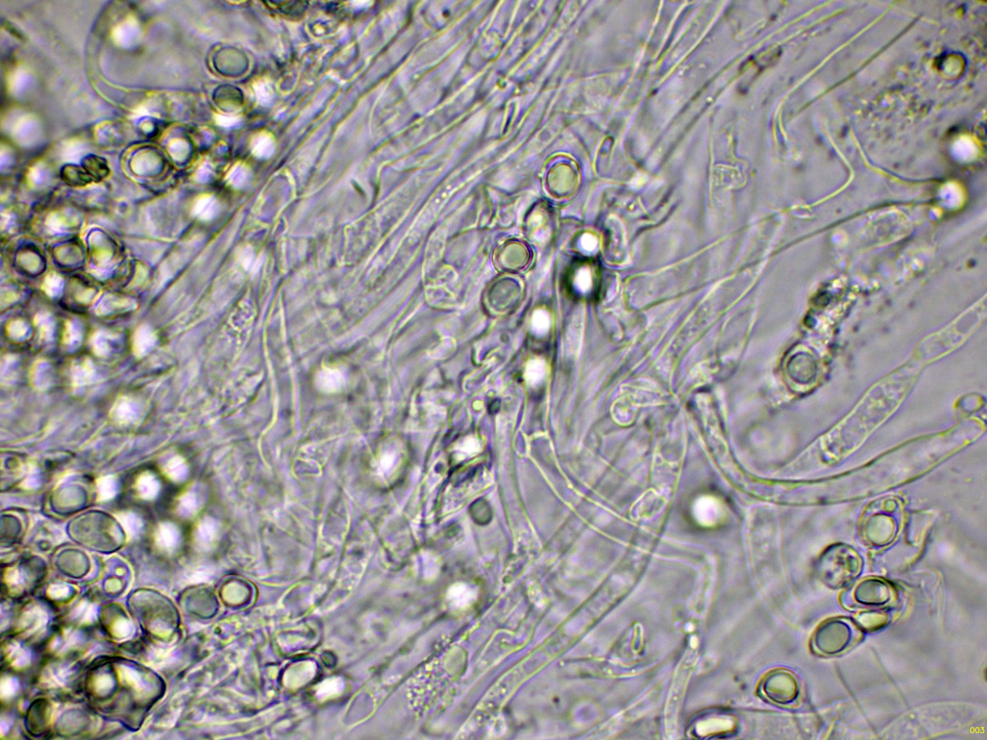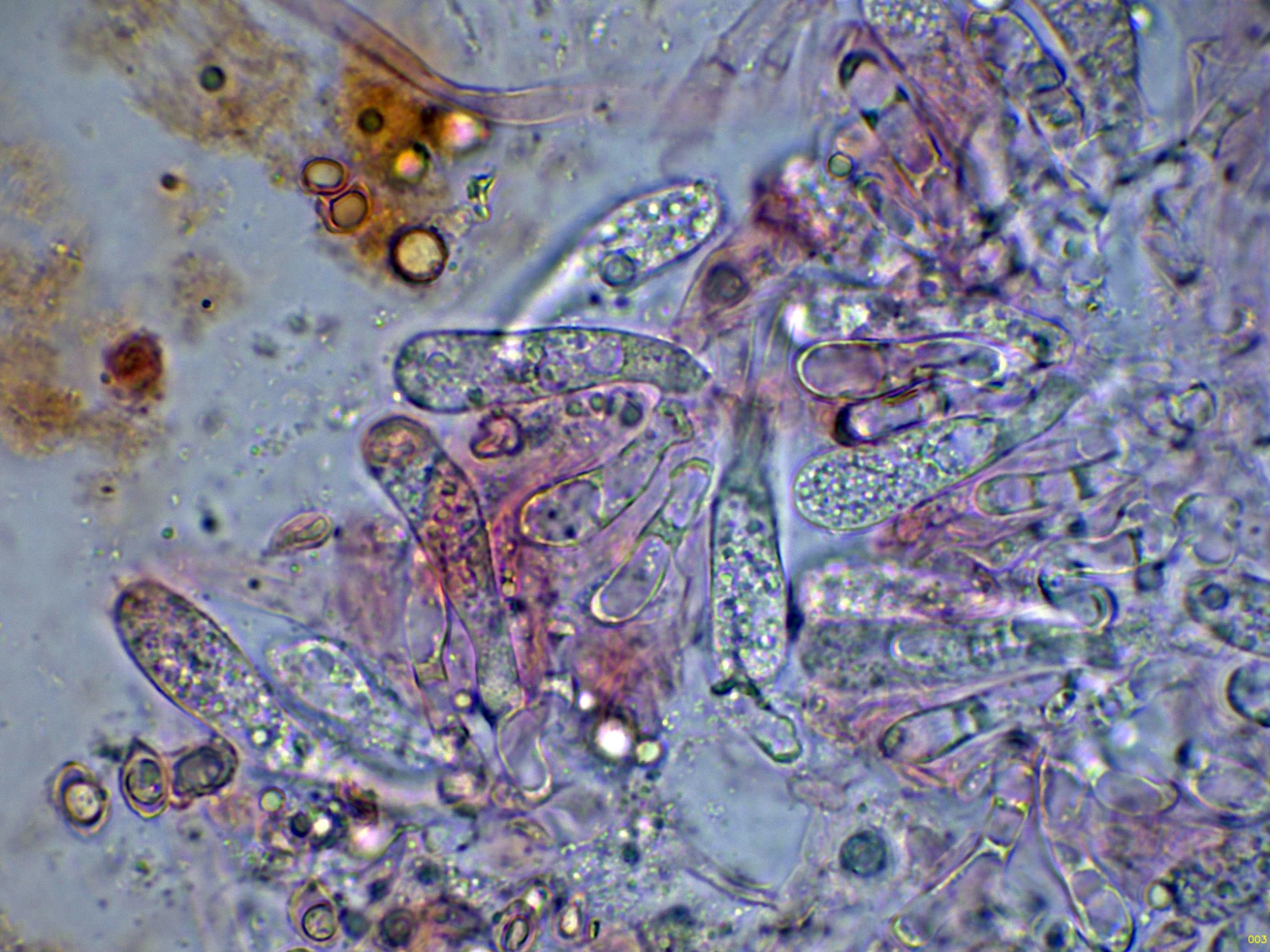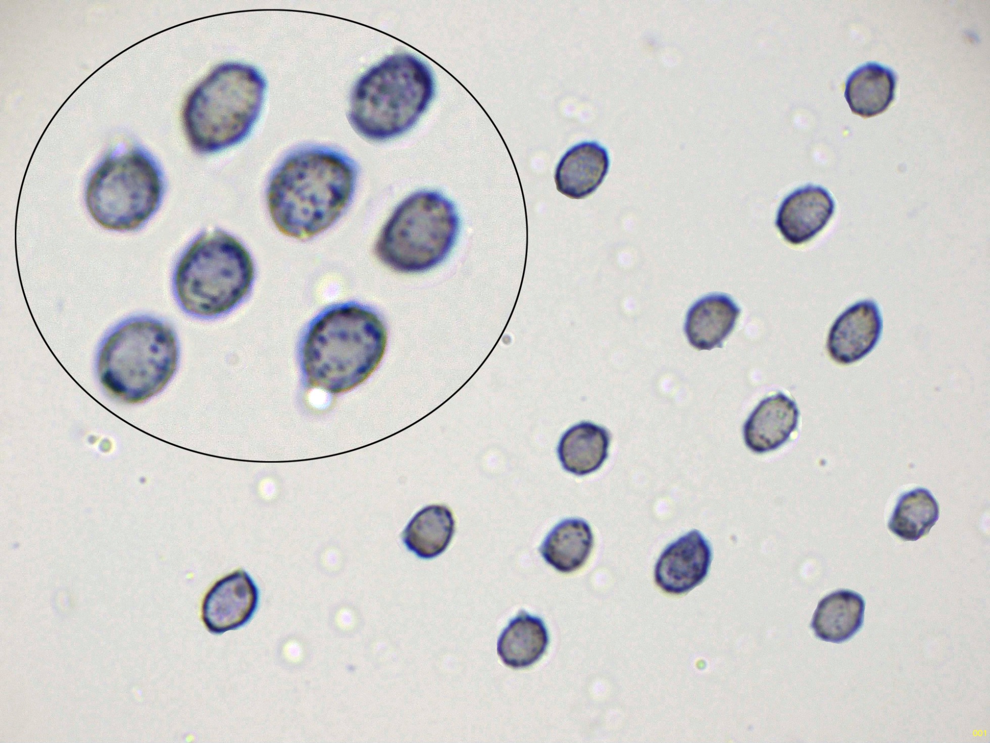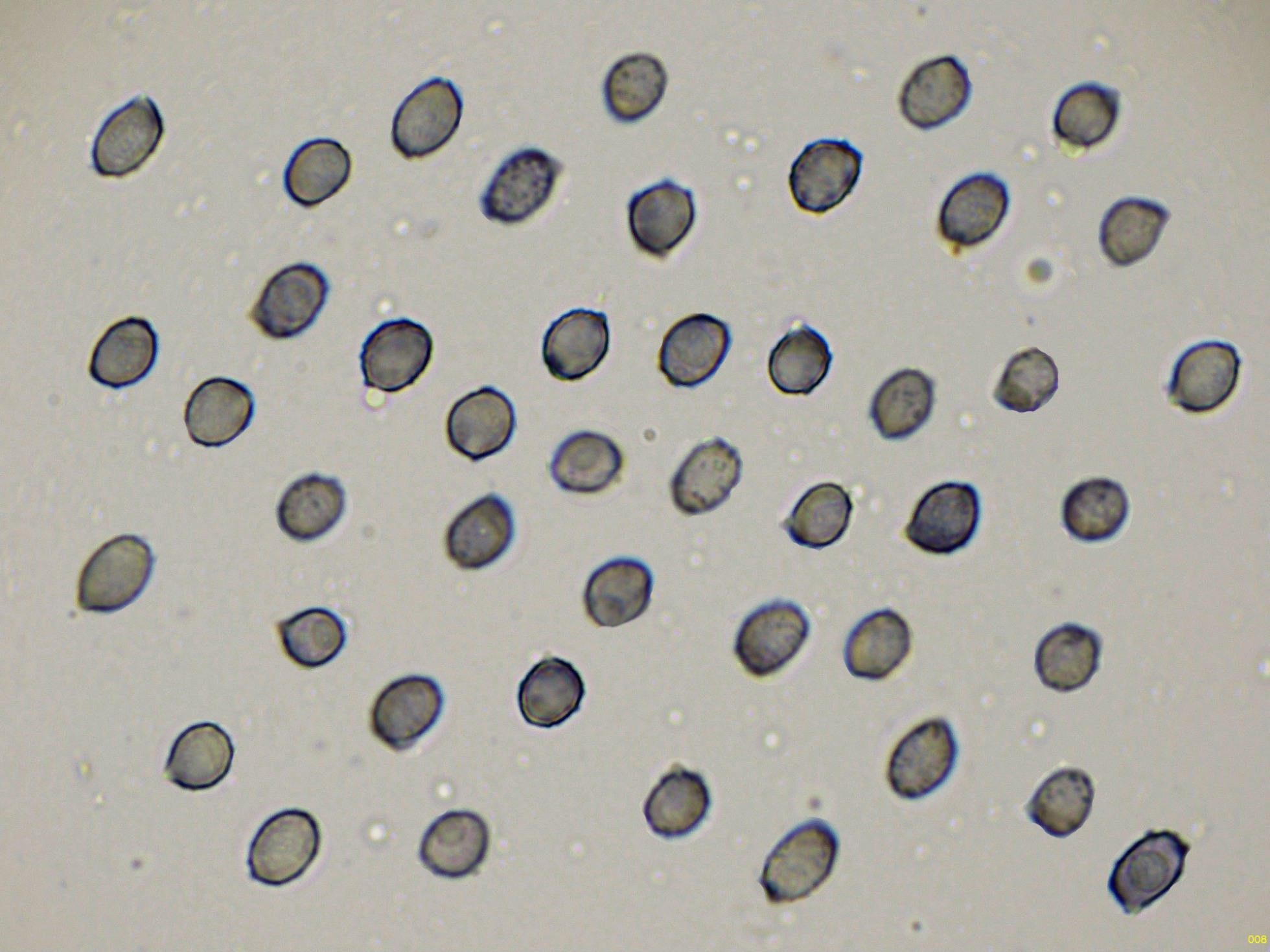 Estas esporas arrojan unas medidas por encima de la bibliografía consultada, según Funga Nordica de 6.5-7.5 x 4.5-5.5 μm, por lo que decidí hacer una nueva medición de las esporas libres depositadas de forma natural encima de la suprapellis en agua, con el resultado de: