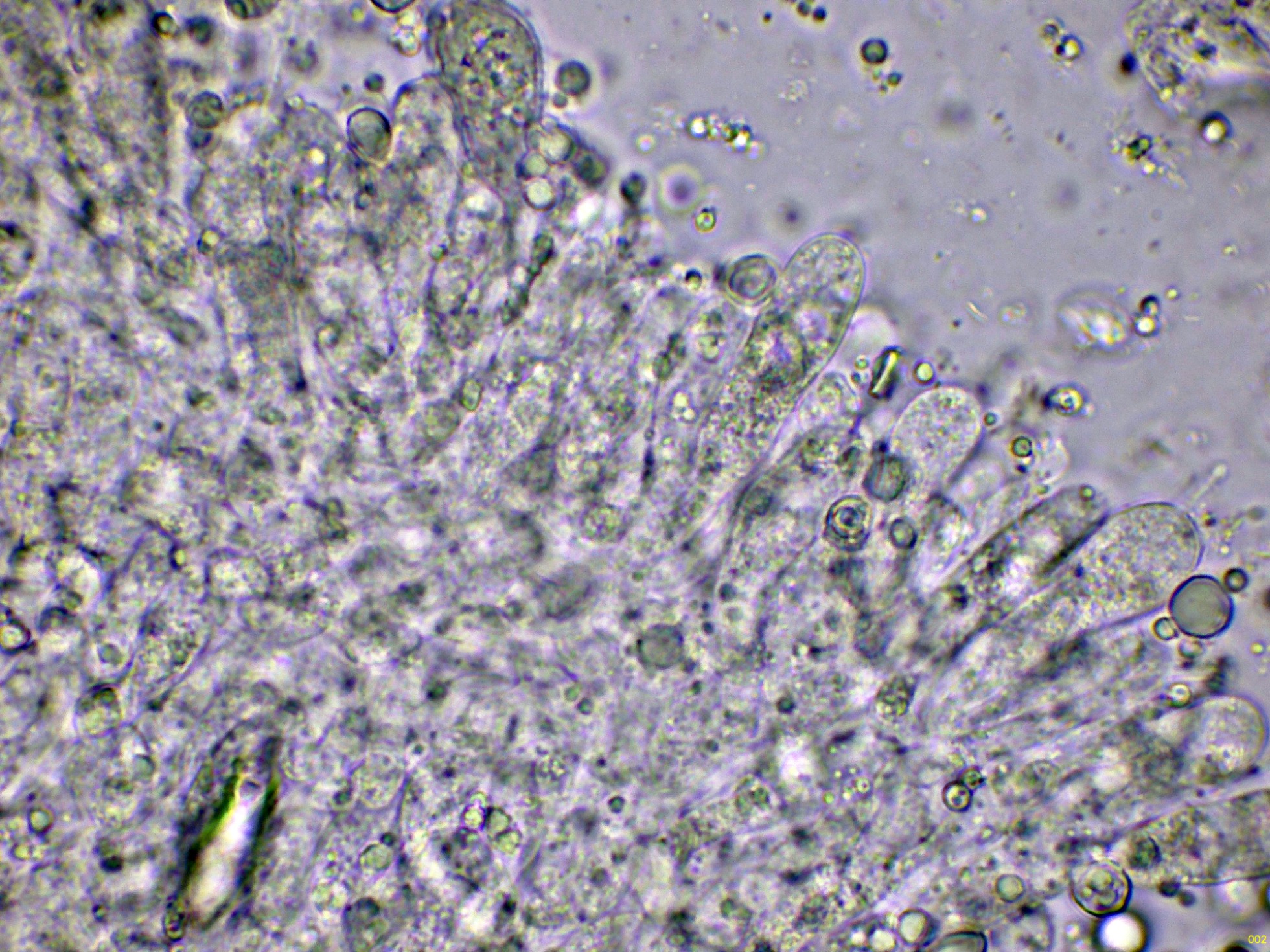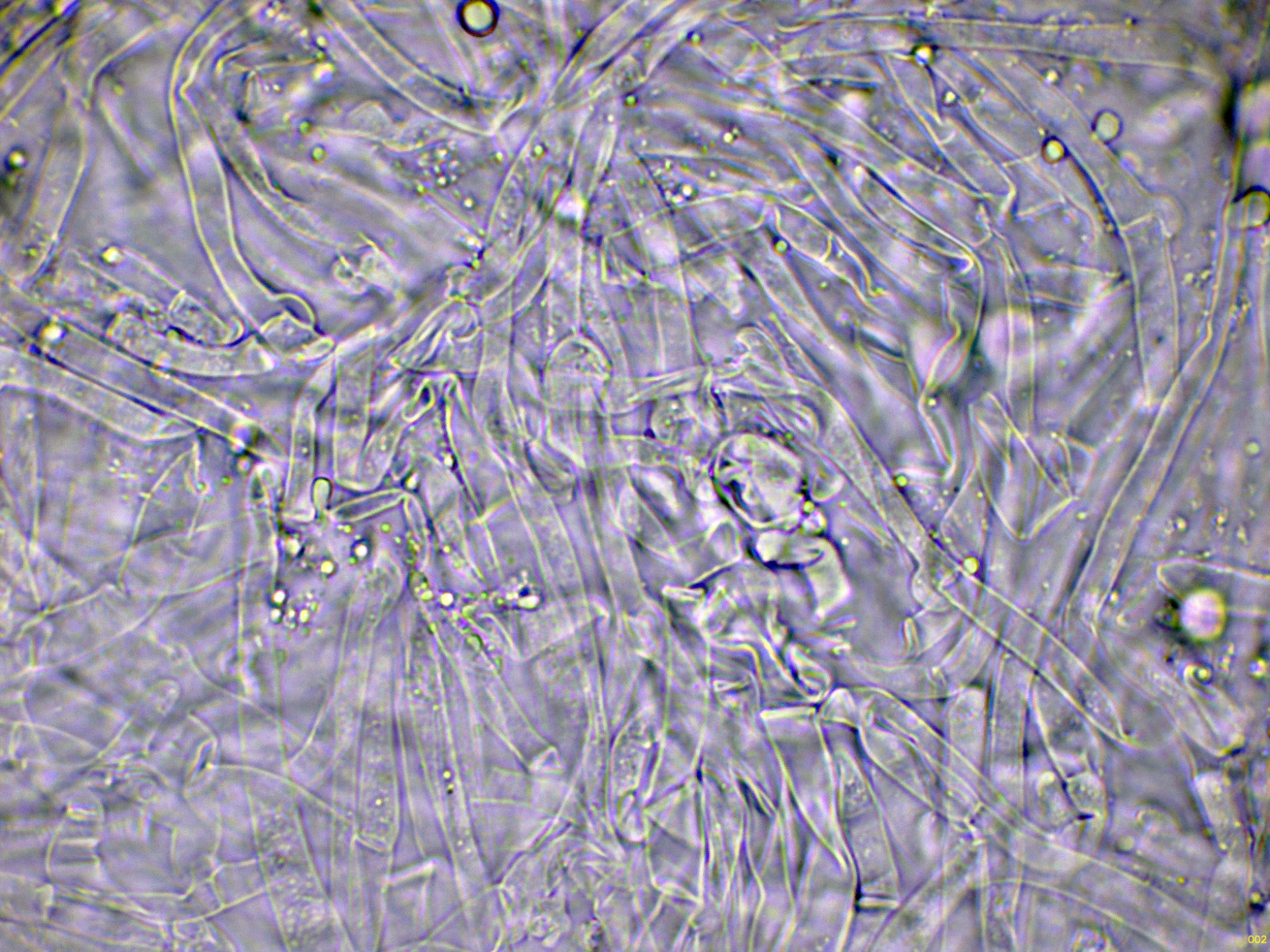 Arista laminar en solución de Rojo Congo diluido, sin elementos diferenciados de los basidios: