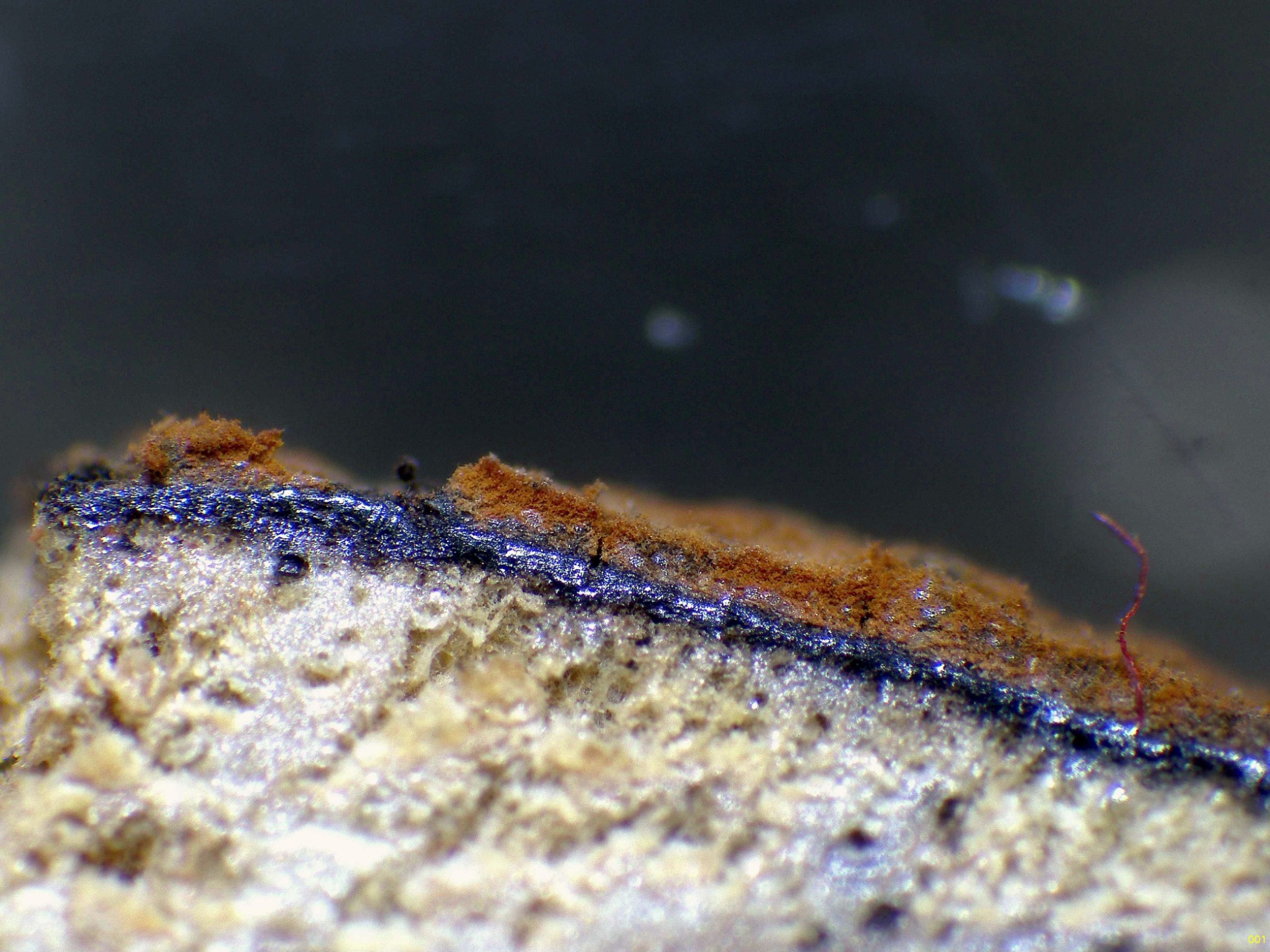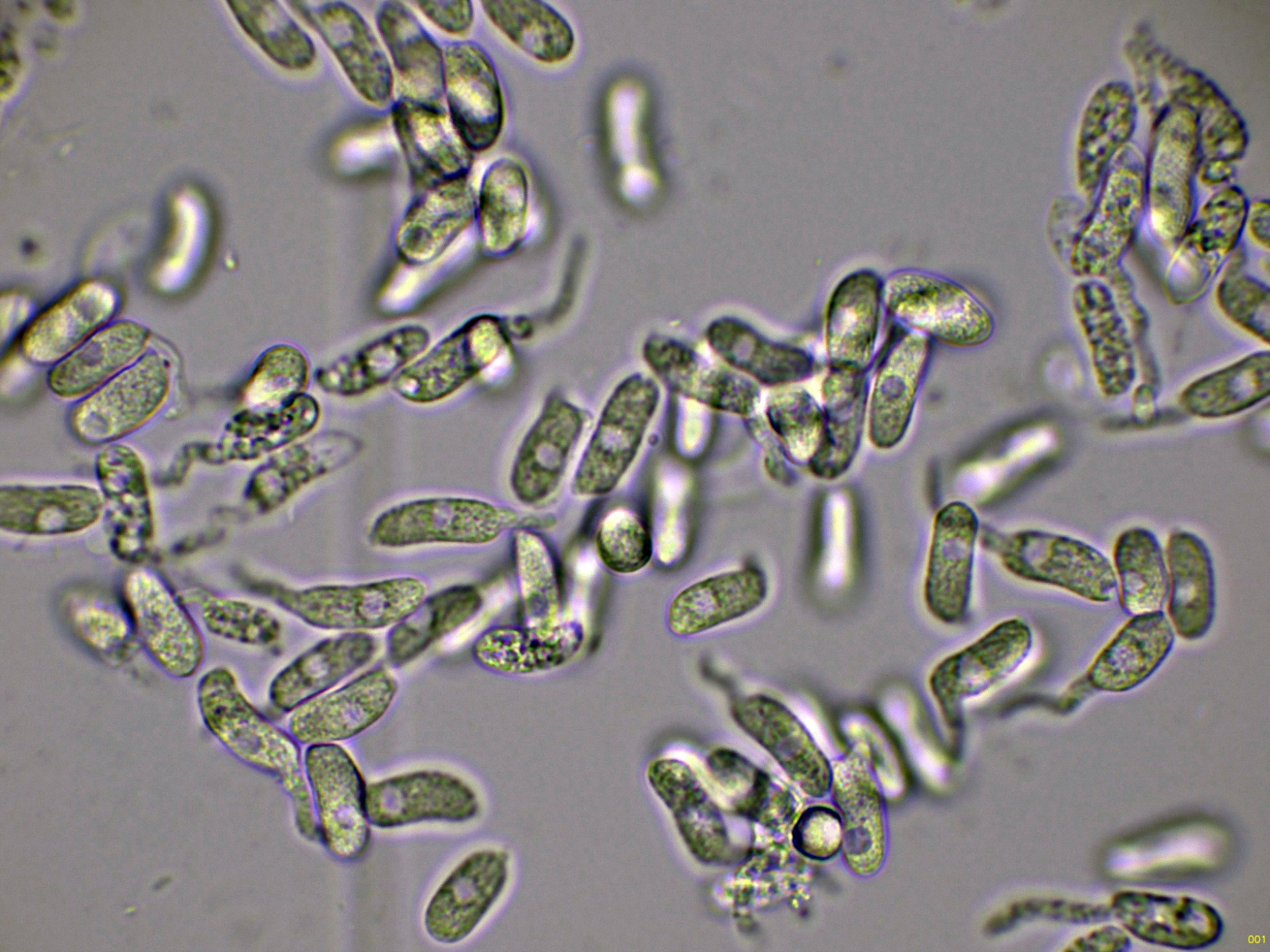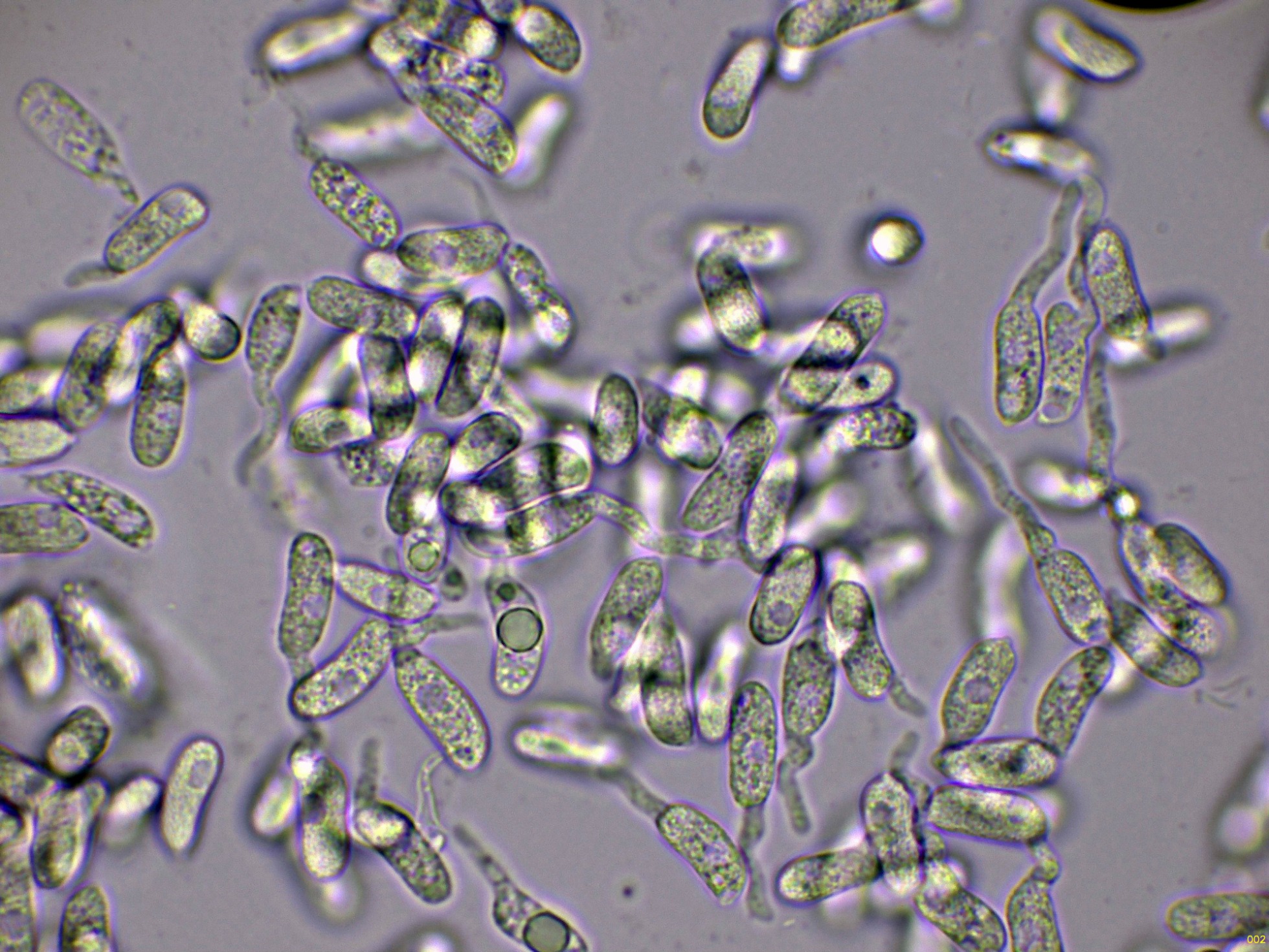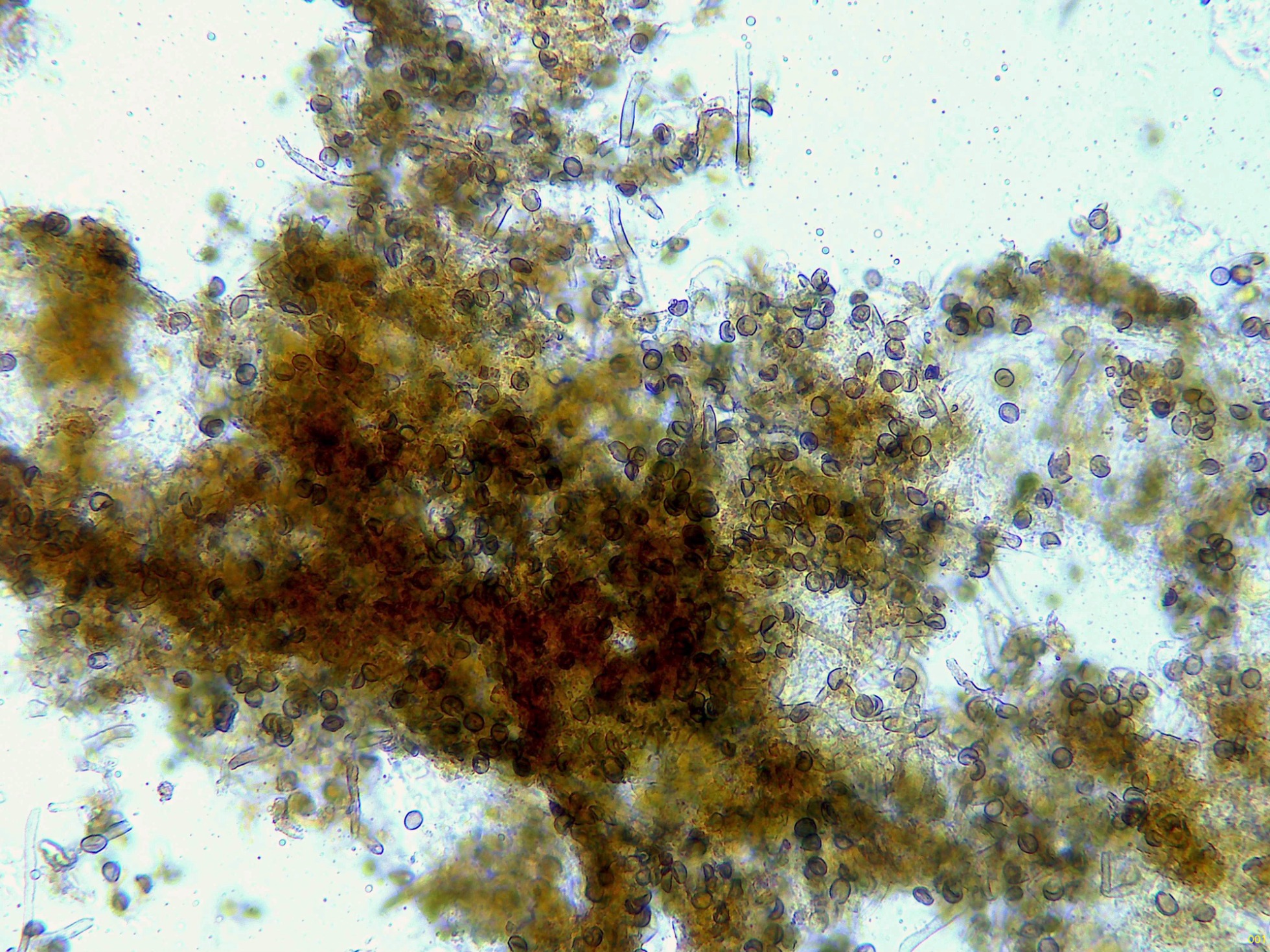 Considerando su aspecto, en mi opinión se trataría de unos ascomas inmaduros de Hypoxylon rubiginosum, y lo que observamos en la microscopía, se trataría del anamorfo, fase asexual o imperfecta de la especie.