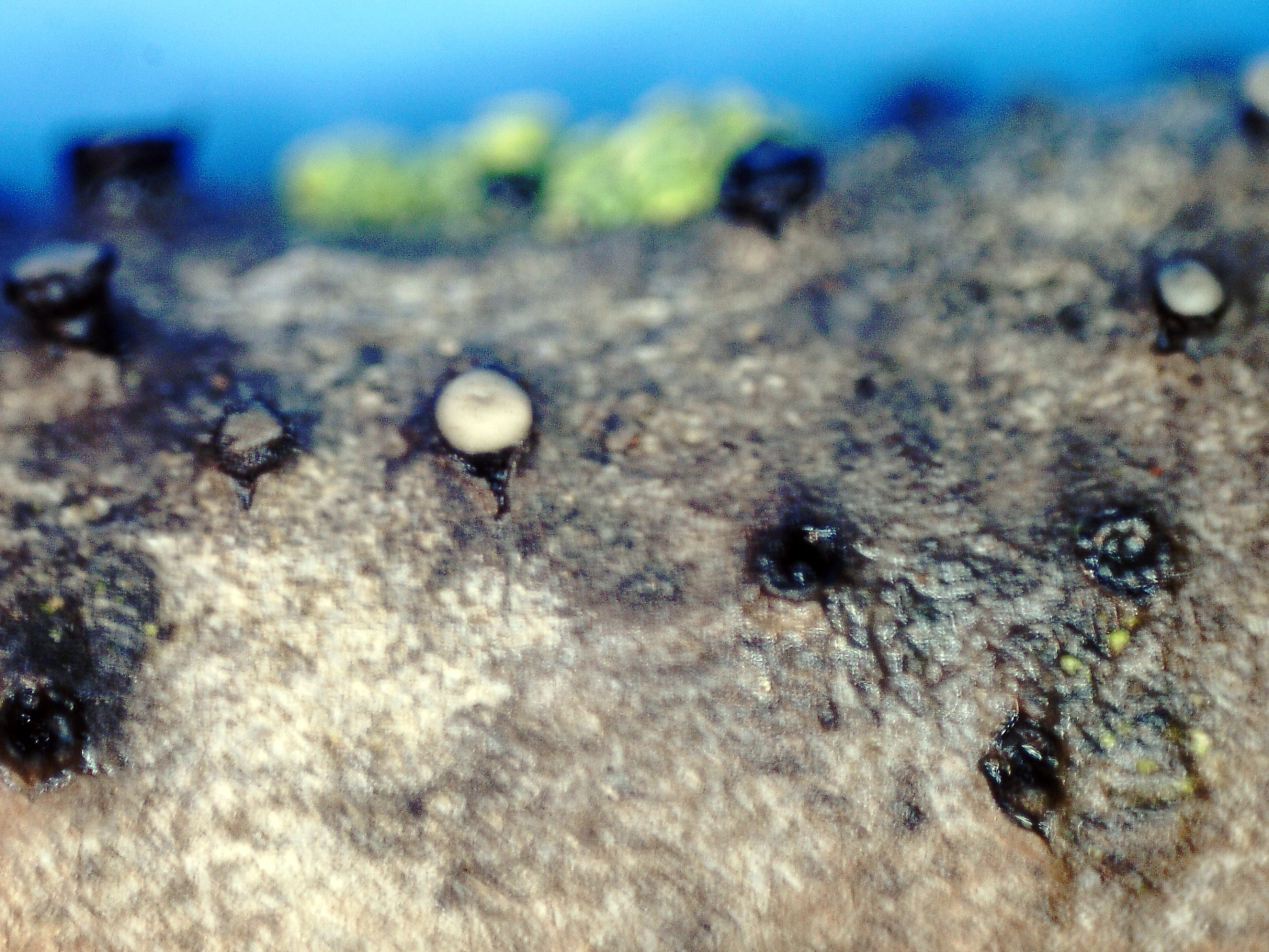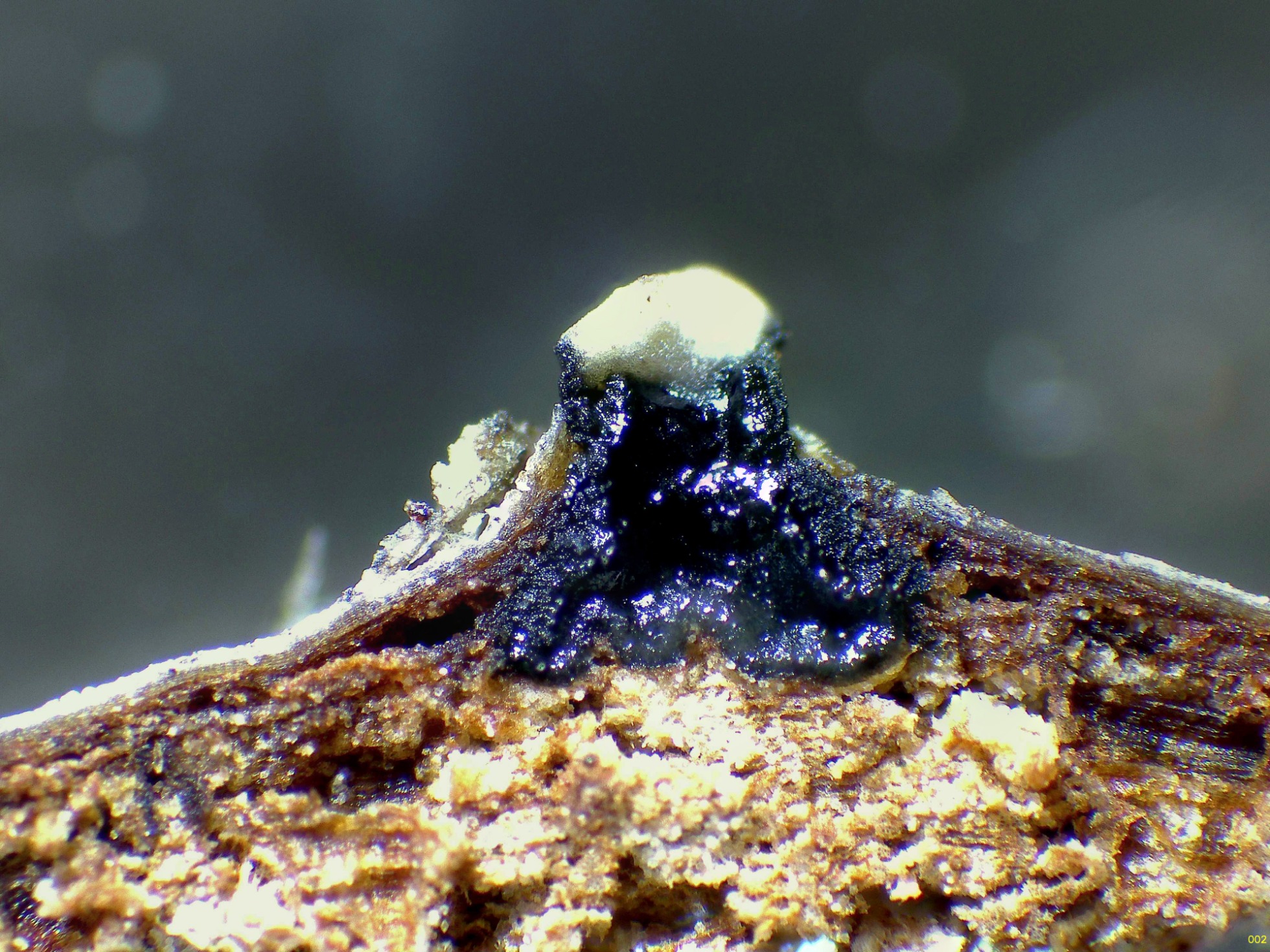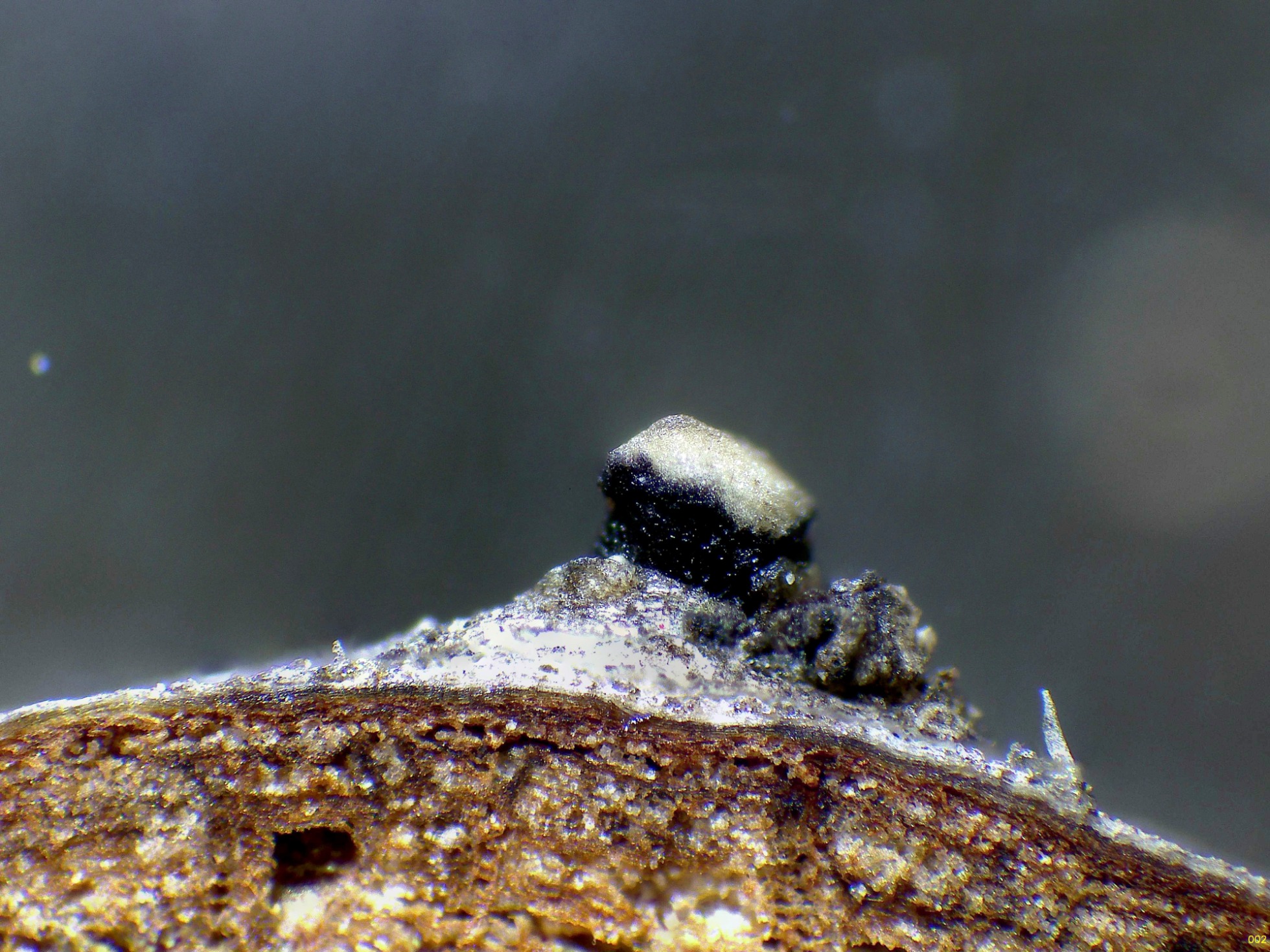 Aunque los ascomas se encontraban bastante secos, solo tuve que hidratarlos y colocarlos en cámara húmeda para que produjeran y soltaran una buena cantidad de conidios (ver masa gelatinosa encima de los ascomas).