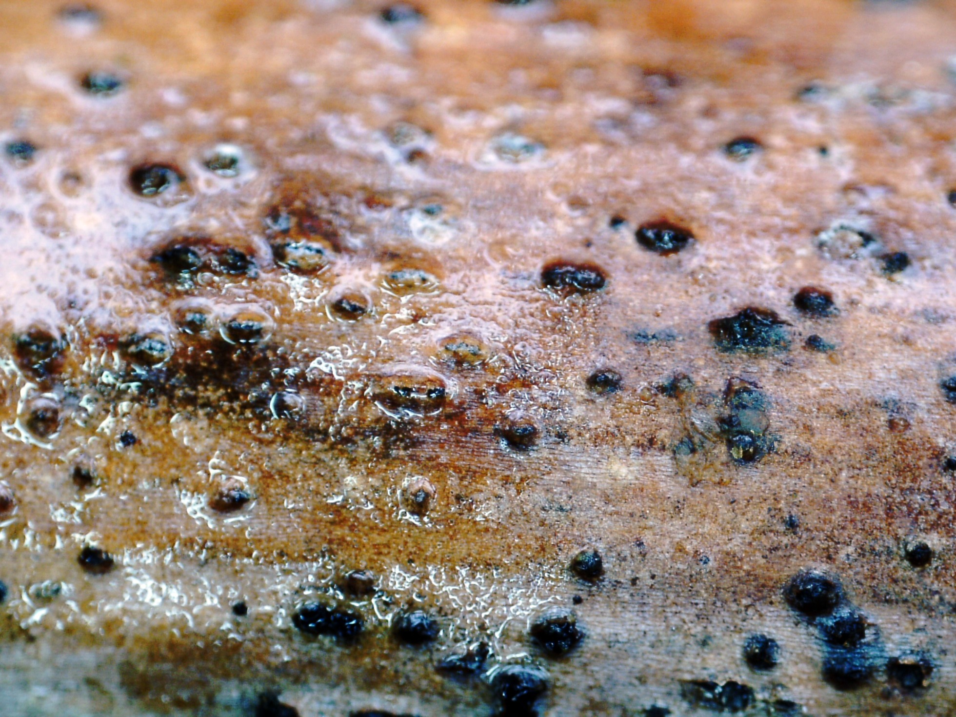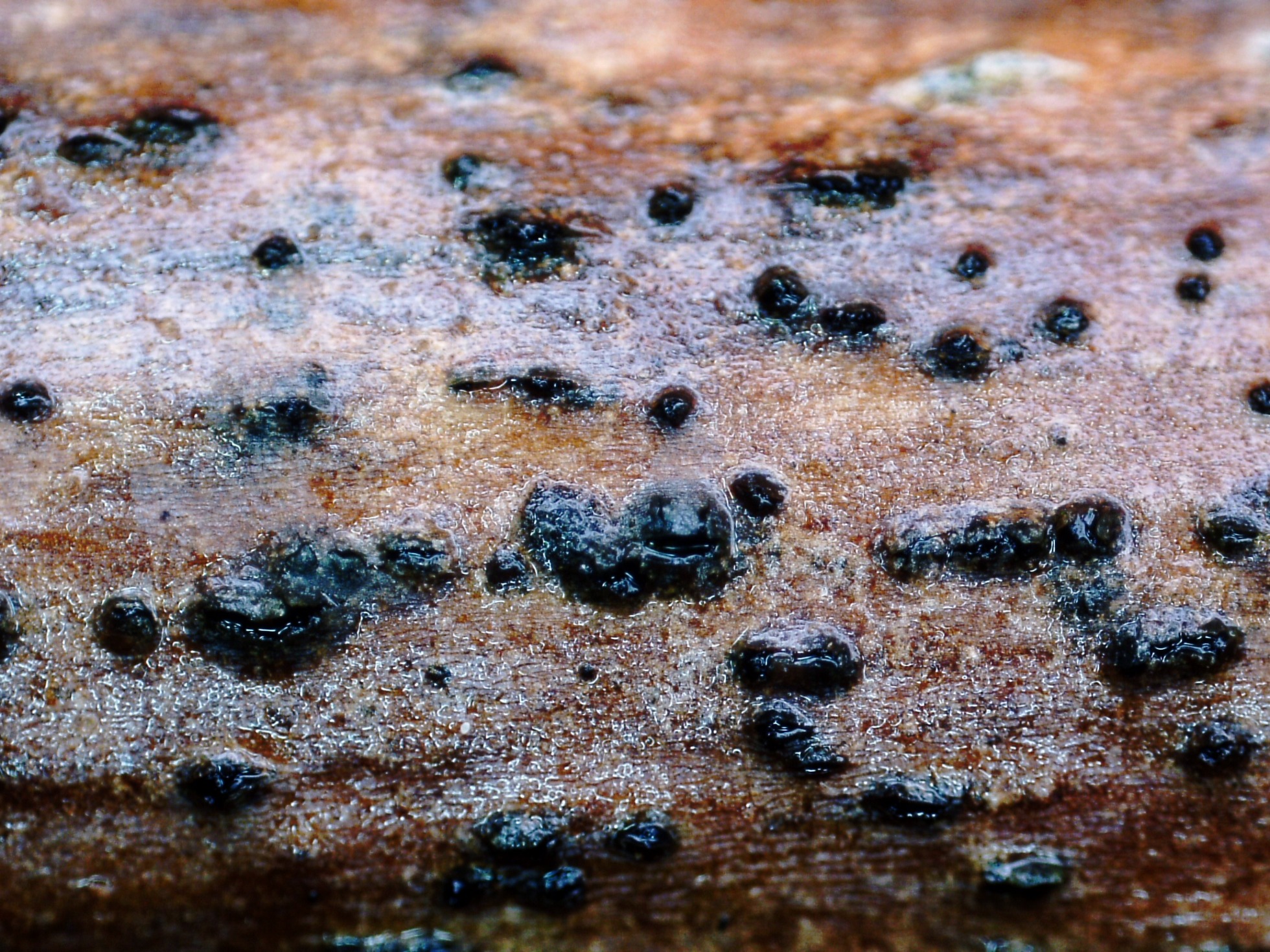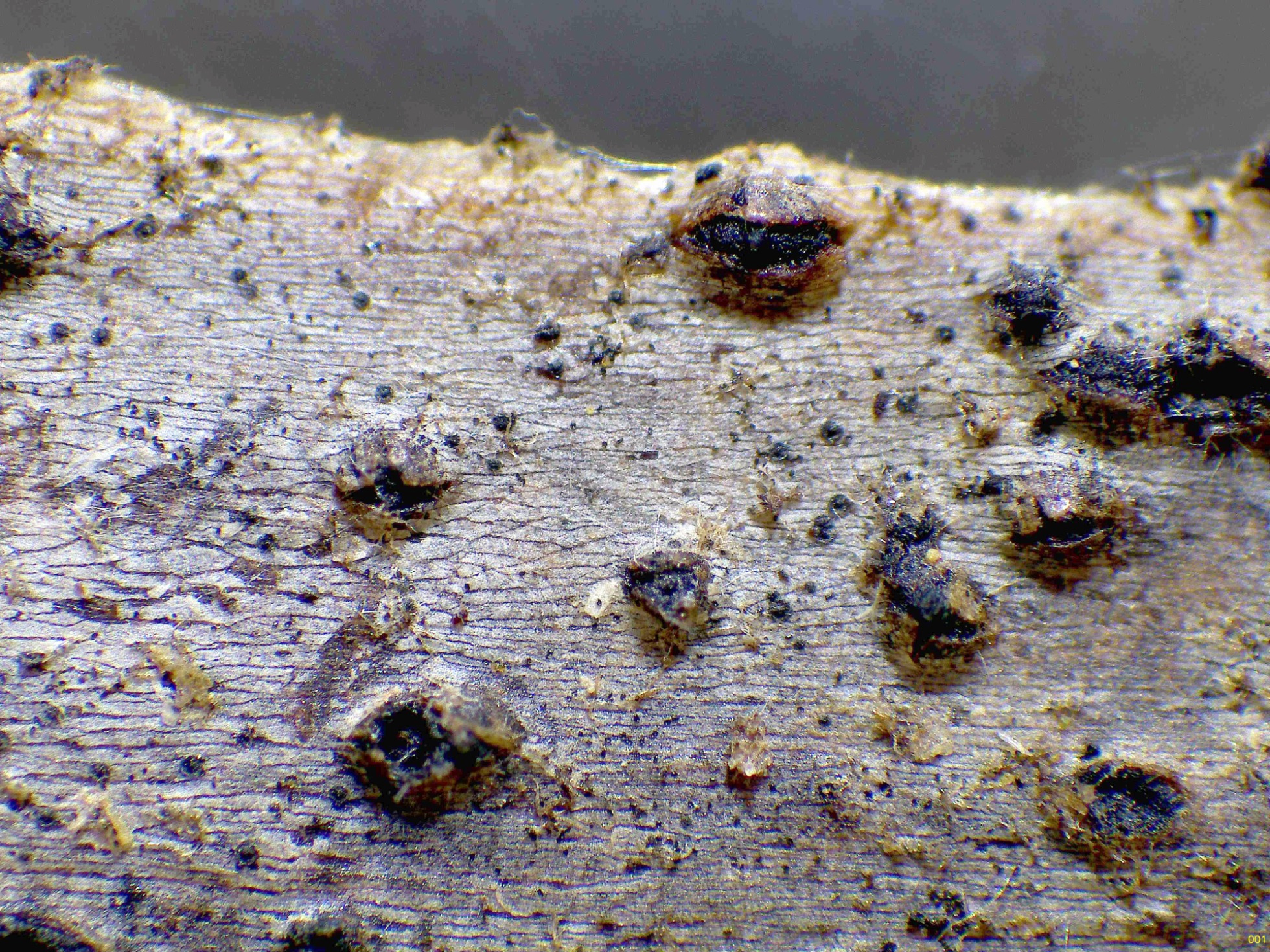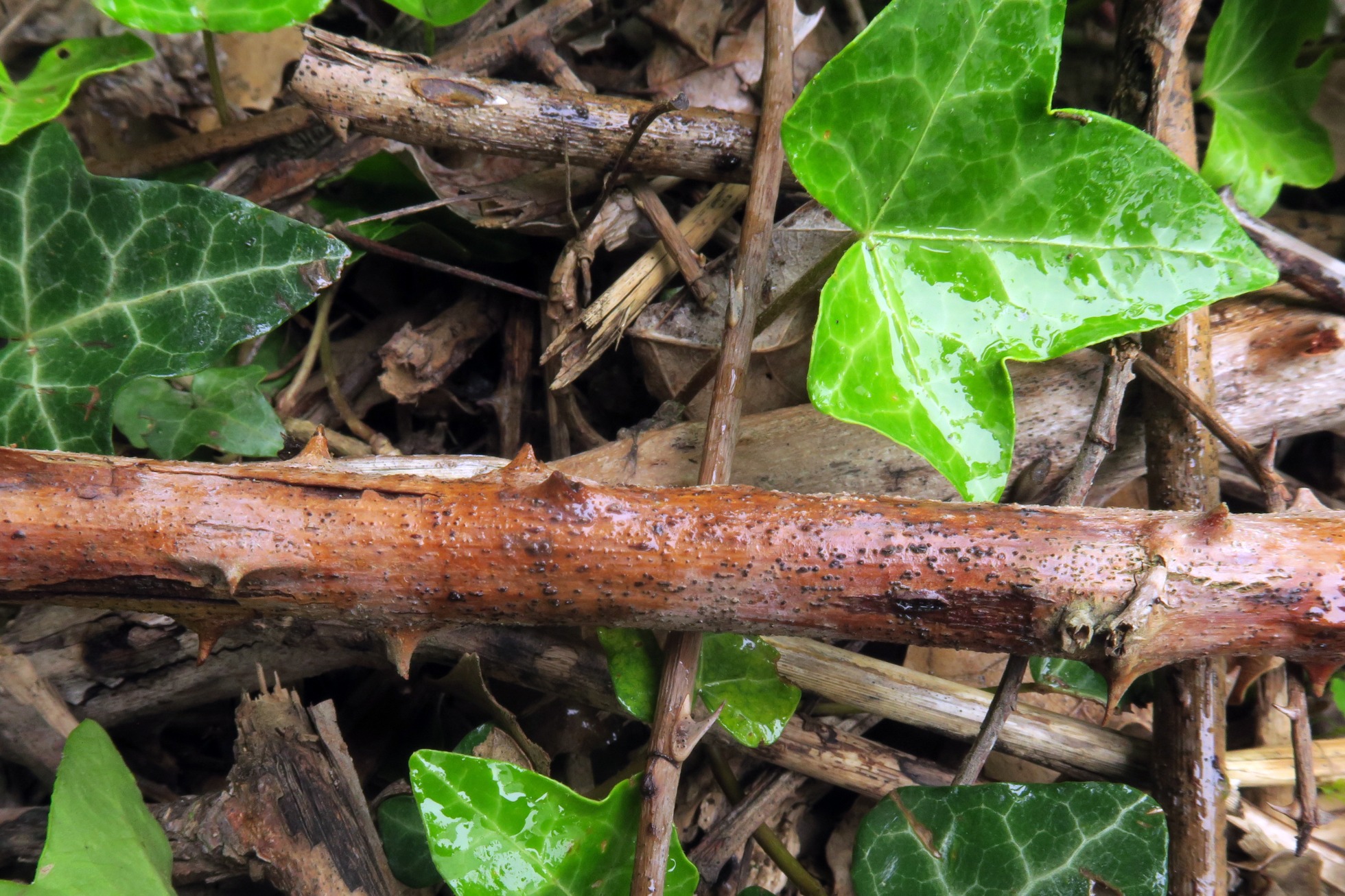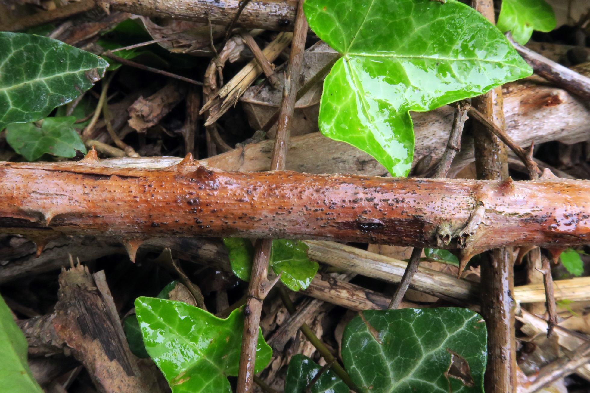 Un pequeño ascomiceto del día 5 de mayo, brotando de manera dispersa pero abundante, sobre un tallo de Rubus sp.