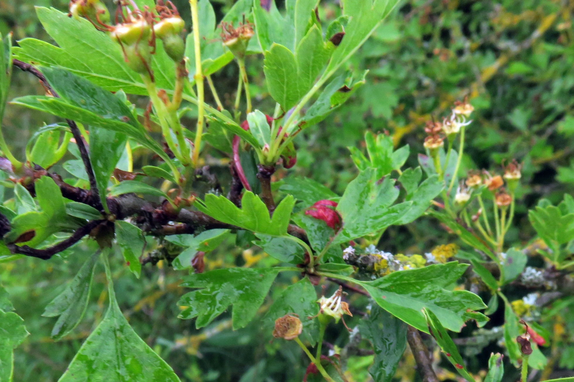 Una Taphrina del 5 de mayo pasado, brotando sobre unas hojas verdes sujetas al árbol de Crataegus sp.
