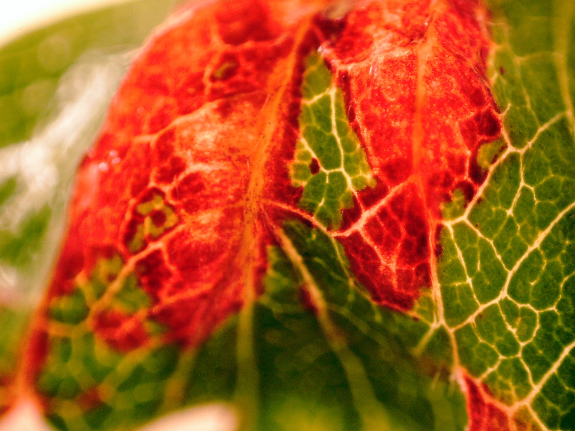 Ampliación a 20 aumentos de la zona afectada, con un muy llamativo color rojo, y las evidentes deformaciones de la hoja por el efecto de este.