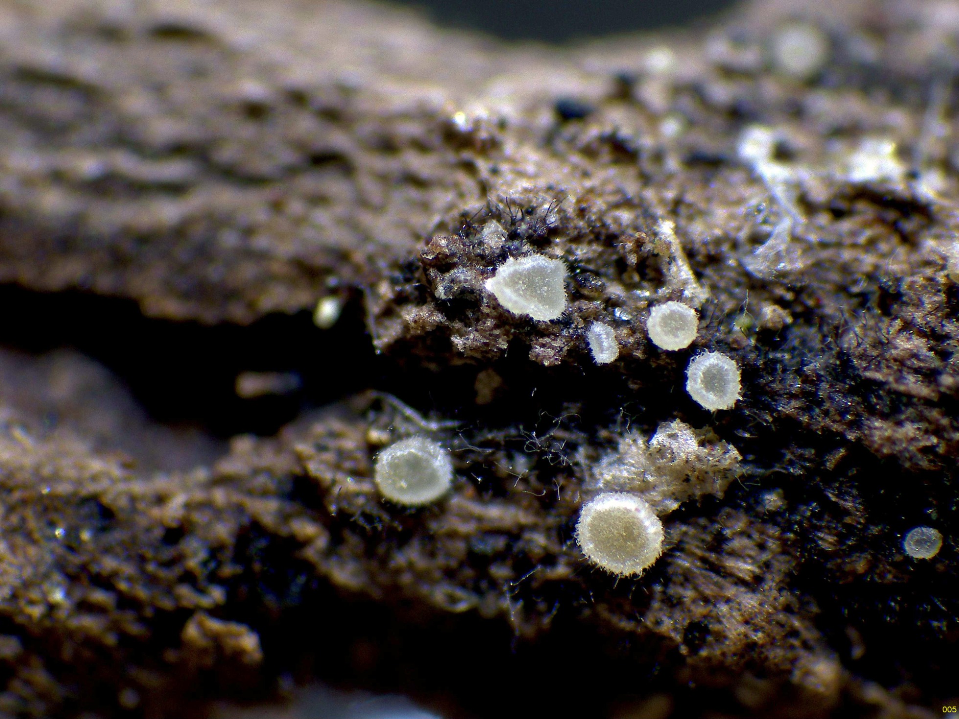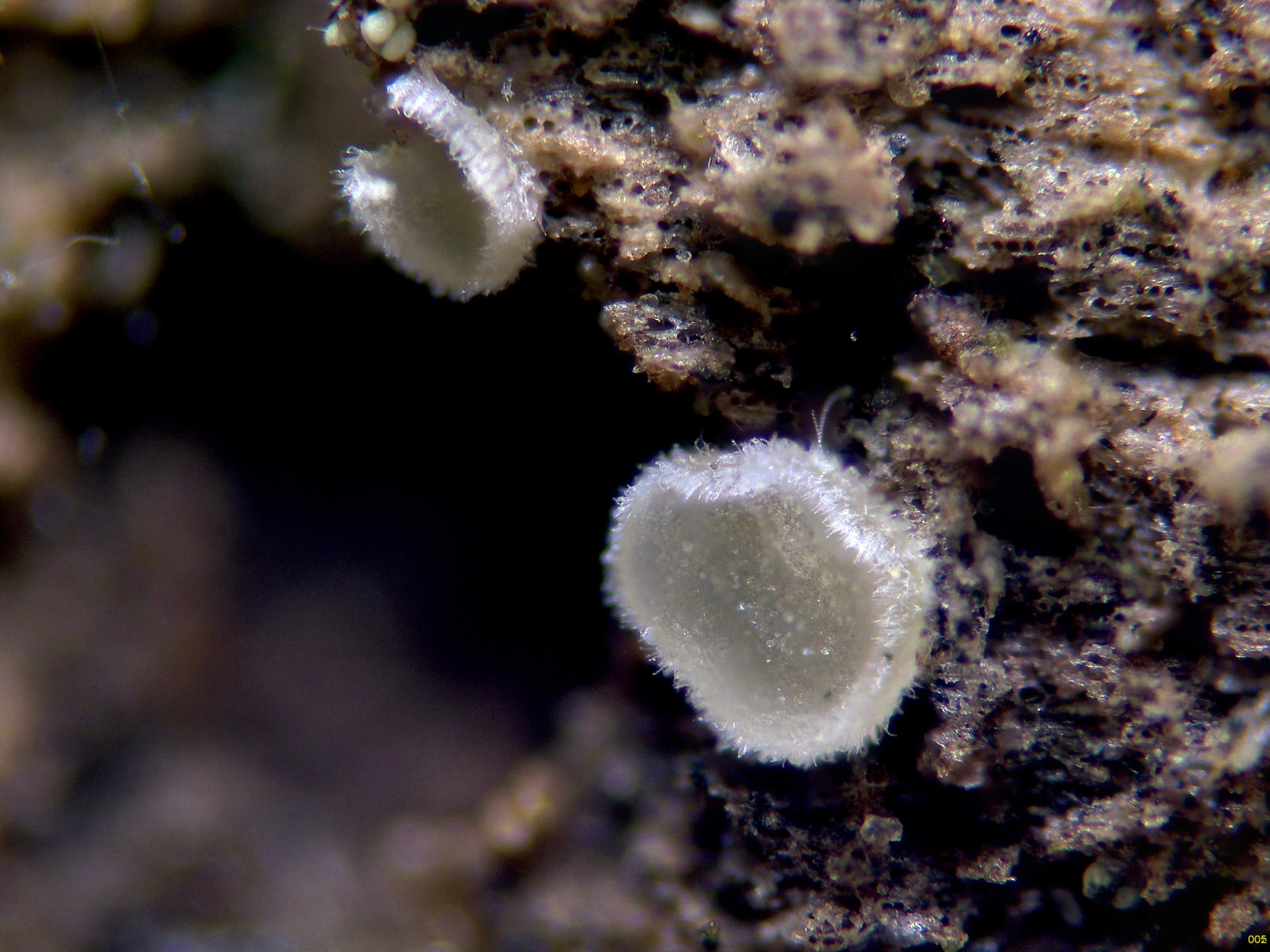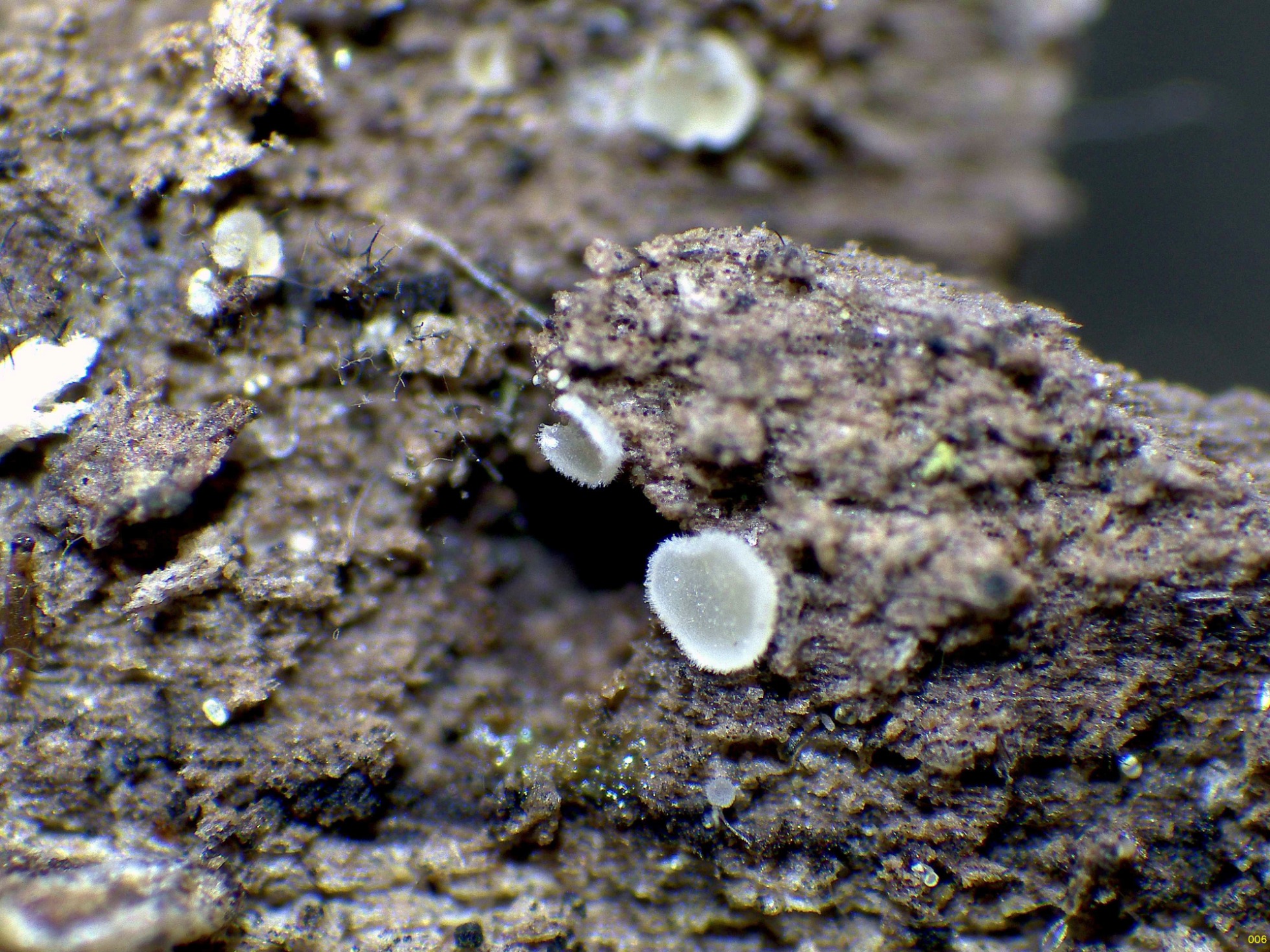 Un pequeño discomiceto blanco fotografiado el 20 de abril, brotando en la superficie de un tronco en descomposición tendido en el suelo, probablemente de roble. Agradecer a Timo Kosonen su ayuda en la determinación de la especie.