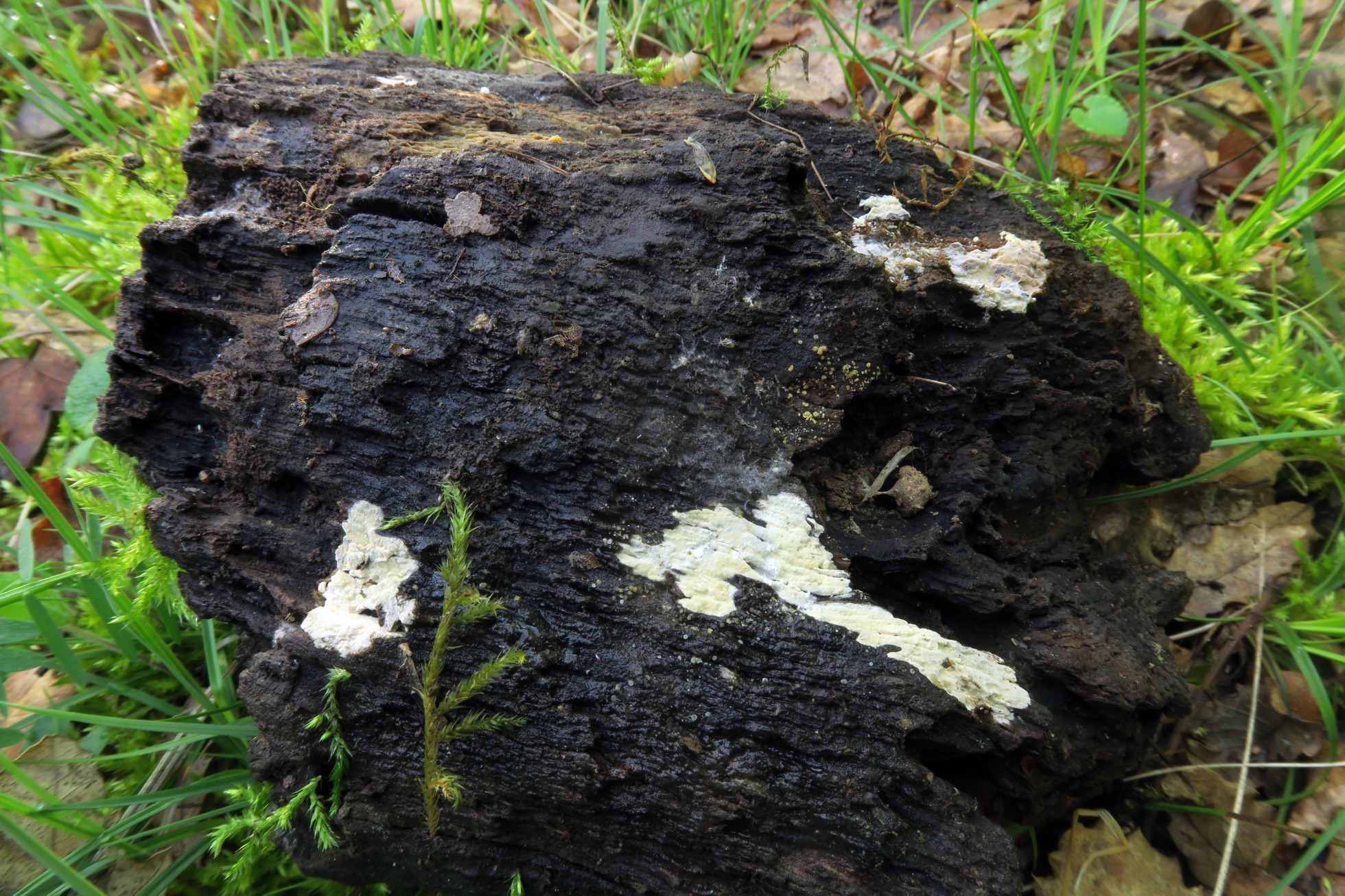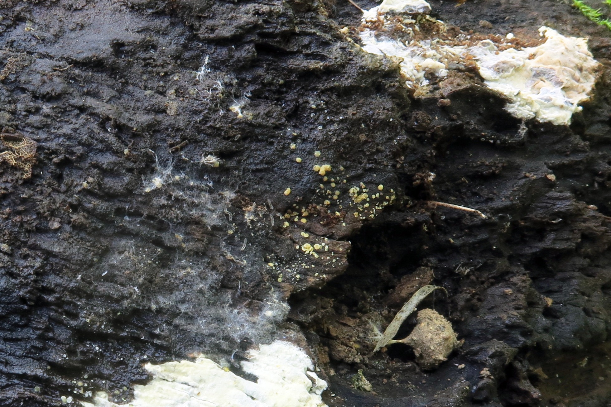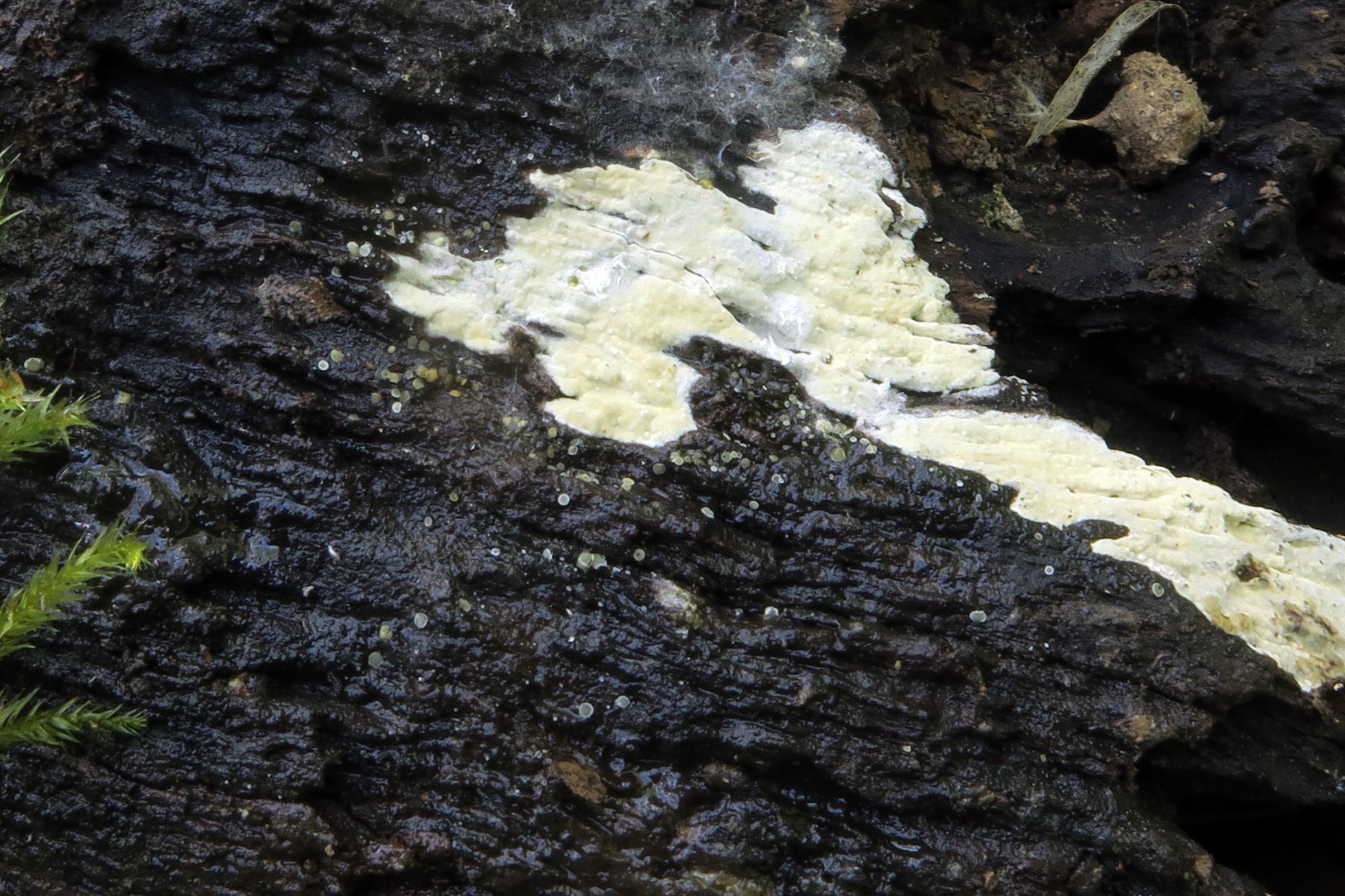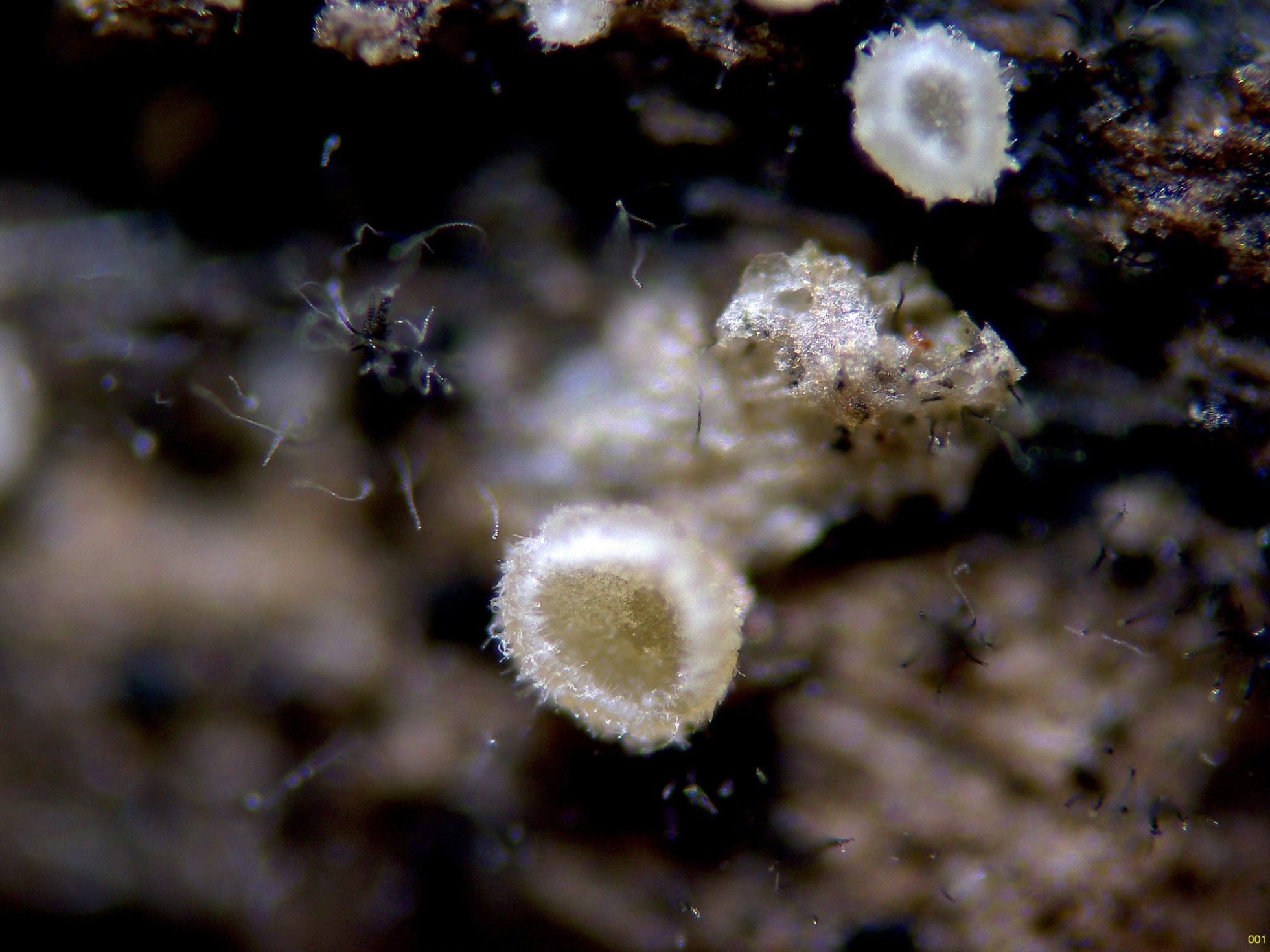 Un pequeño discomiceto blanco fotografiado el 20 de abril, brotando en la superficie de un tronco en descomposición tendido en el suelo, probablemente de roble. Agradecer a Timo Kosonen su ayuda en la determinación de la especie.