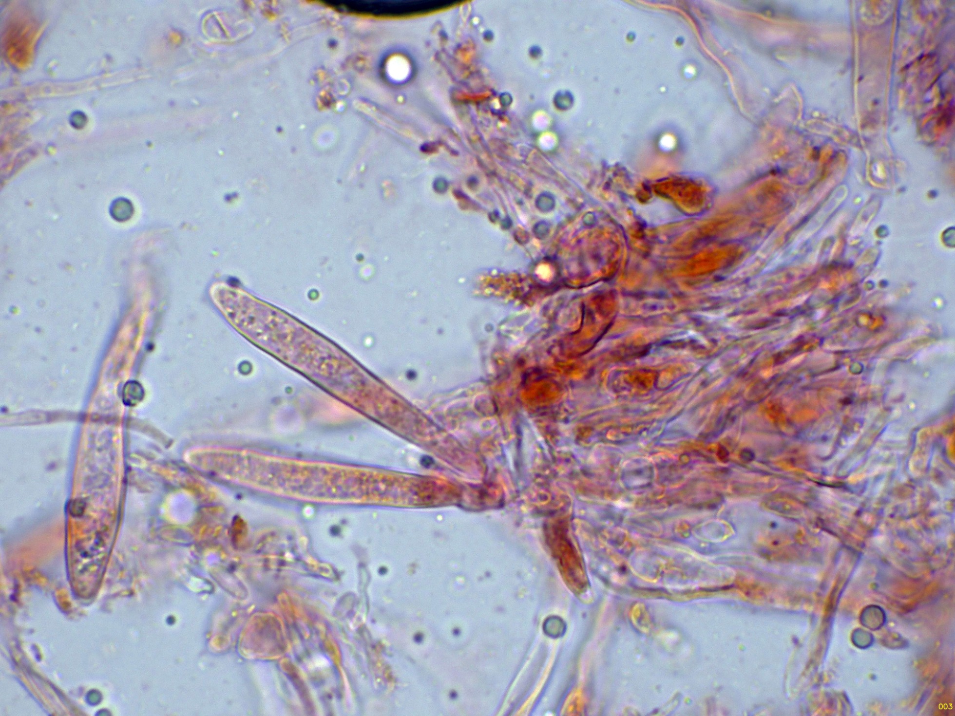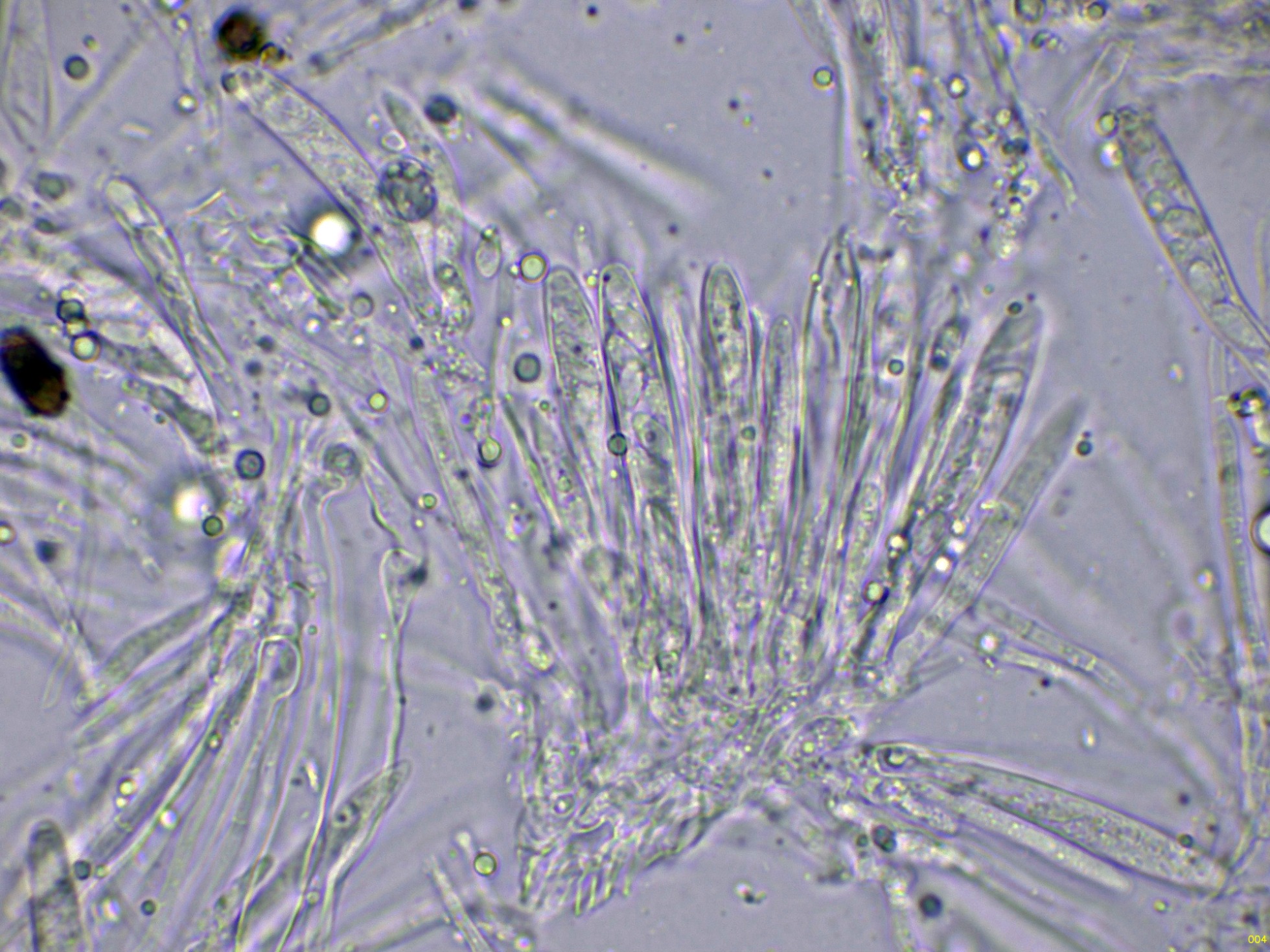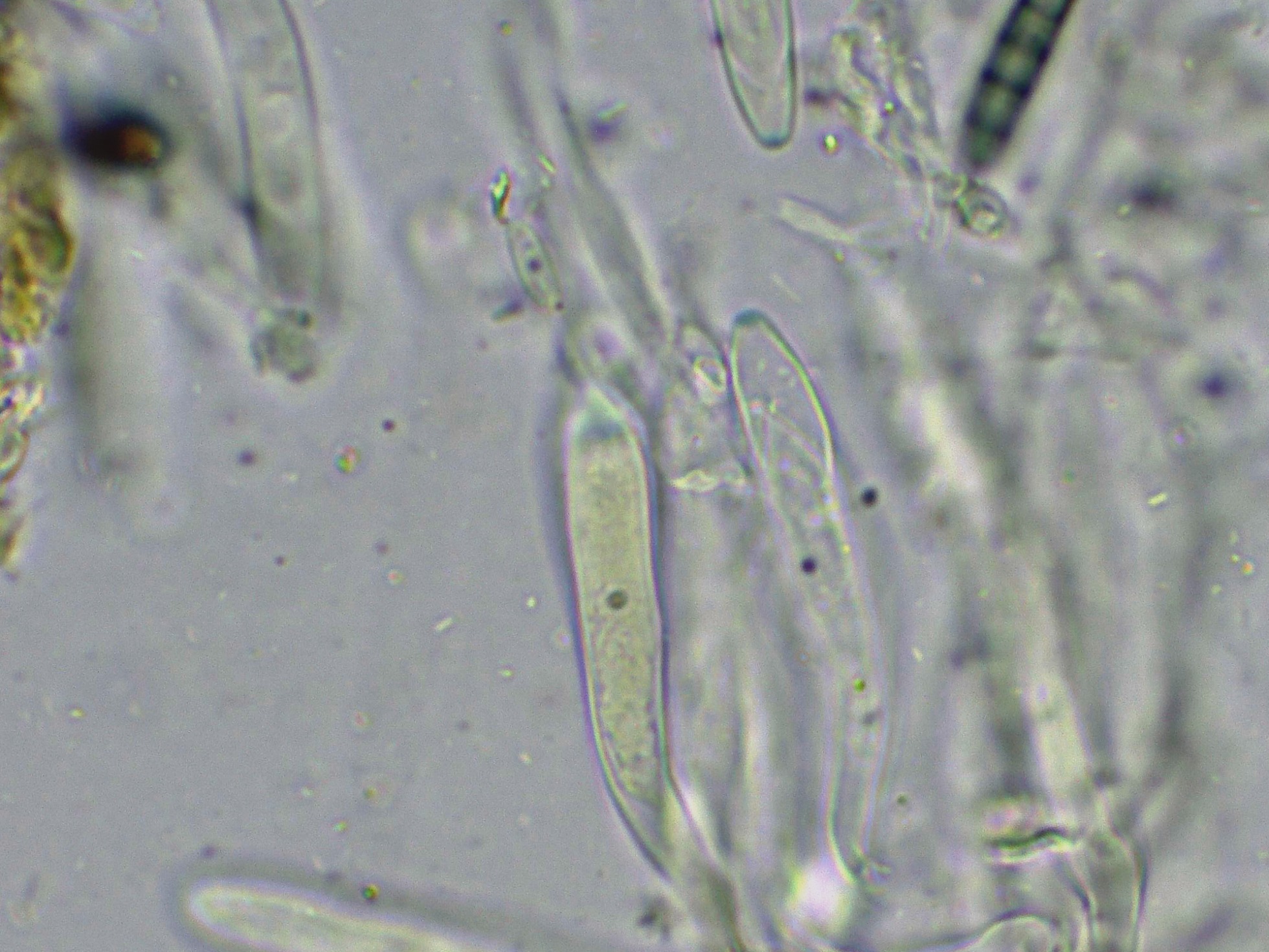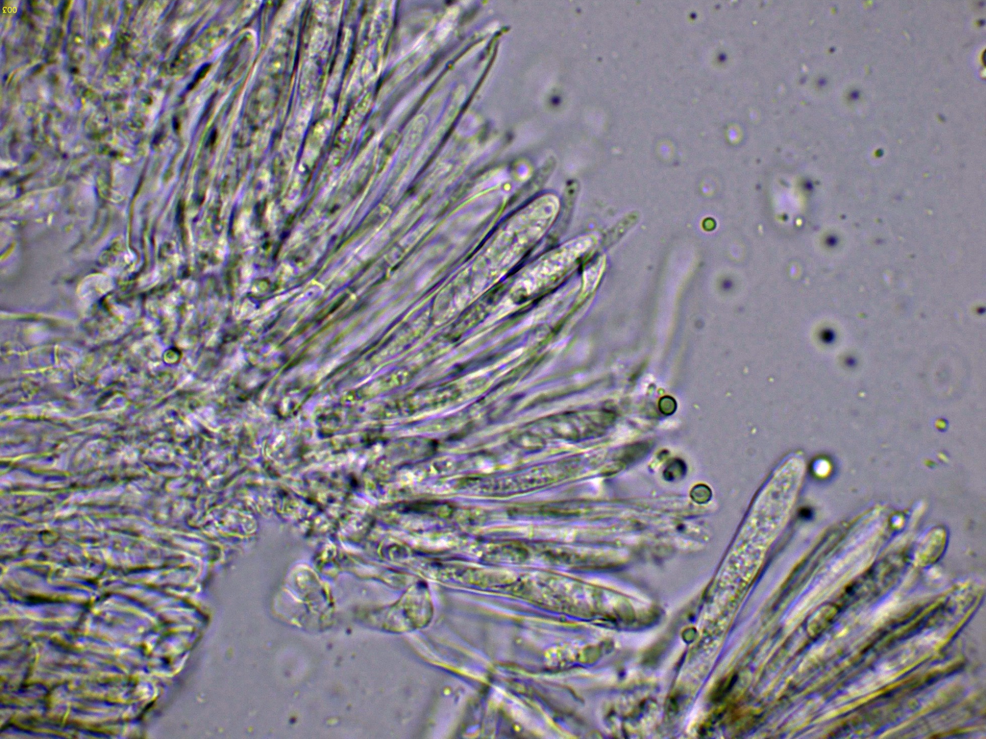 Ascos osctospóricos, aparentemente con uncínulos en sus bases y reacción amiloide de su diminuto aparato apical con el reactivo de Melzer, con unas medidas de 42,9–51,2 × 5–6,5 µm.