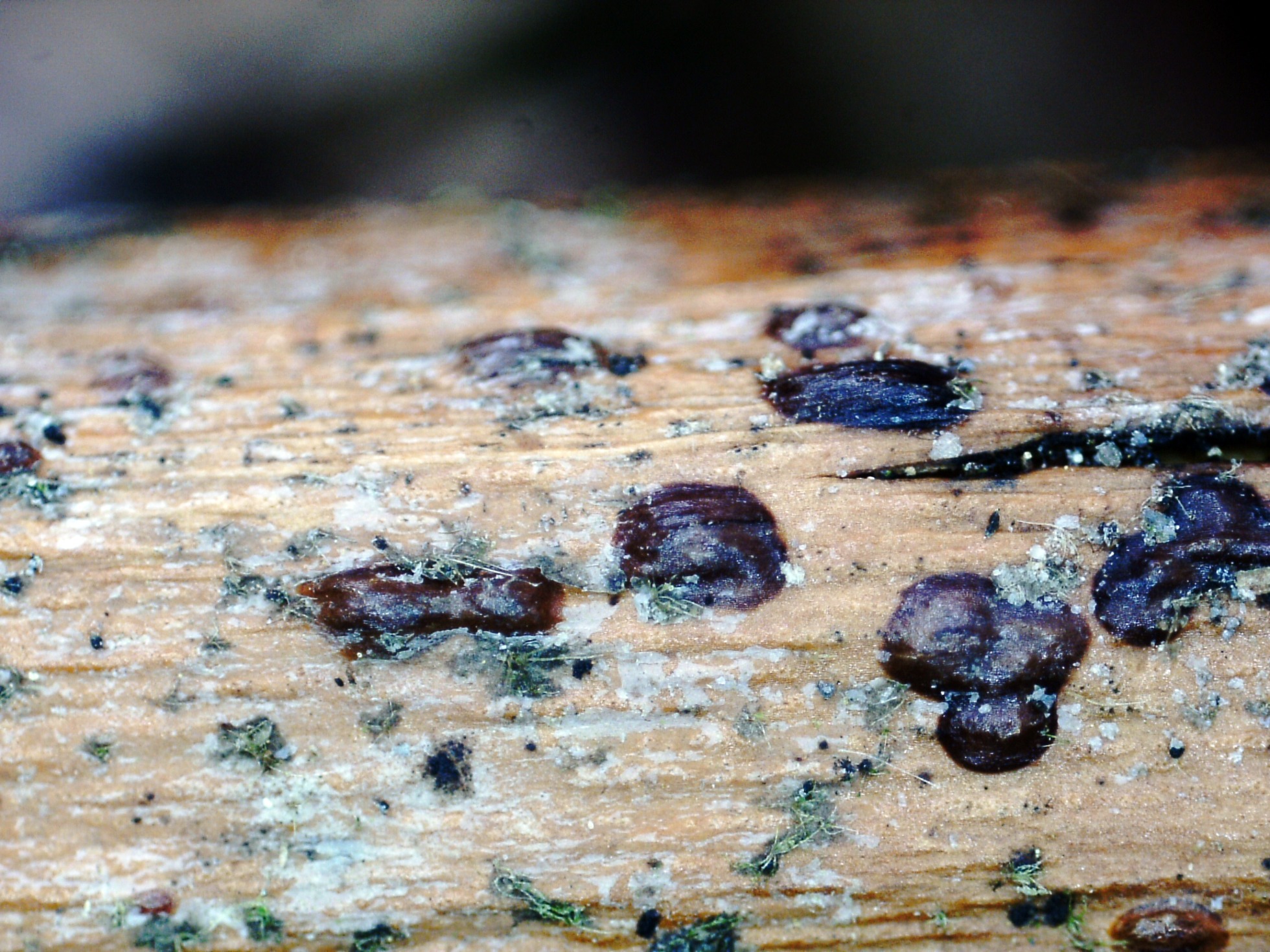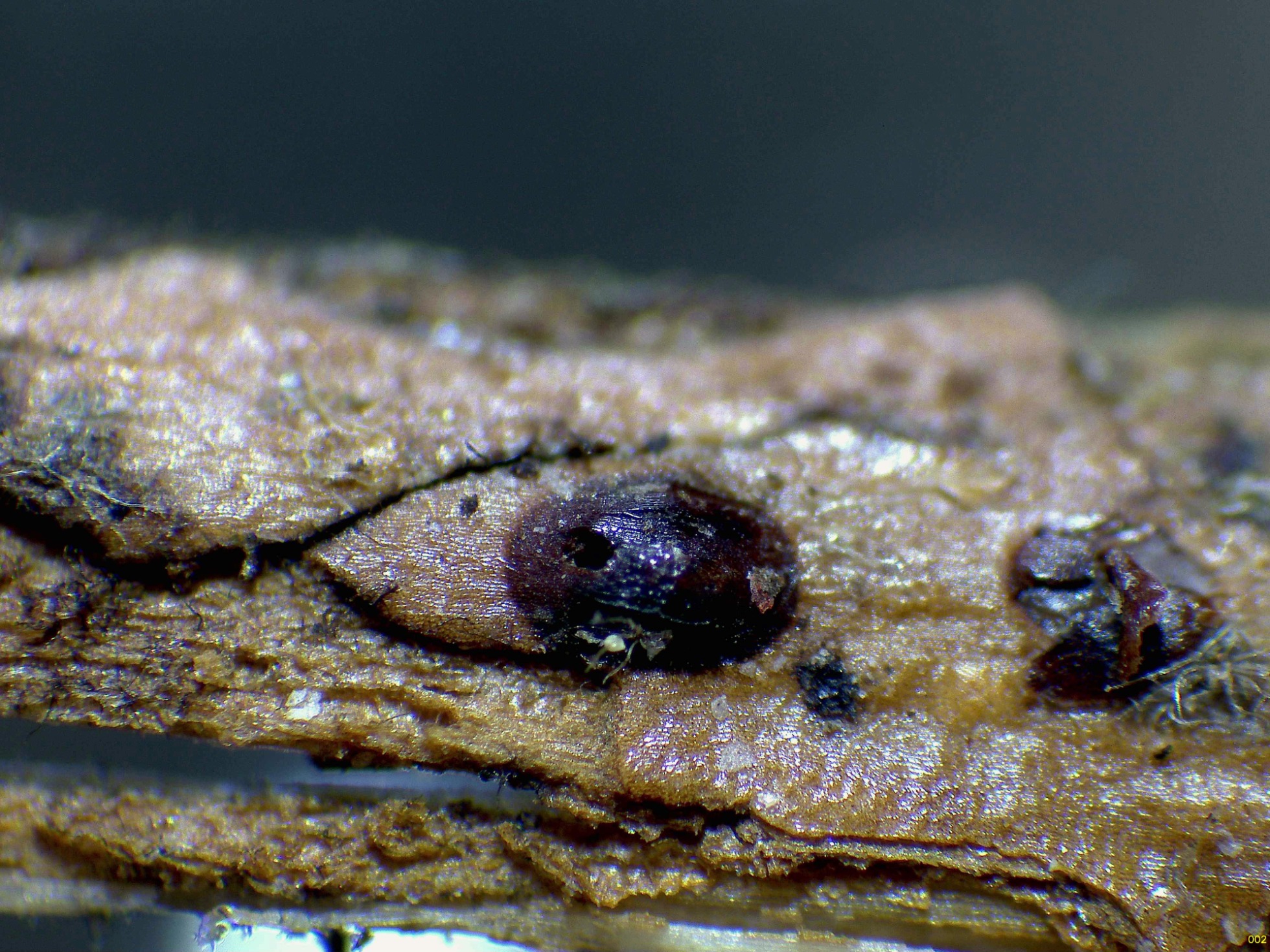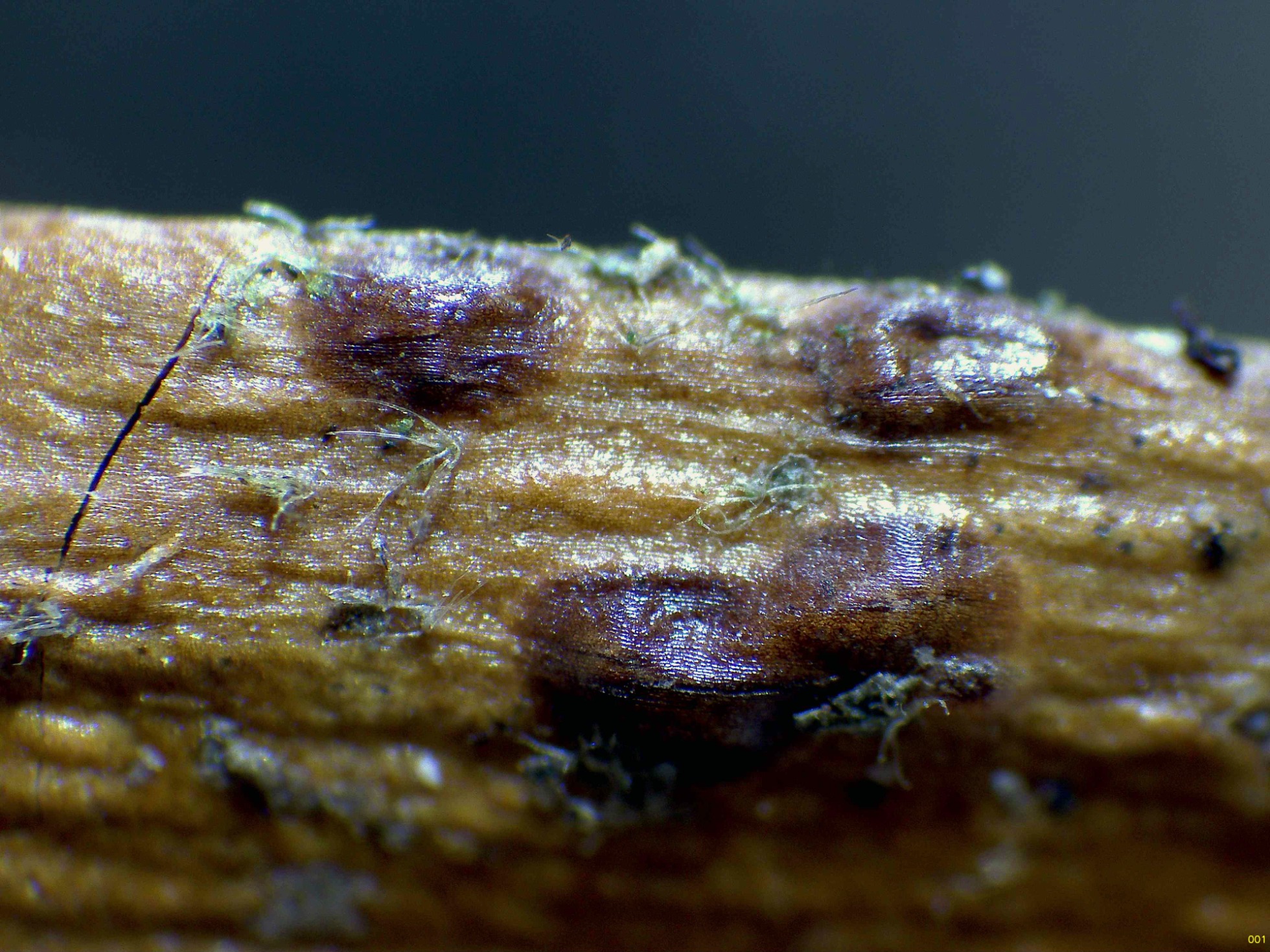Ascomas de color marrón rojizo, con forma de grano, fotografiados el pasado 5 de mayo, con unas medidas de 0,7–0,8 × 0,4–0,6 mm y que brotan de manera dispersa sobre tallos en descomposición de Rubus spp.