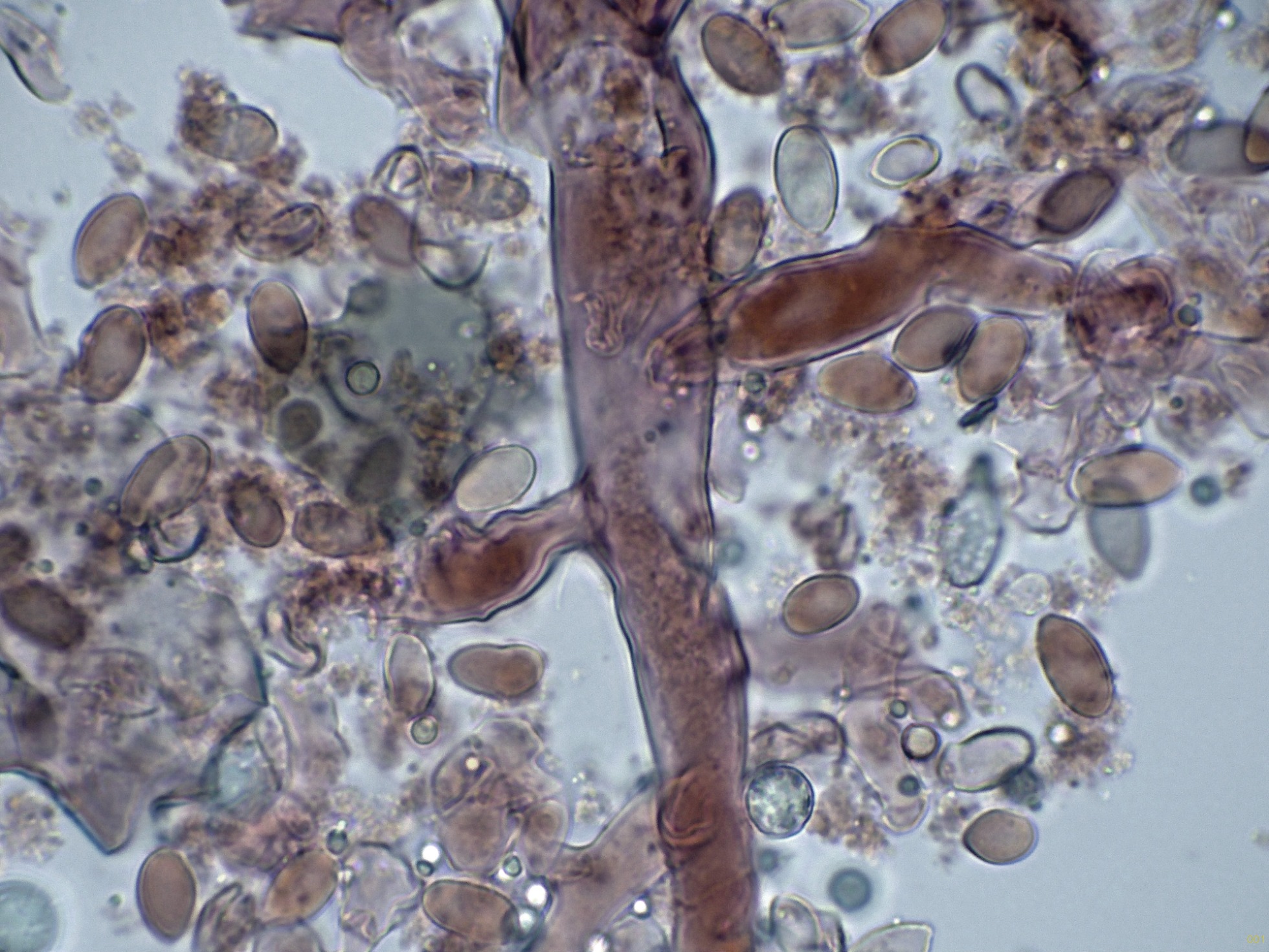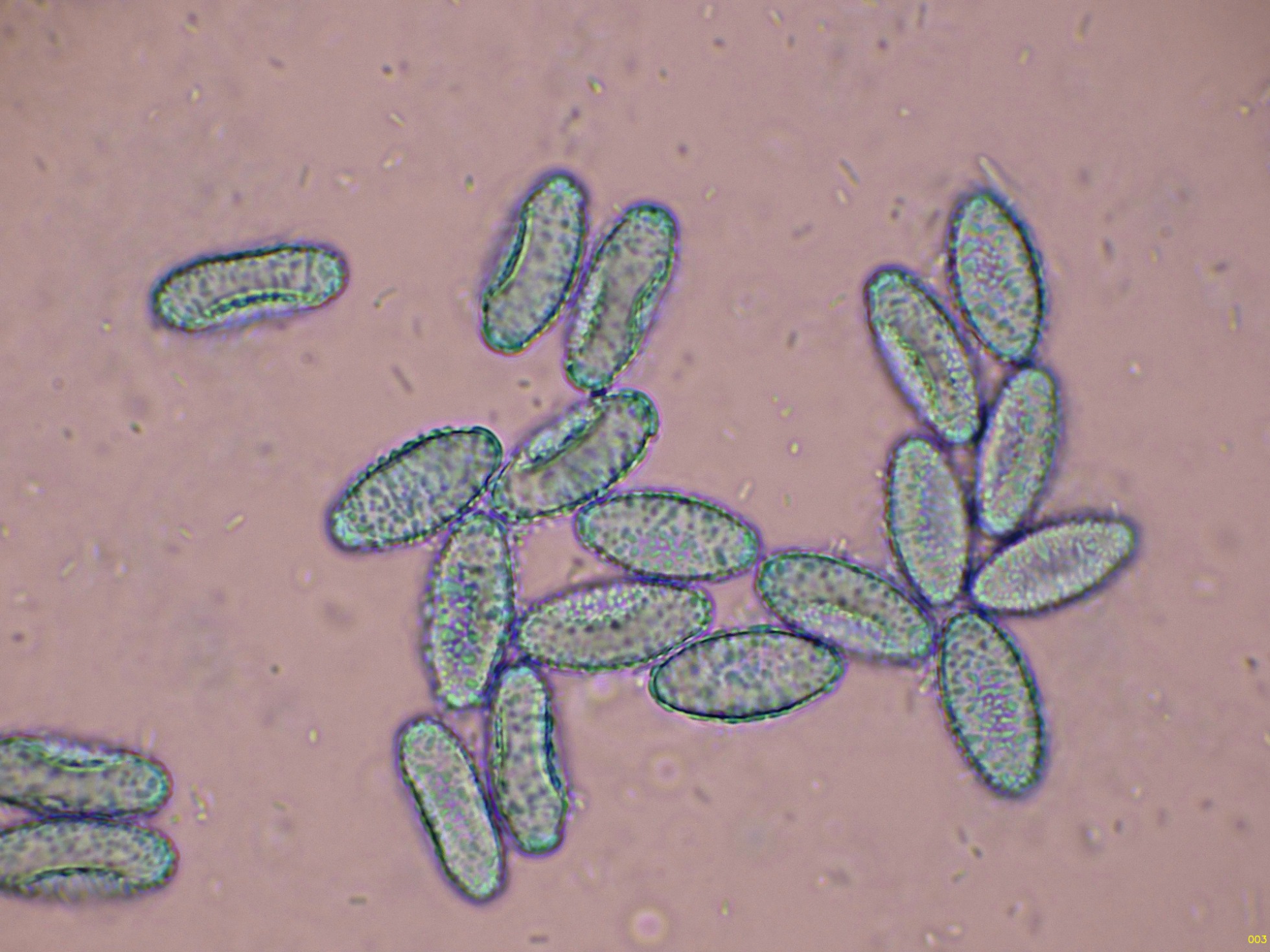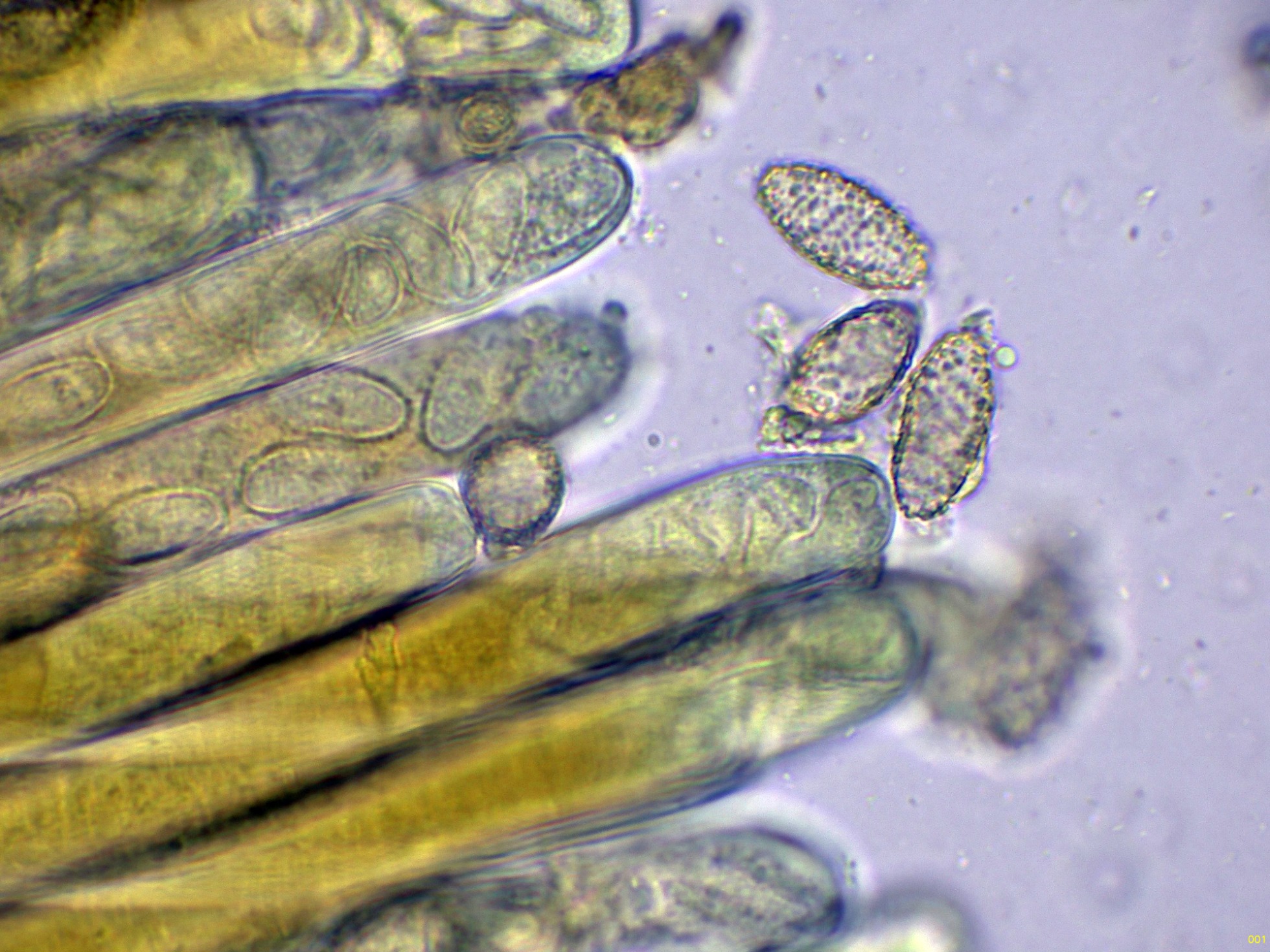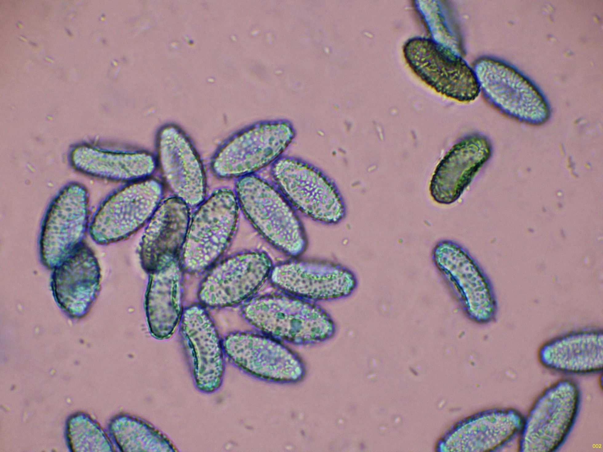 Ascosporas elipsoidales ornamentadas con evidentes verrugas, muy visibles en azul de Cresilo.