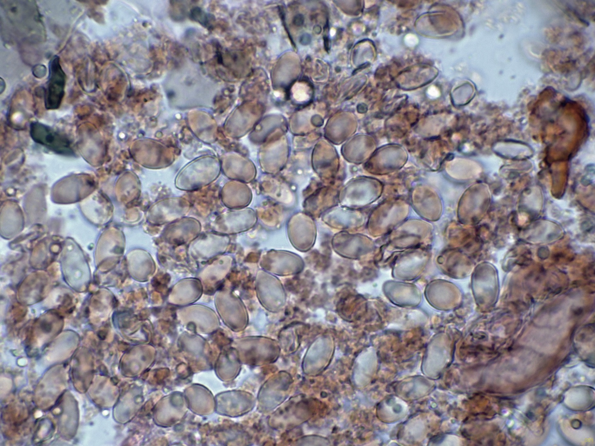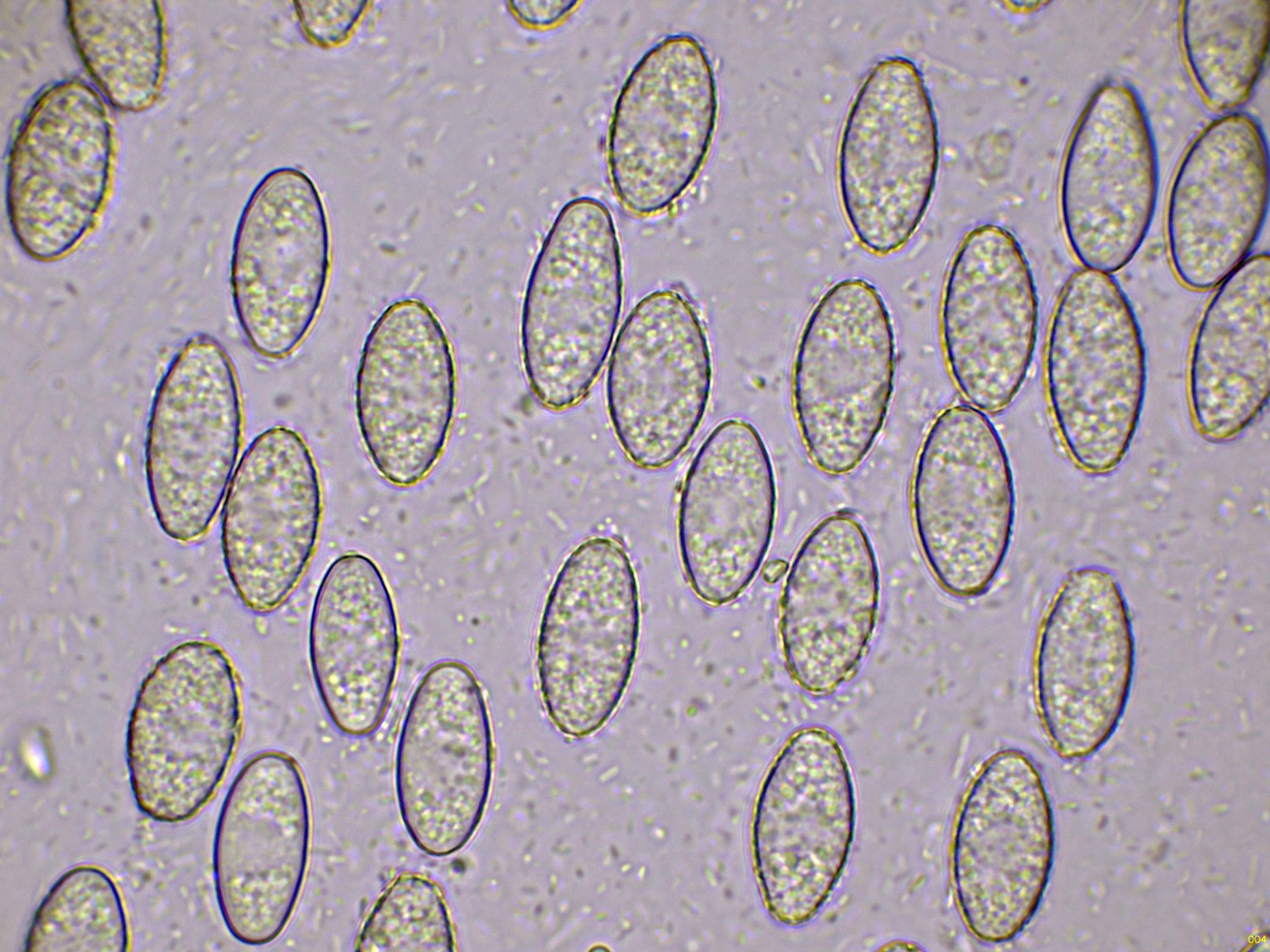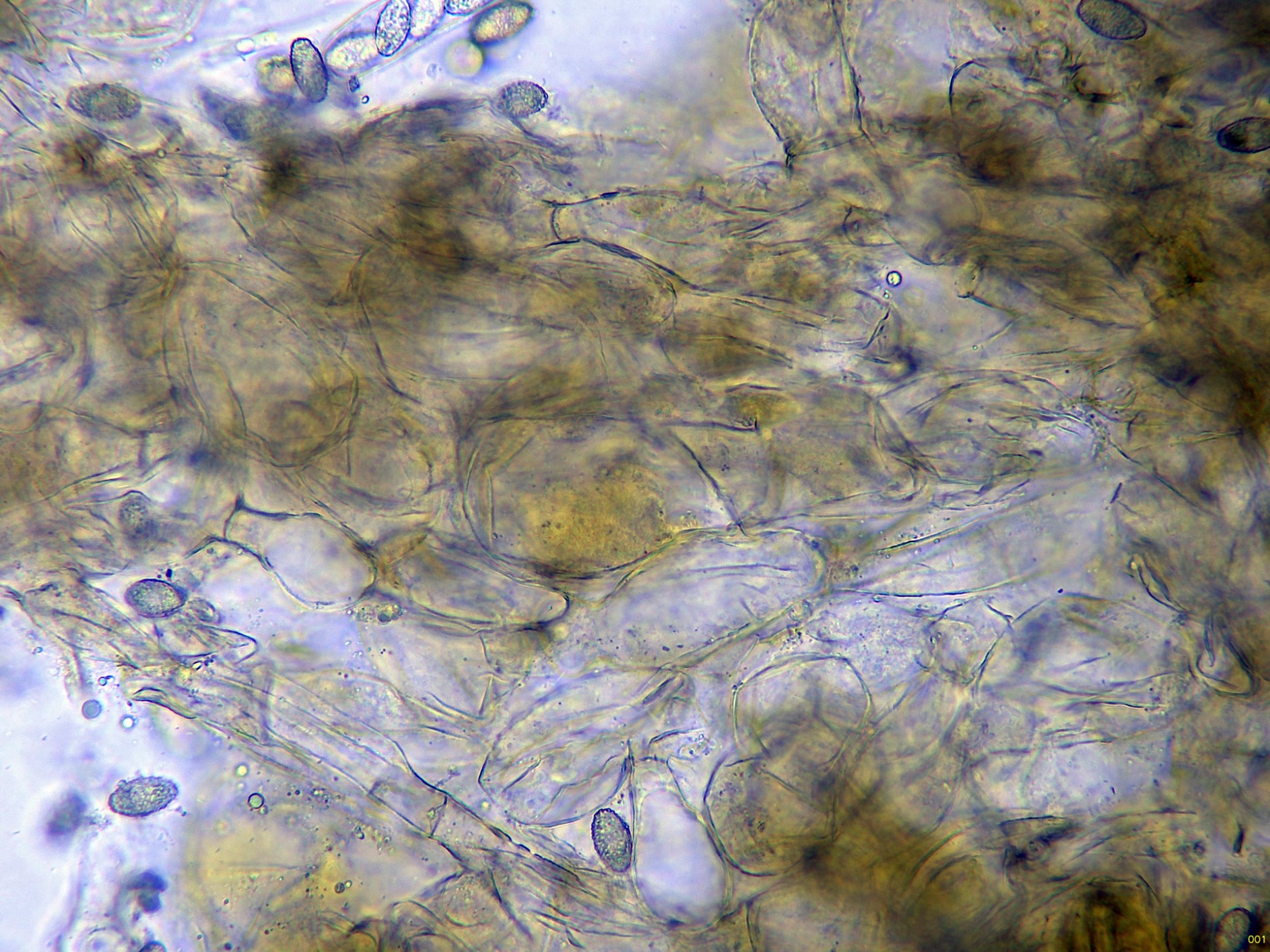 Ascosporas elipsoidales ornamentadas con evidentes verrugas, muy visibles en azul de Cresilo.