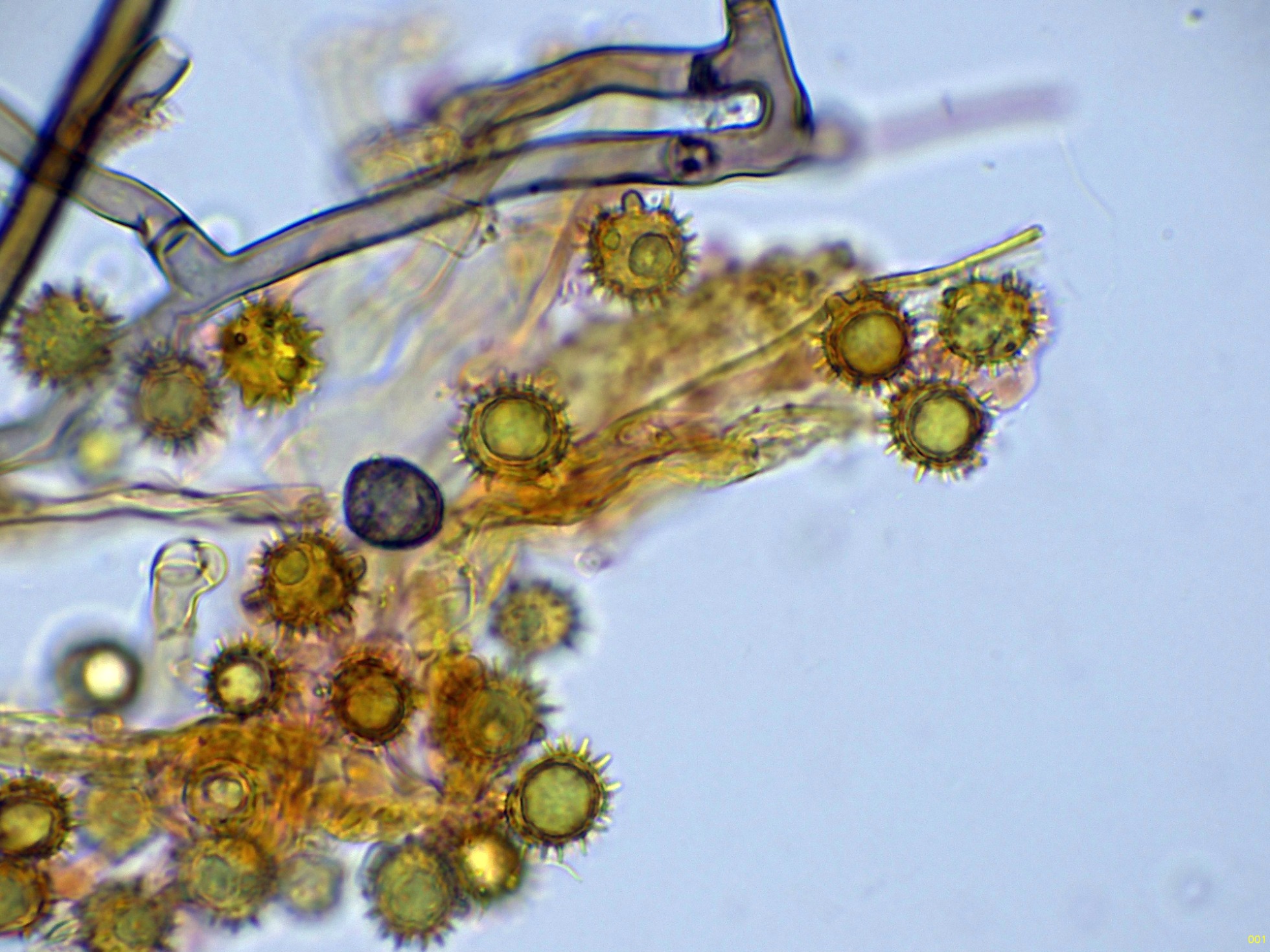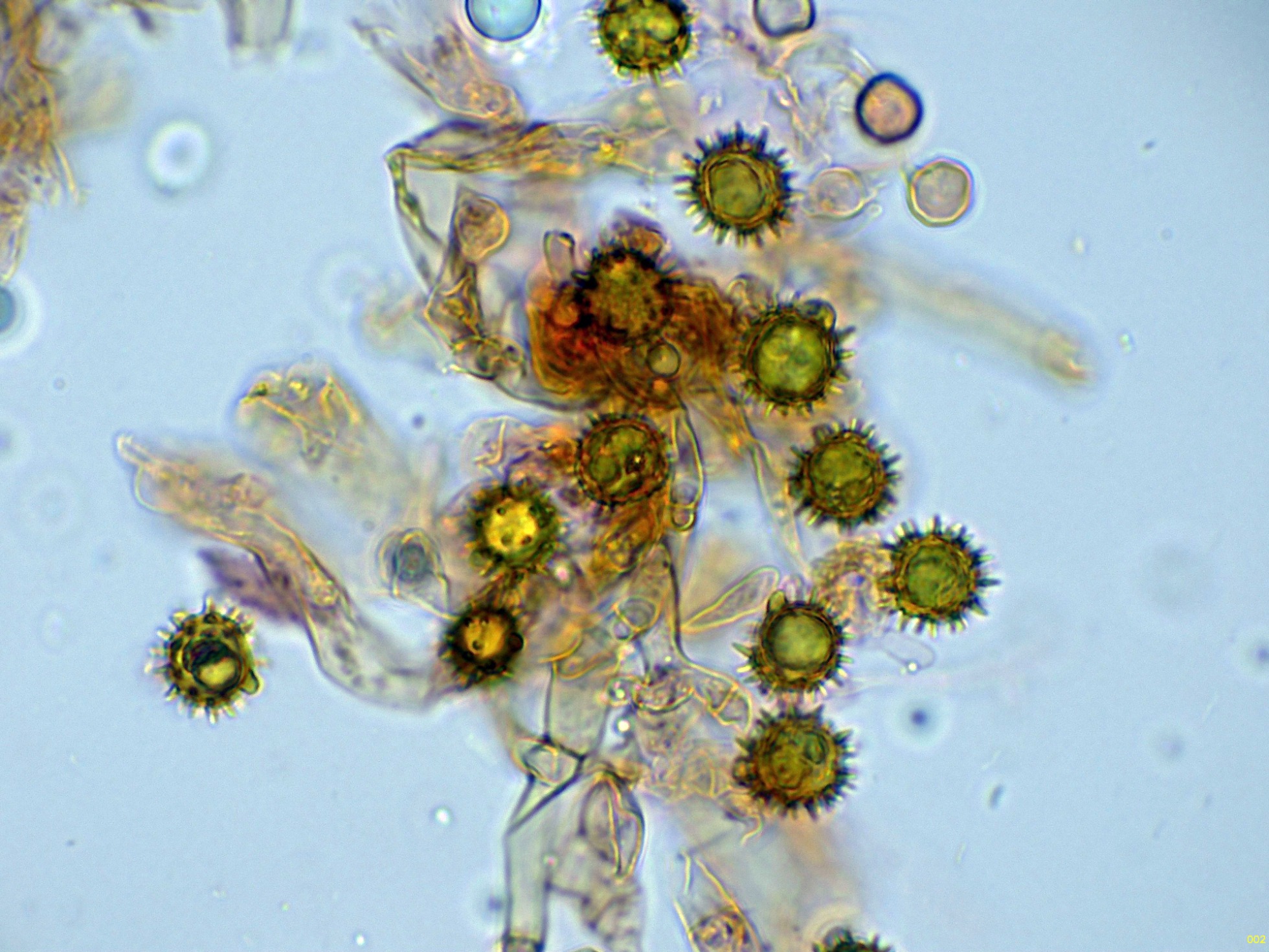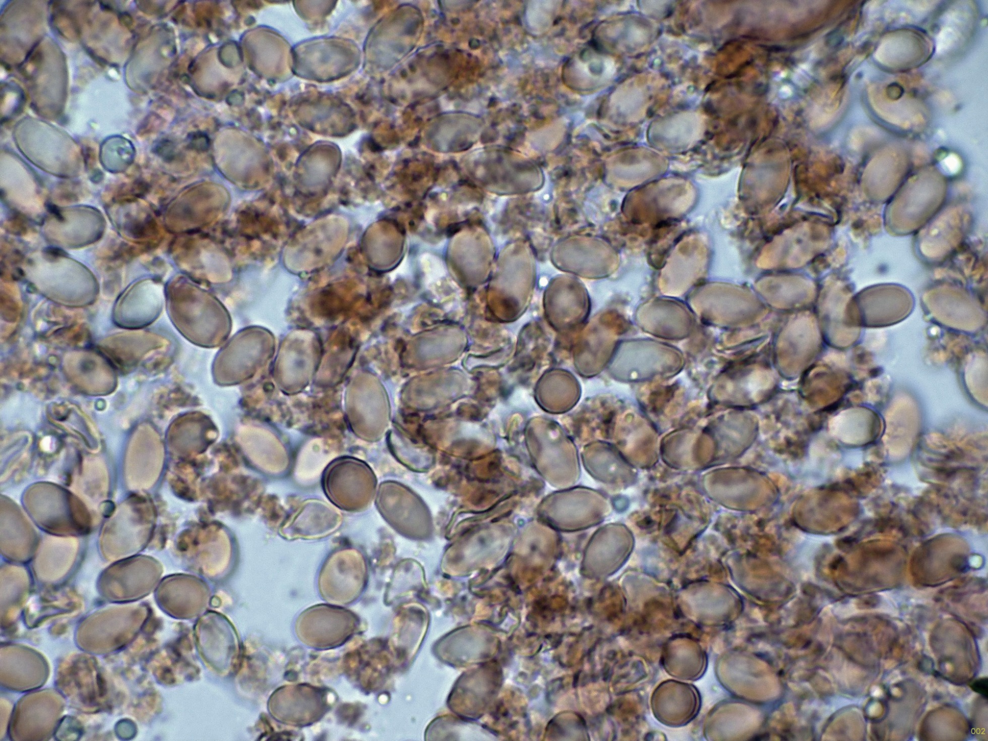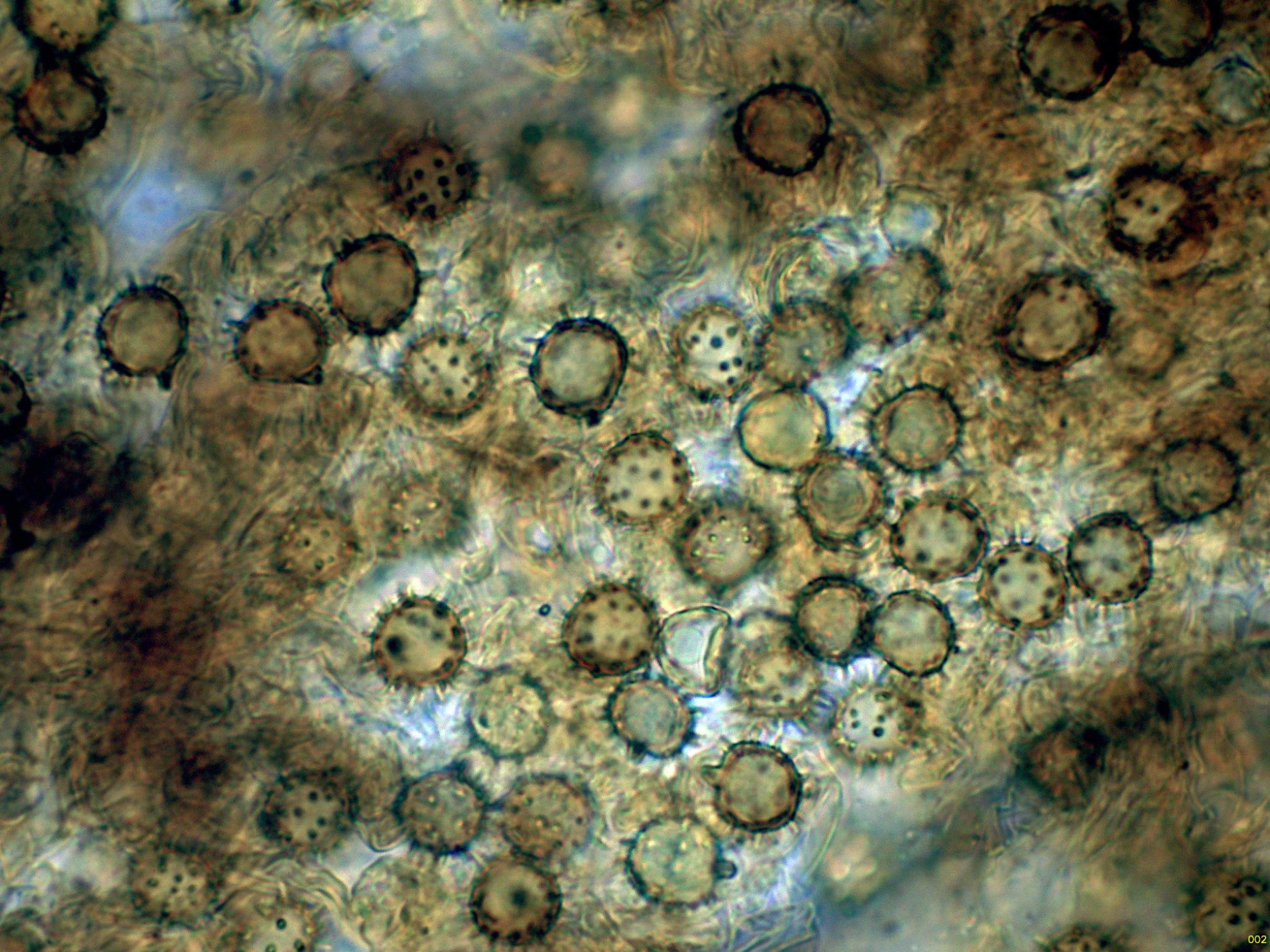 Ascosporas elipsoidales ornamentadas con evidentes verrugas, muy visibles en azul de Cresilo.