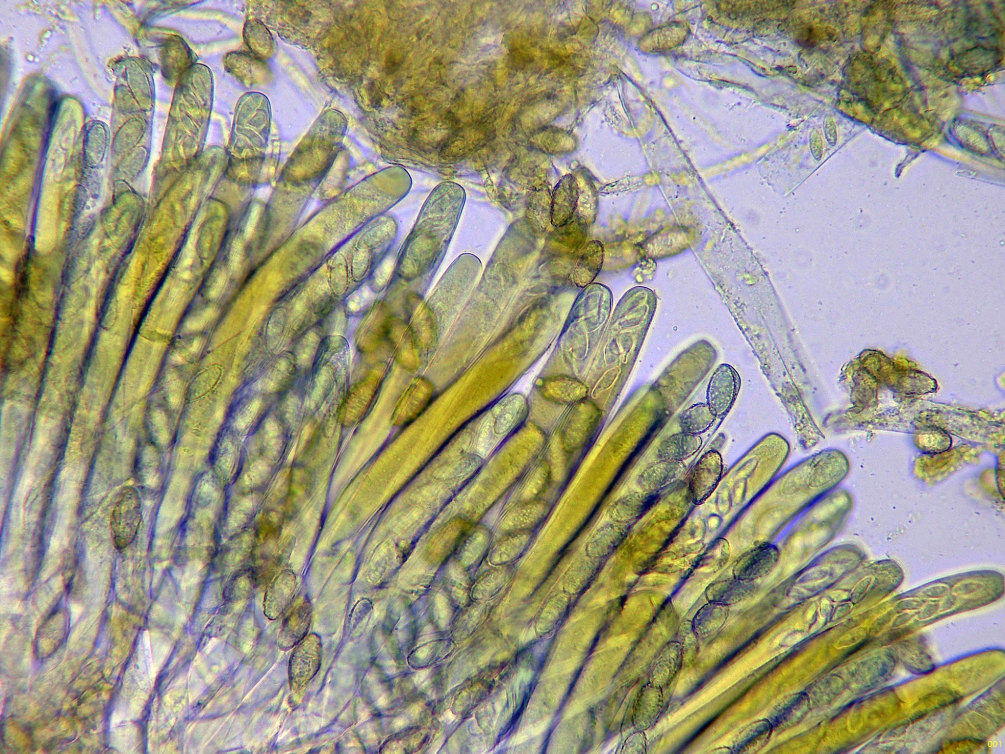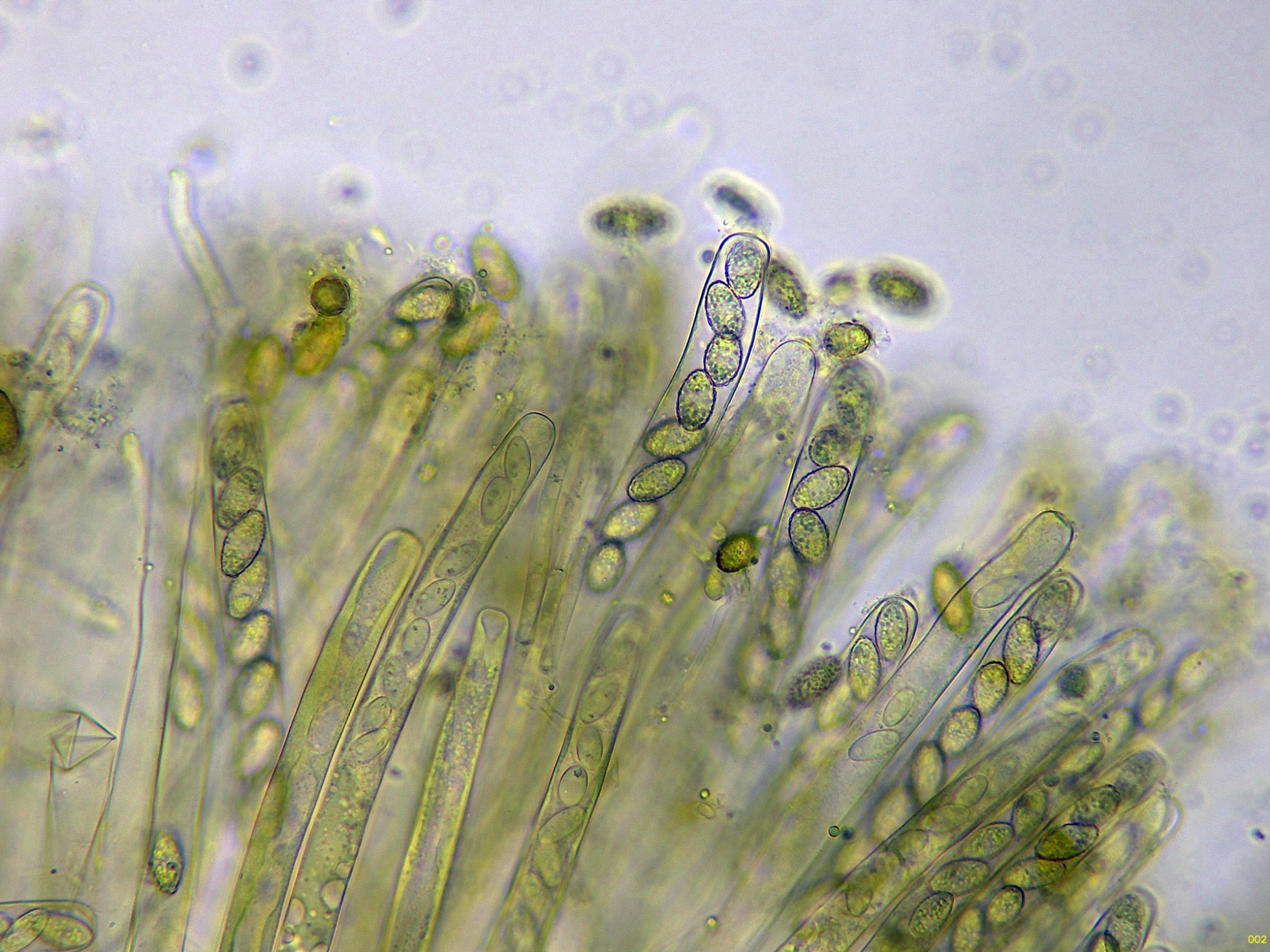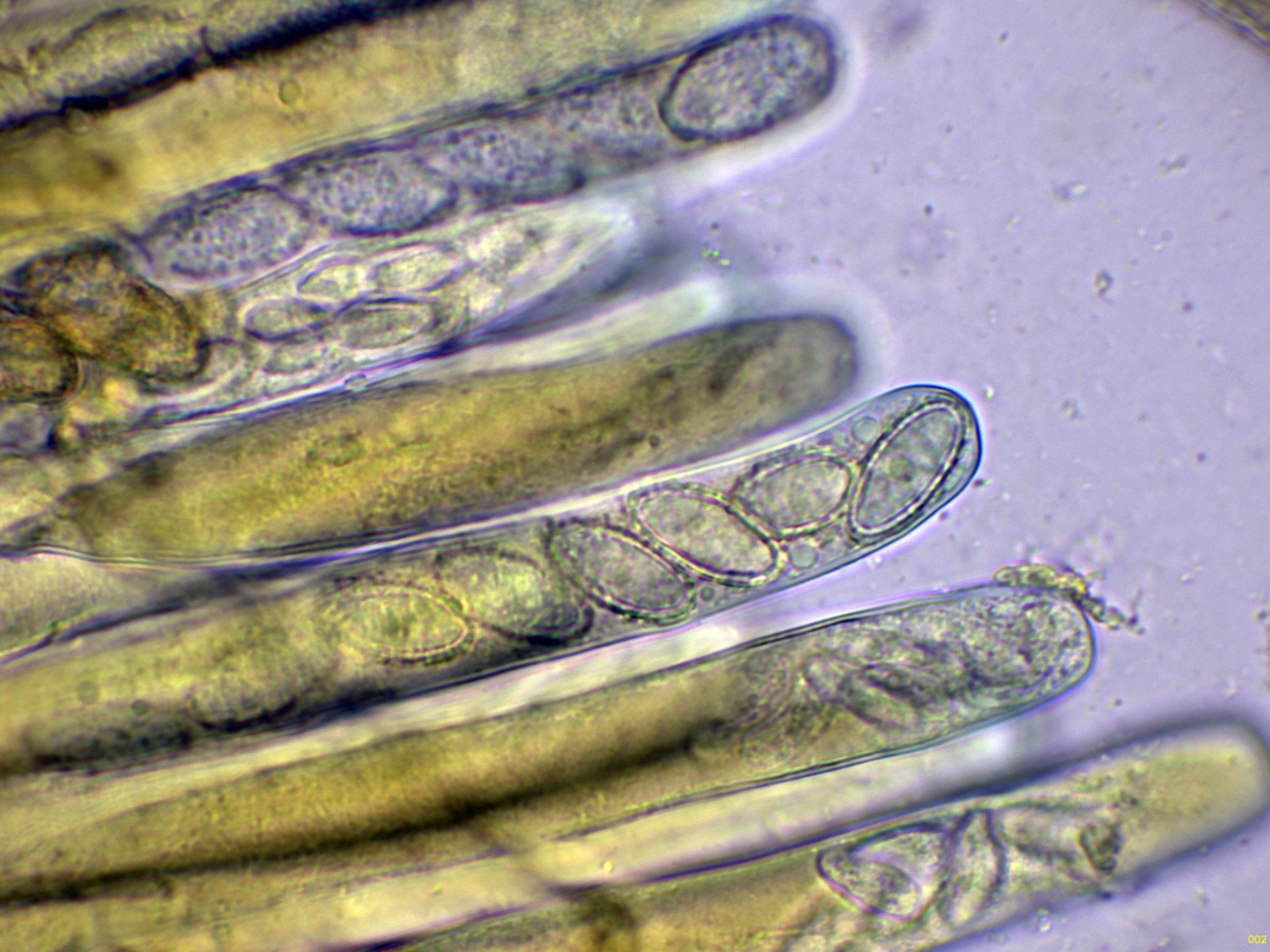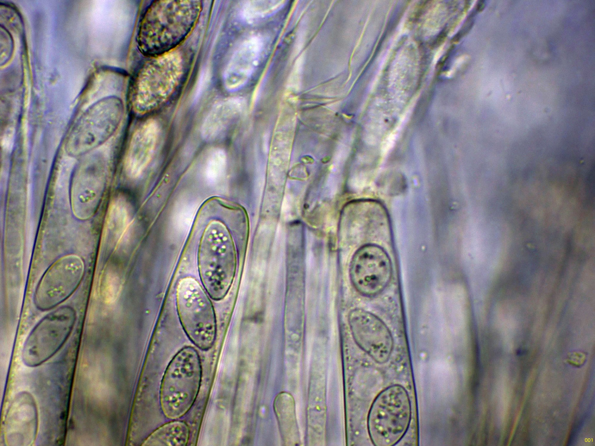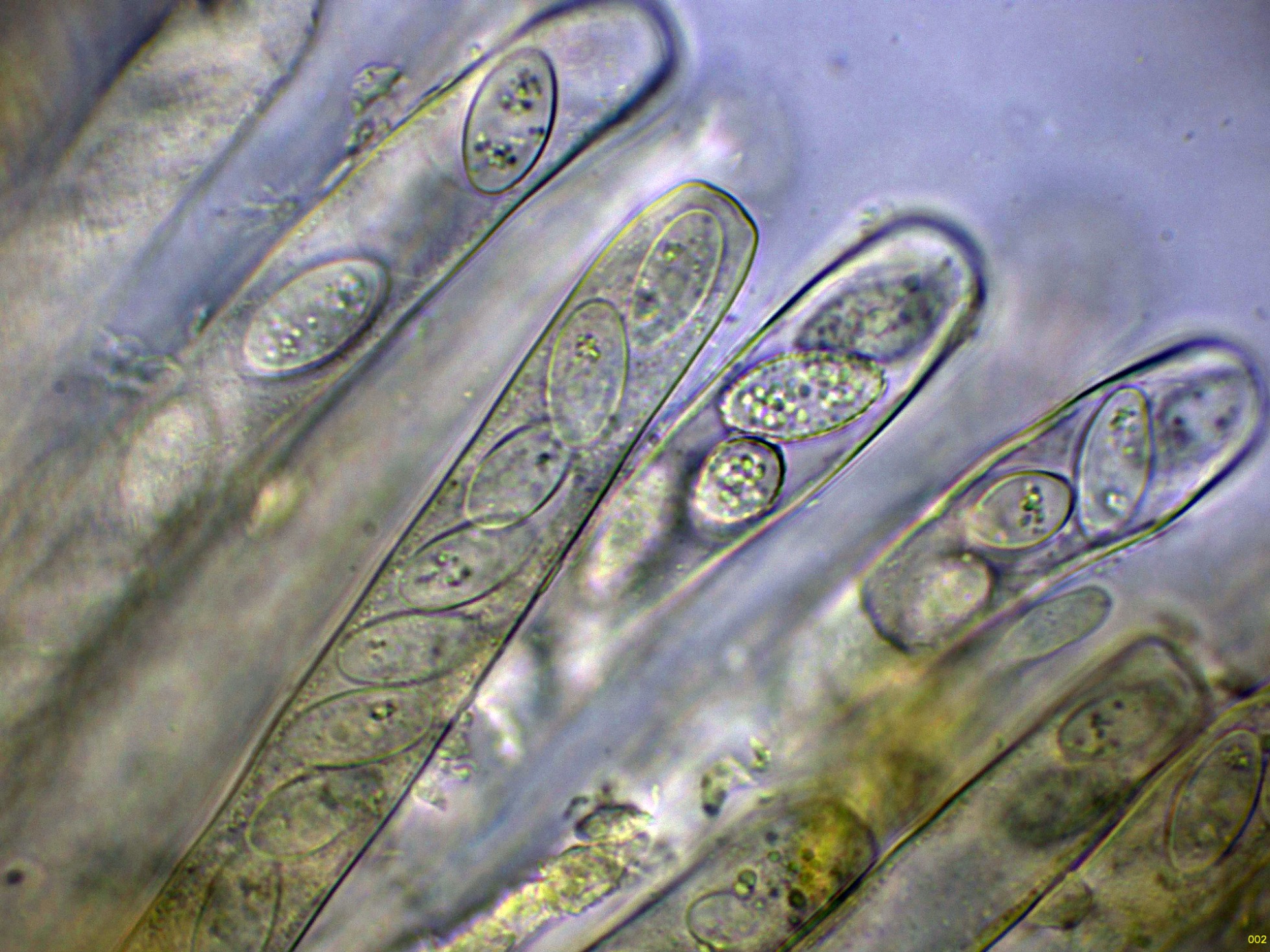 Ascos octospóricos con tan solo una ligera reacción amiloide muy difusa al Reactivo de Melzer: