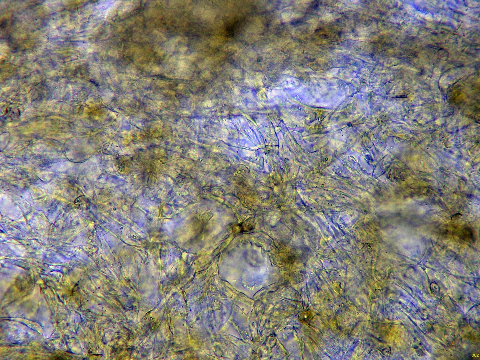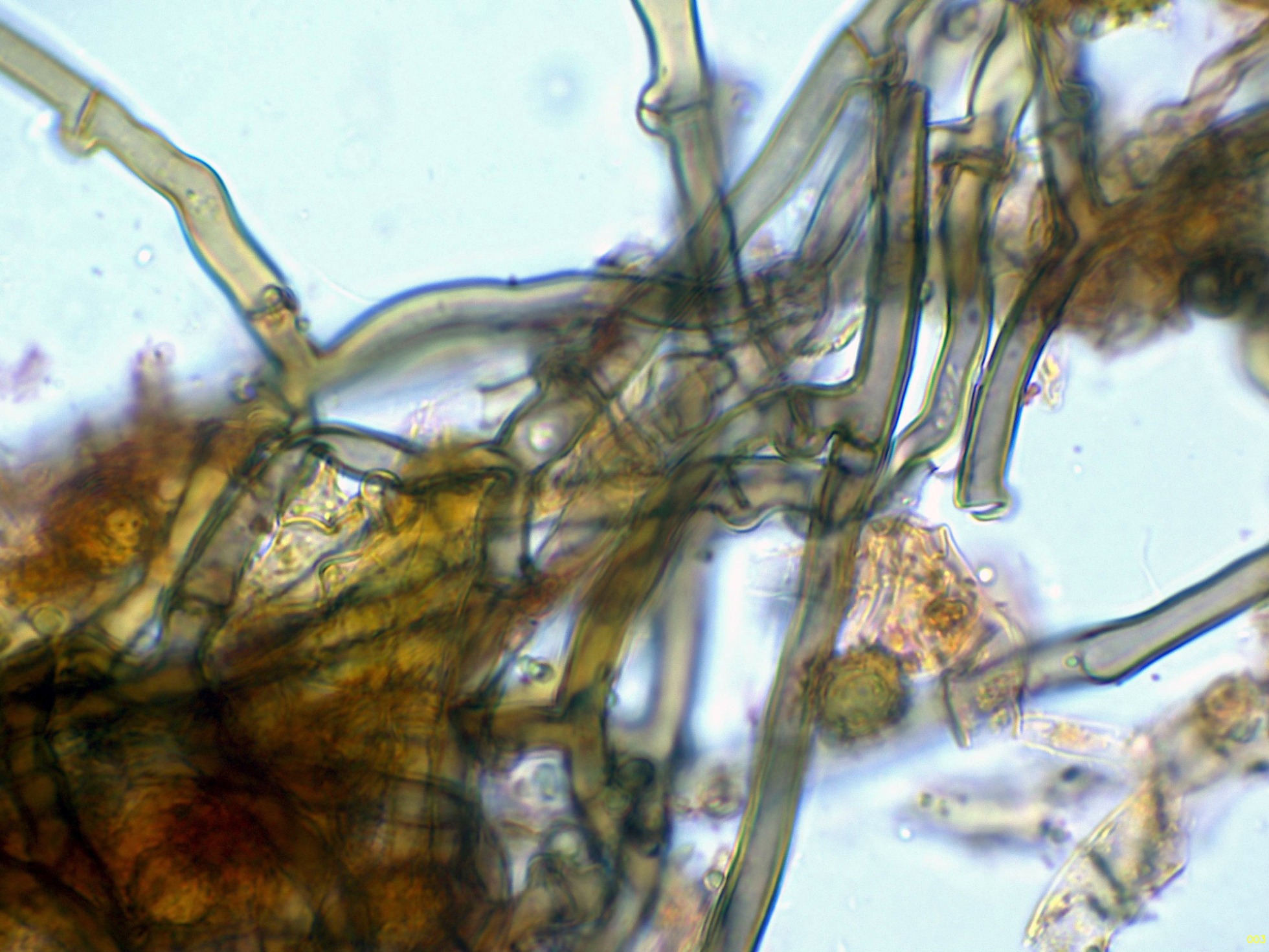 Hifas del excípulo medular filamentosas, de textura intricada con algunos muy evidentes inflamientos.