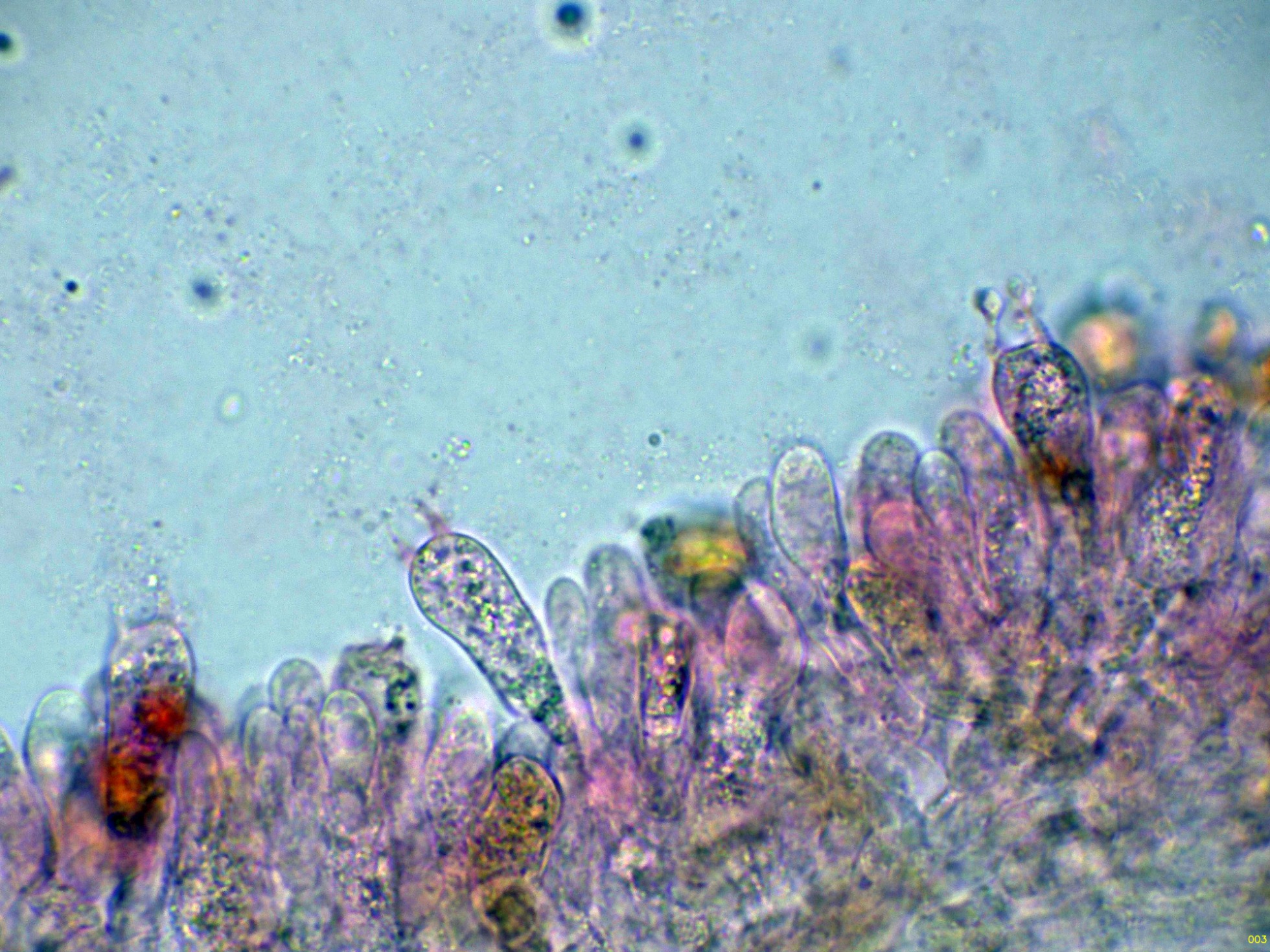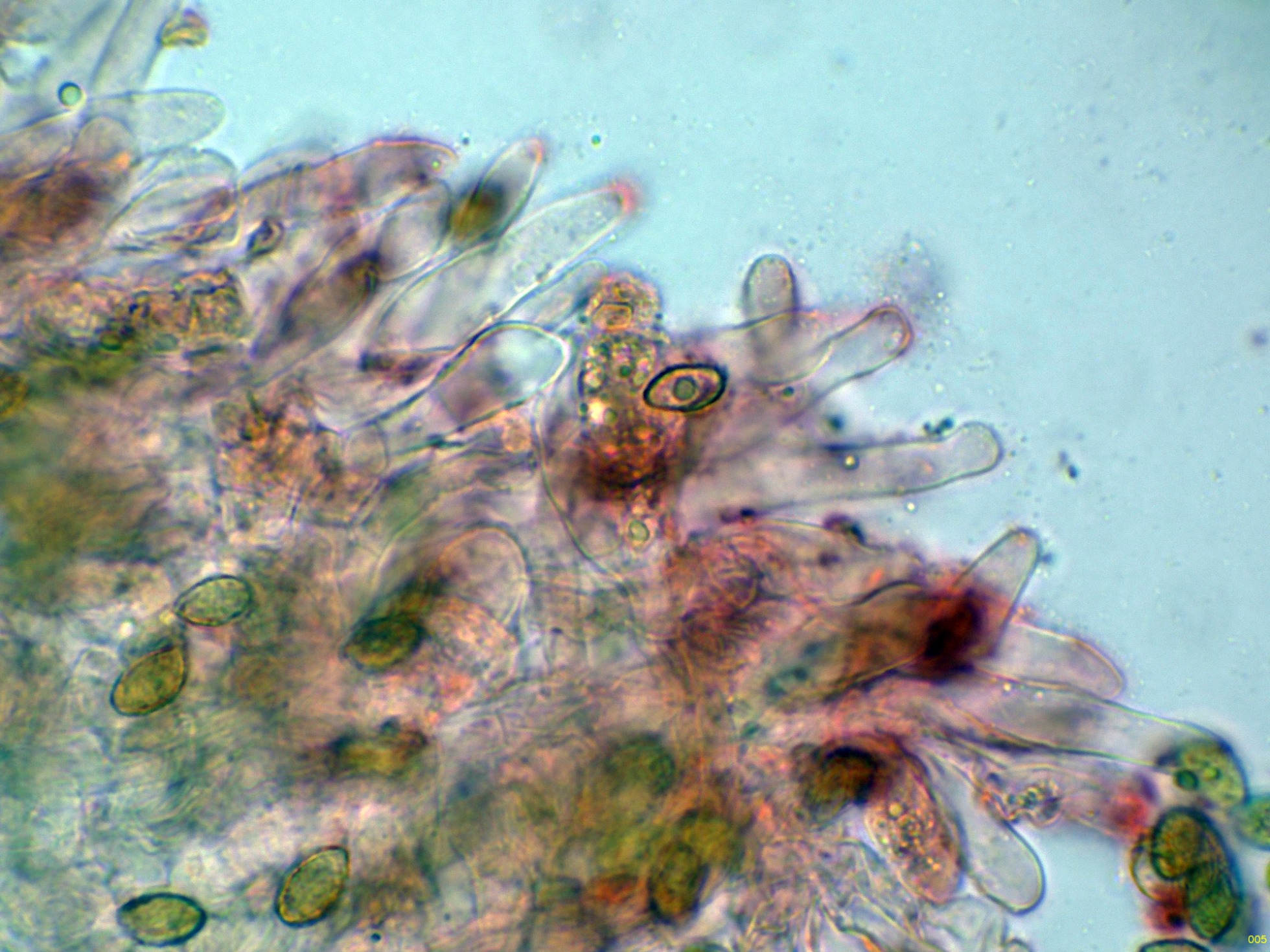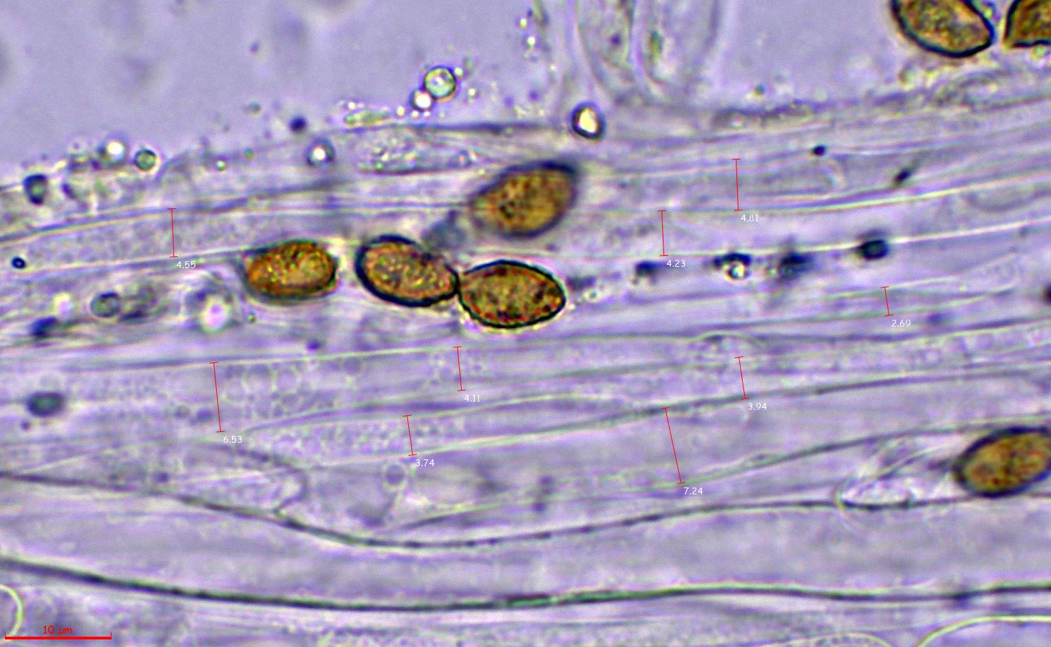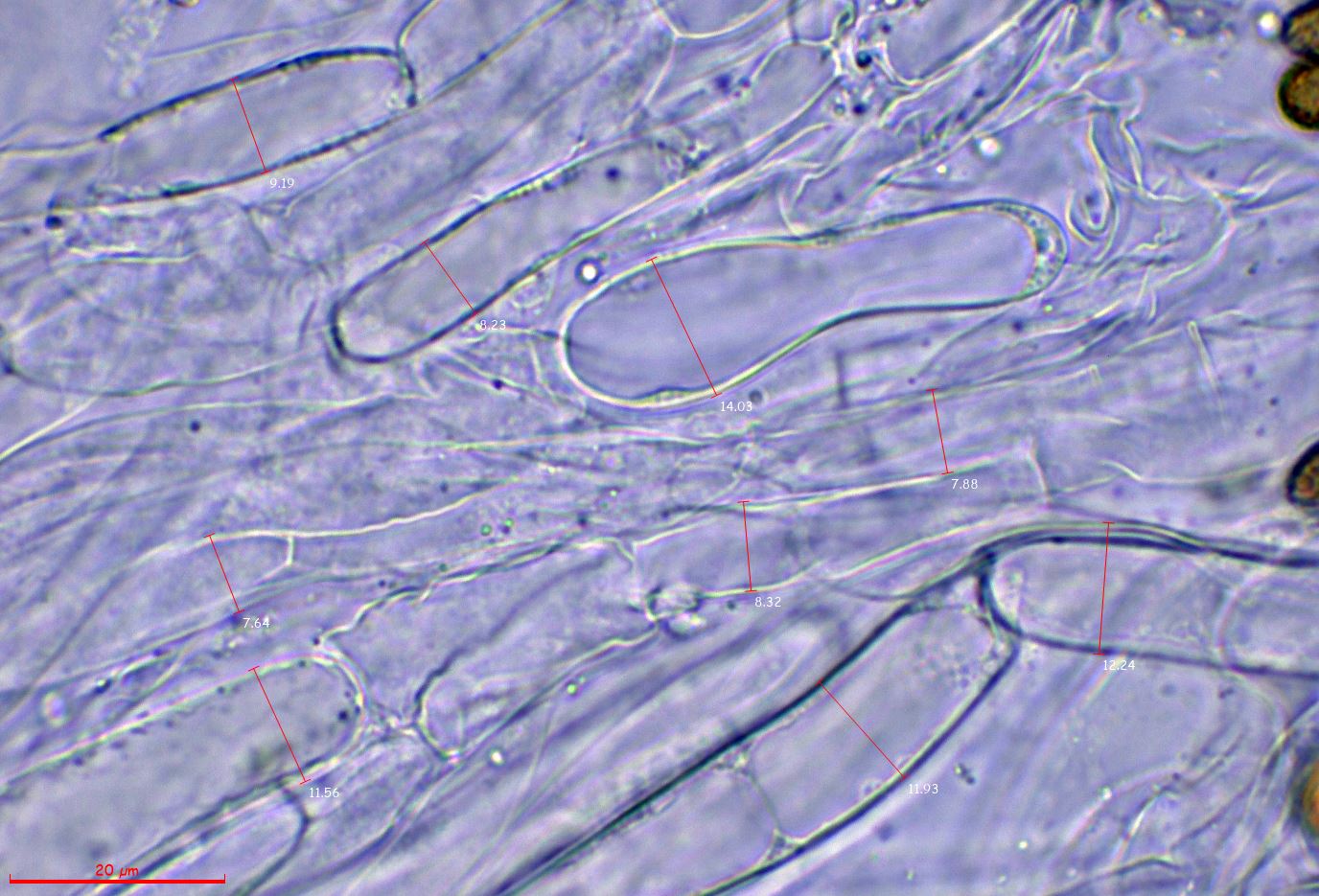 En el documento para las esporas citan unos tamaños de (8) 8,5-9,3-9,5 (10,5) x (5) 5,5-5,95-6,5 μm. Q = (1,45) 1,50-1,60 (1,70), prácticamente calcadas en mis mediciones de (8.1) 8.6 - 10.2 (10.6) × (5.2) 5.4 - 6.2 (6.7) µm. Q = 1.5 - 1.7 (1.8) ; N = 40 Me = 9.2 × 5.7 µm; Qe = 1.6. Para los basidios citan unos tamaños de 30-35 x 10-11 μm. y en mis mediciones el resultado ha sido de (28.8) 30.3 - 34.3 (35.8) × (8.7) 9.9 - 10.9 (12.3) µm., unas medidas prácticamente idénticas. Para las células estériles de la arista laminar dan unas medidas de 18-26 x 7-10 μm, y en mi caso con unas medidas de (17) 18.8 - 34.3 (34.6) × (6.1) 6.2 - 9.8 (10.2) estas medidas se encuentran por encimas de las que se citan en el artículo, aunque no de una forma muy significativa. En lo que respecta a las hifas de la suprapellis y de la subpellis, en el artículo dan unas medidas para la anchura de las hifas de la suprapellis de 4 a 7 μm. y en mi estudio sale una media de entre 3,9 a 6,2 μm. tamaños muy concordantes, así como las de la subpellis con unas medidas en anchura de entre 8,3 a 12,4 μm., que aunque no lo citen en el artículo, si que admiten que los elementos son más cortos y anchos.