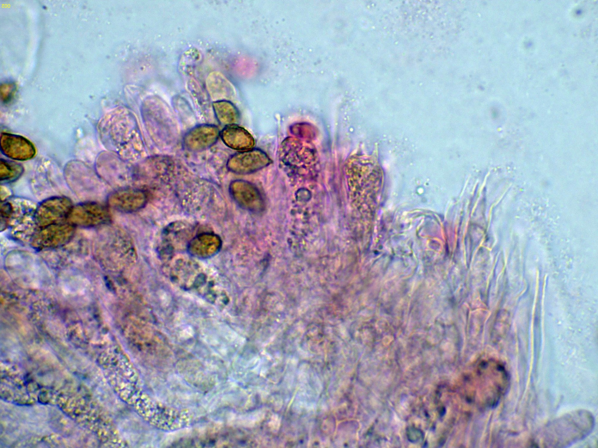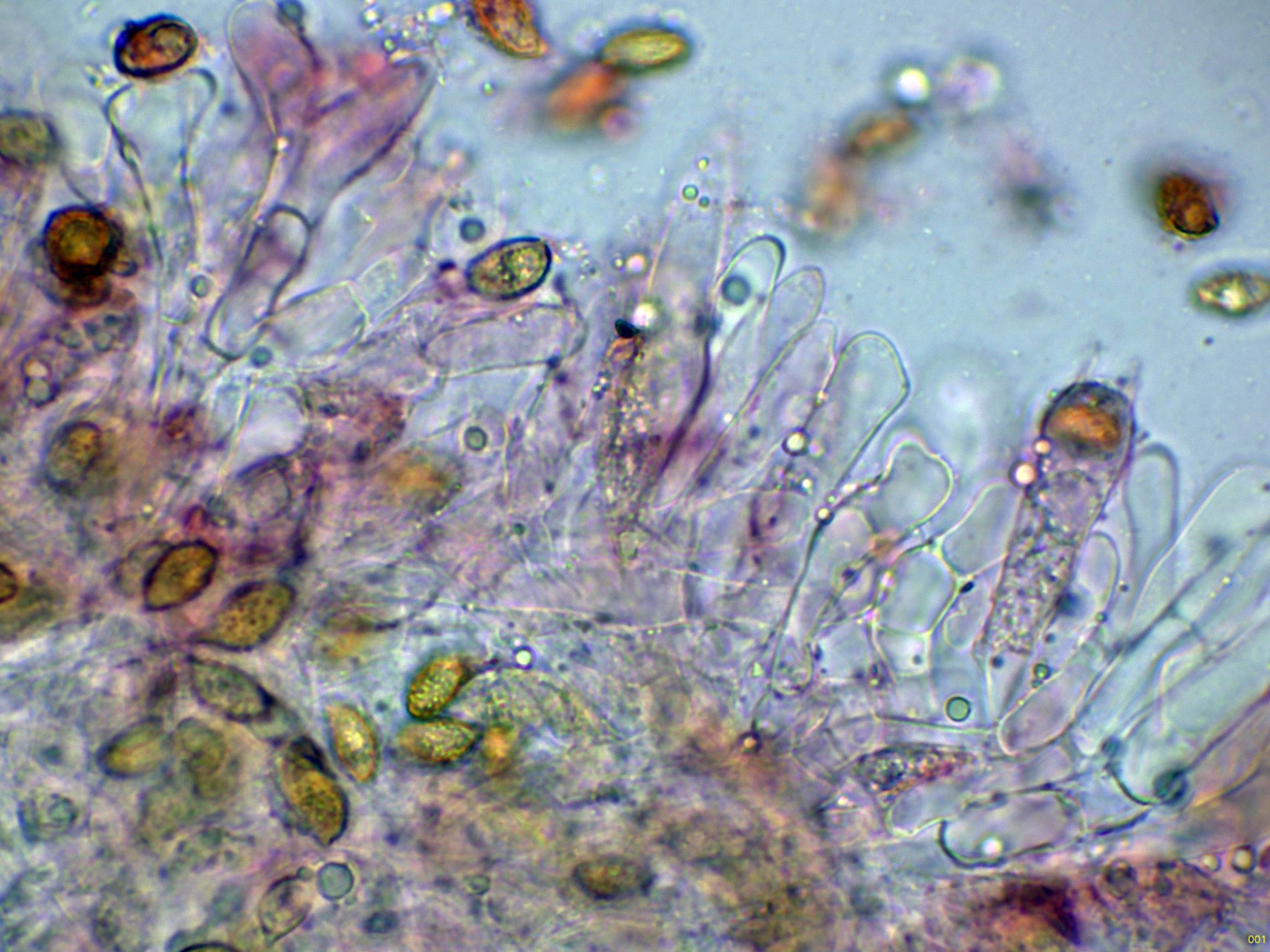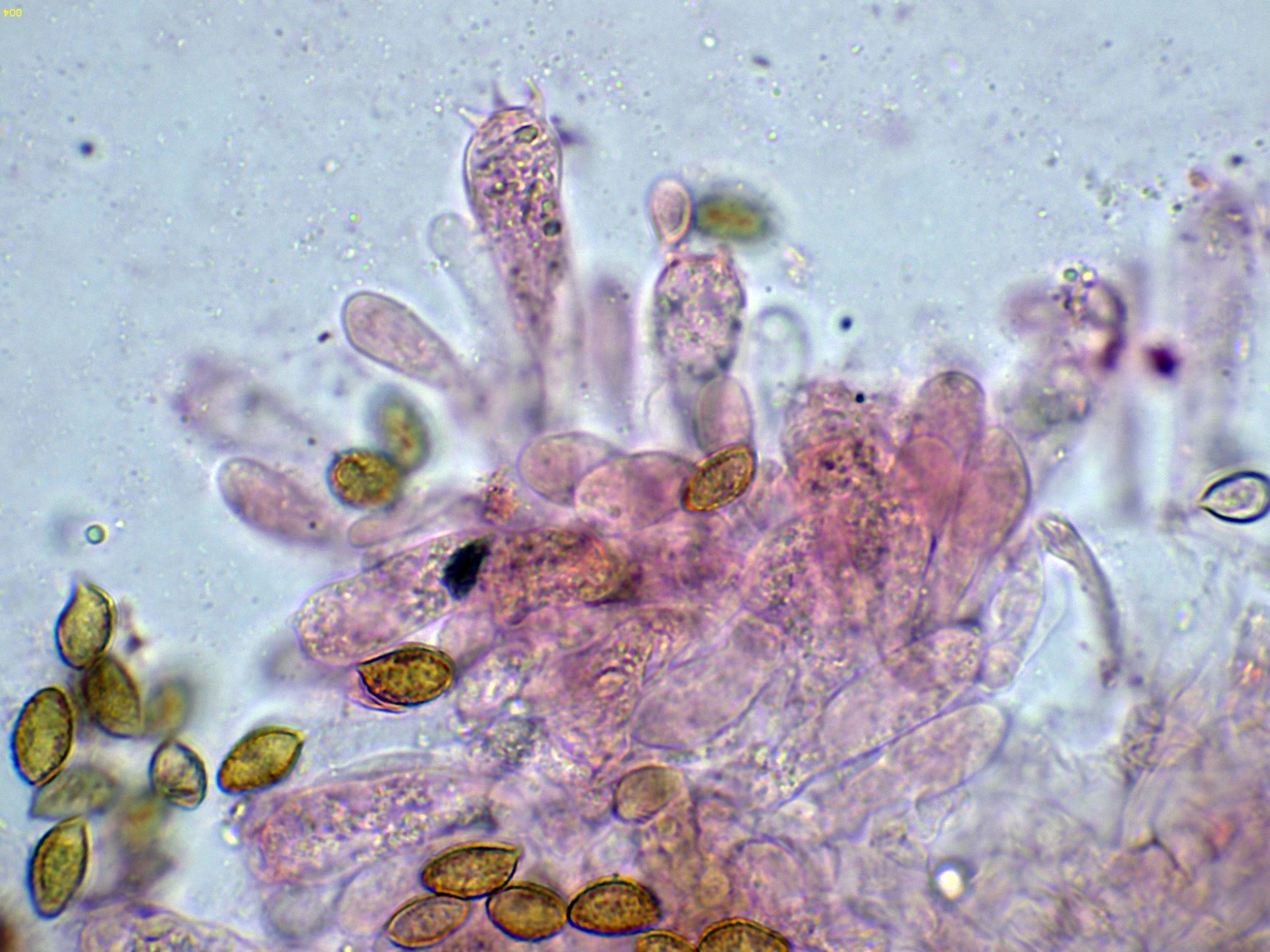 Esporas largamente ovoides en vista frontal, de ápice redondeado, subamigdaloides en vista lateral, con verrugas medianas, densas y medianamente altas, conformando un perímetro asperulado, de (8) 8,5-9,3-9,5 (10,5) x (5) 5,5-5,95-6,5 μm. Q = (1,45) 1,50-1,60 (1,70). Basidios tetraspóricos de 30-35 x 10-11 μm. Arista laminar fértil, con abundantes células estériles claviformes, piriformes y ventricosas, de 18-26 x 7-10 μm, mezcladas con basidios. Cutícula pileal con un epicutis compuesto por hifas fibulíferas paralelas, de 4-7 μm de grosor, con pigmento intracelular vacuolar y parietal incrustante, pardo pálido y un subcutis diferenciado con elementos fibulados cortos y anchos.