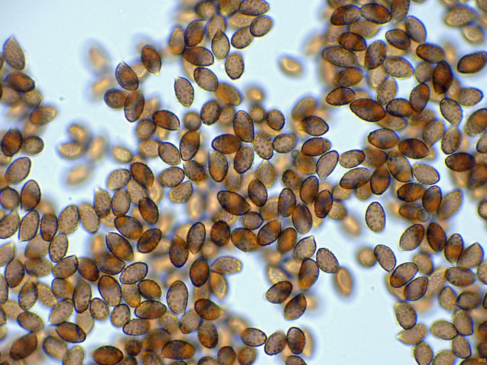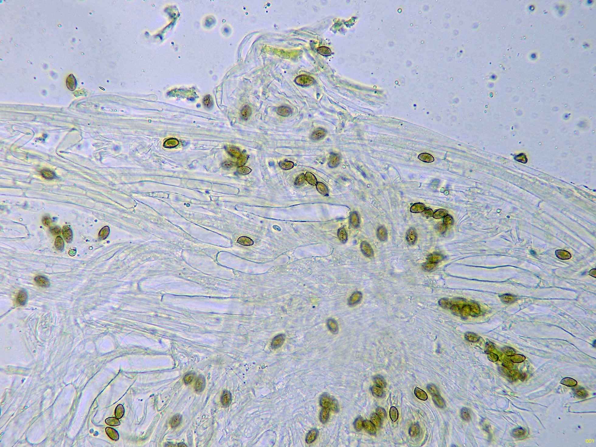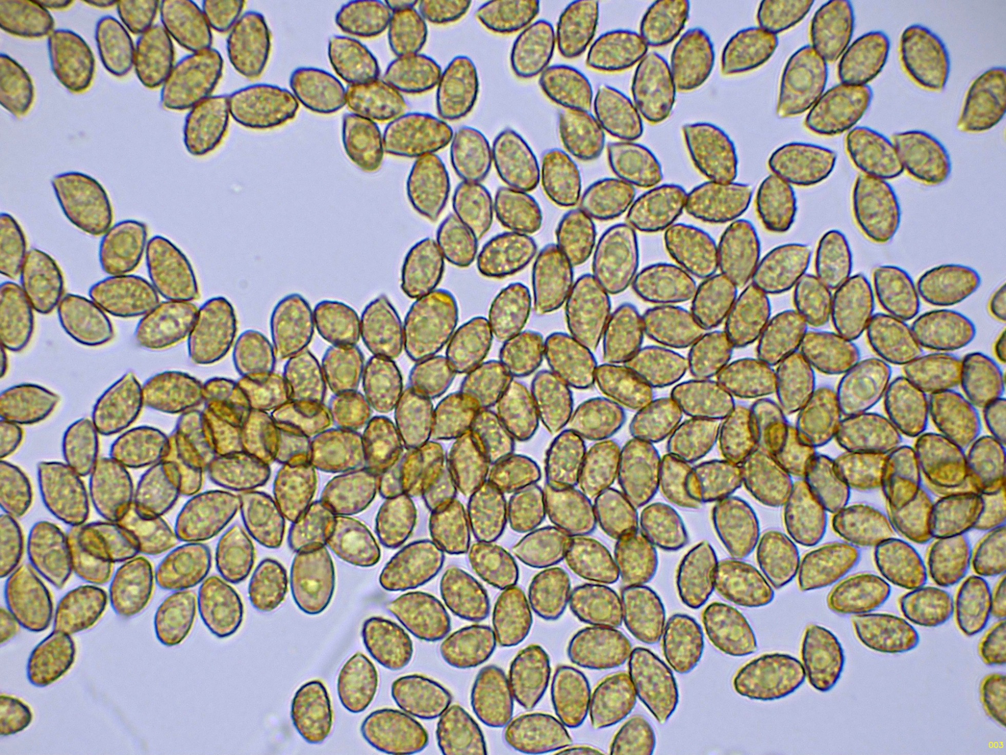 Esporas largamente ovoides en vista frontal, de ápice redondeado, subamigdaloides en vista lateral, con verrugas medianas, densas y medianamente altas, conformando un perímetro asperulado, de (8) 8,5-9,3-9,5 (10,5) x (5) 5,5-5,95-6,5 μm. Q = (1,45) 1,50-1,60 (1,70). Basidios tetraspóricos de 30-35 x 10-11 μm. Arista laminar fértil, con abundantes células estériles claviformes, piriformes y ventricosas, de 18-26 x 7-10 μm, mezcladas con basidios. Cutícula pileal con un epicutis compuesto por hifas fibulíferas paralelas, de 4-7 μm de grosor, con pigmento intracelular vacuolar y parietal incrustante, pardo pálido y un subcutis diferenciado con elementos fibulados cortos y anchos.
