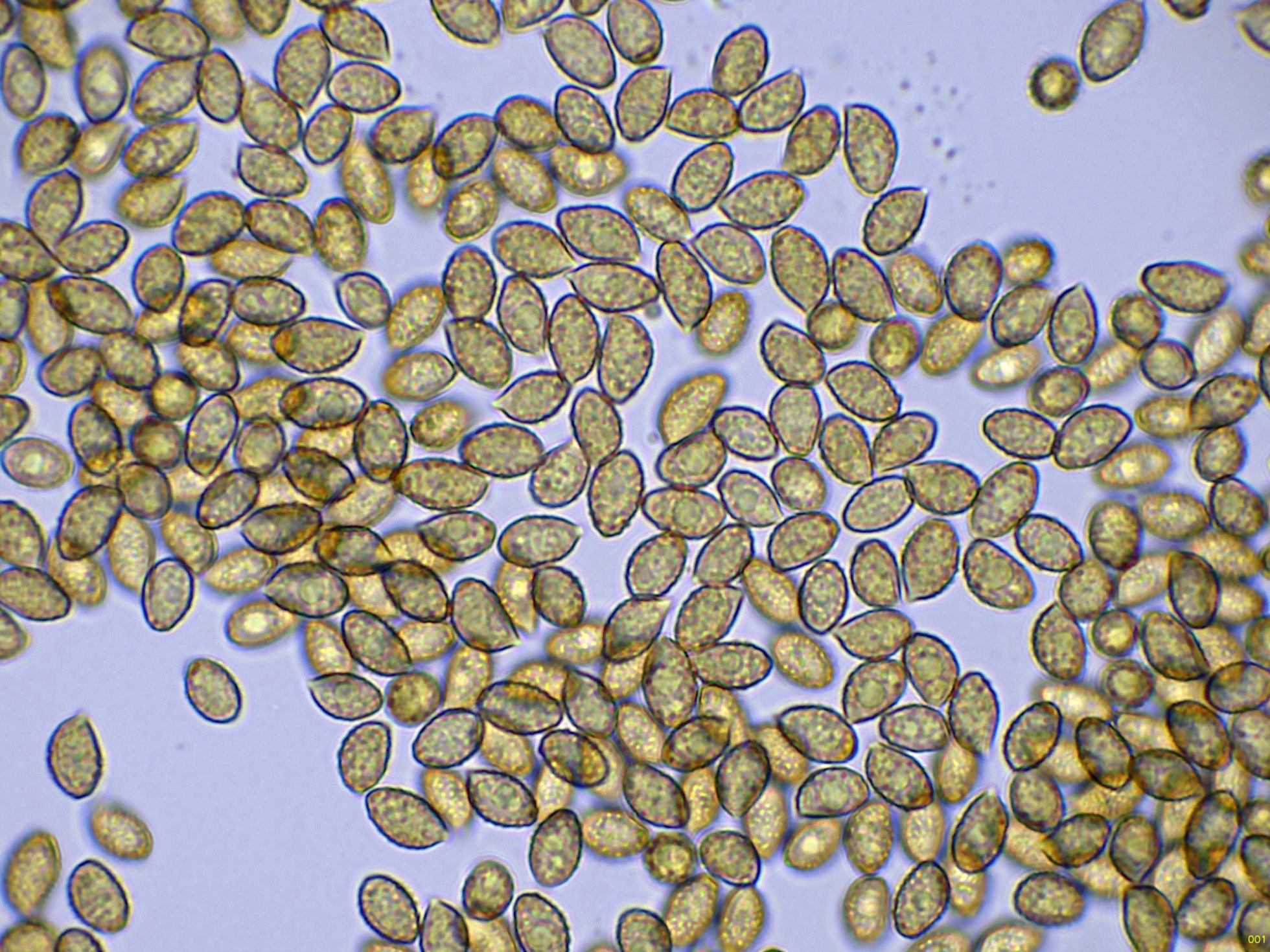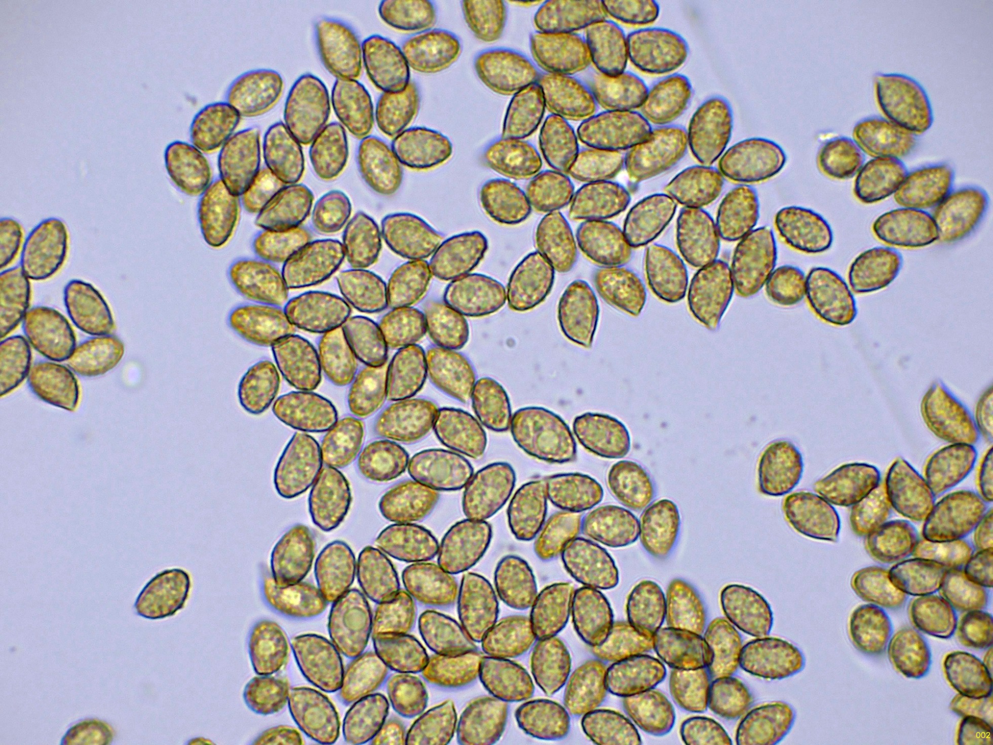 Las esporas en Reactivo de Melzer, con un comportamiento dextrinoide: