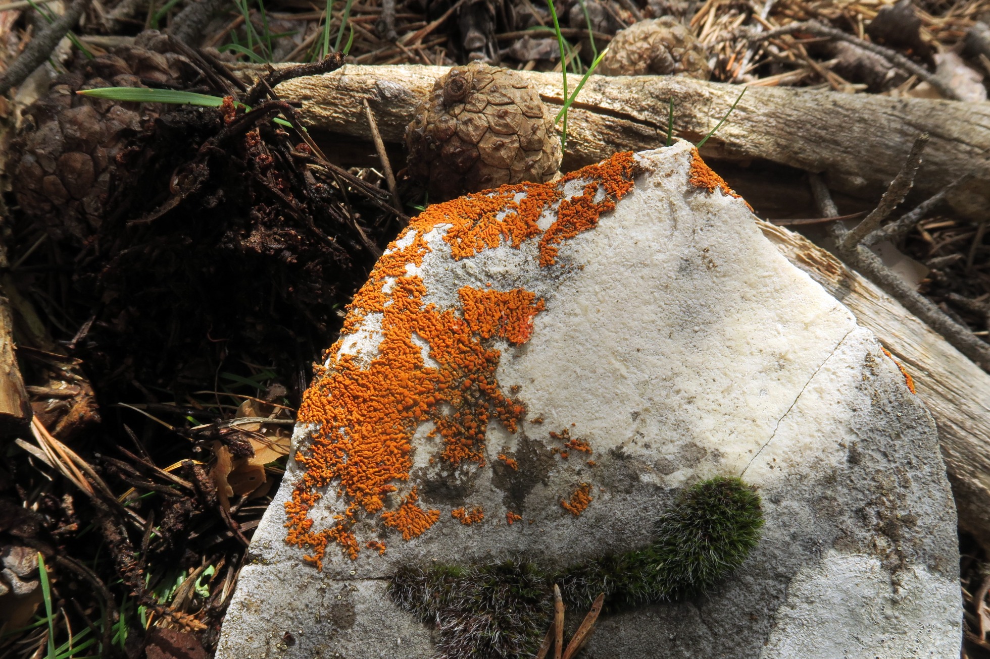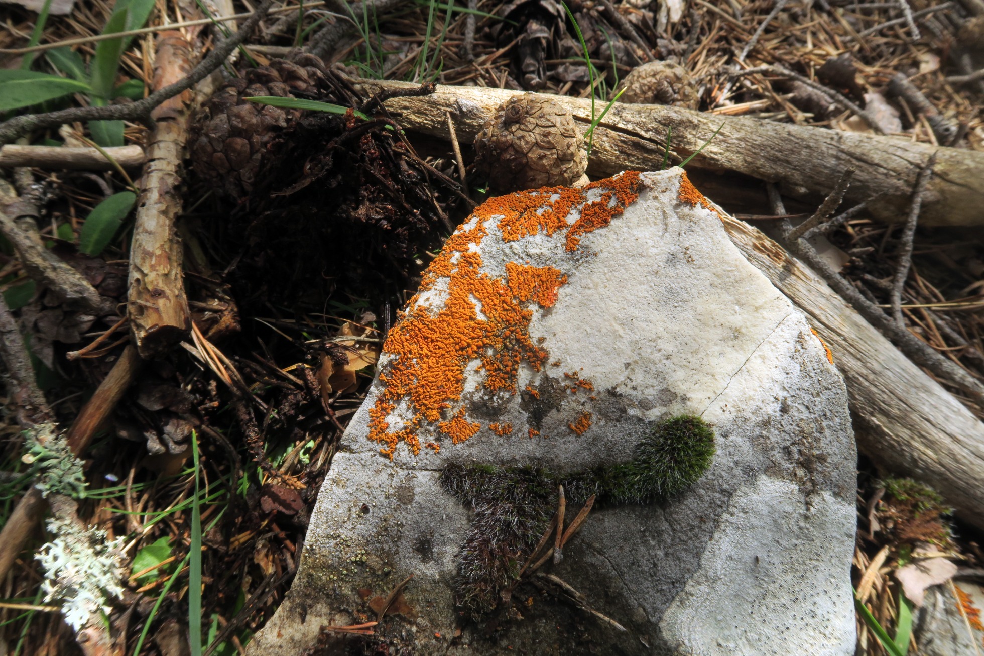 El liquen cubriendo una buena parte de una roca caliza del suelo, expuesta al sol: