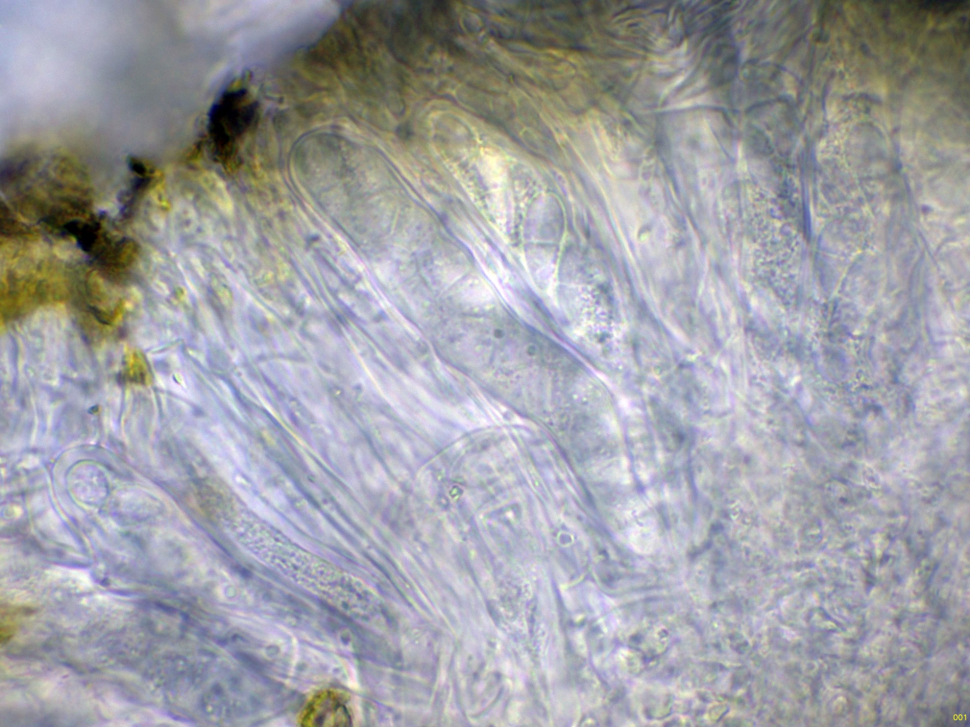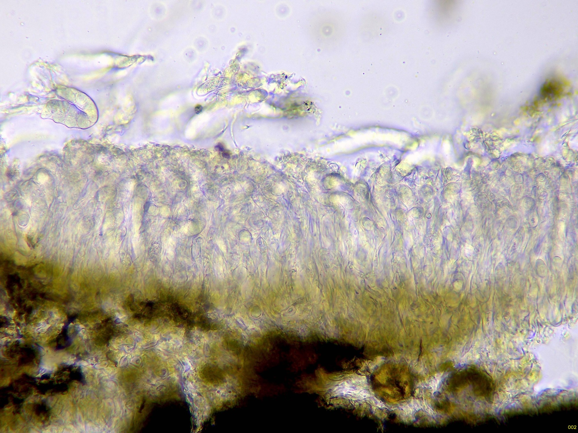 Una ampliación del himenio en Reactivo de Melzer a 600 aumentos: