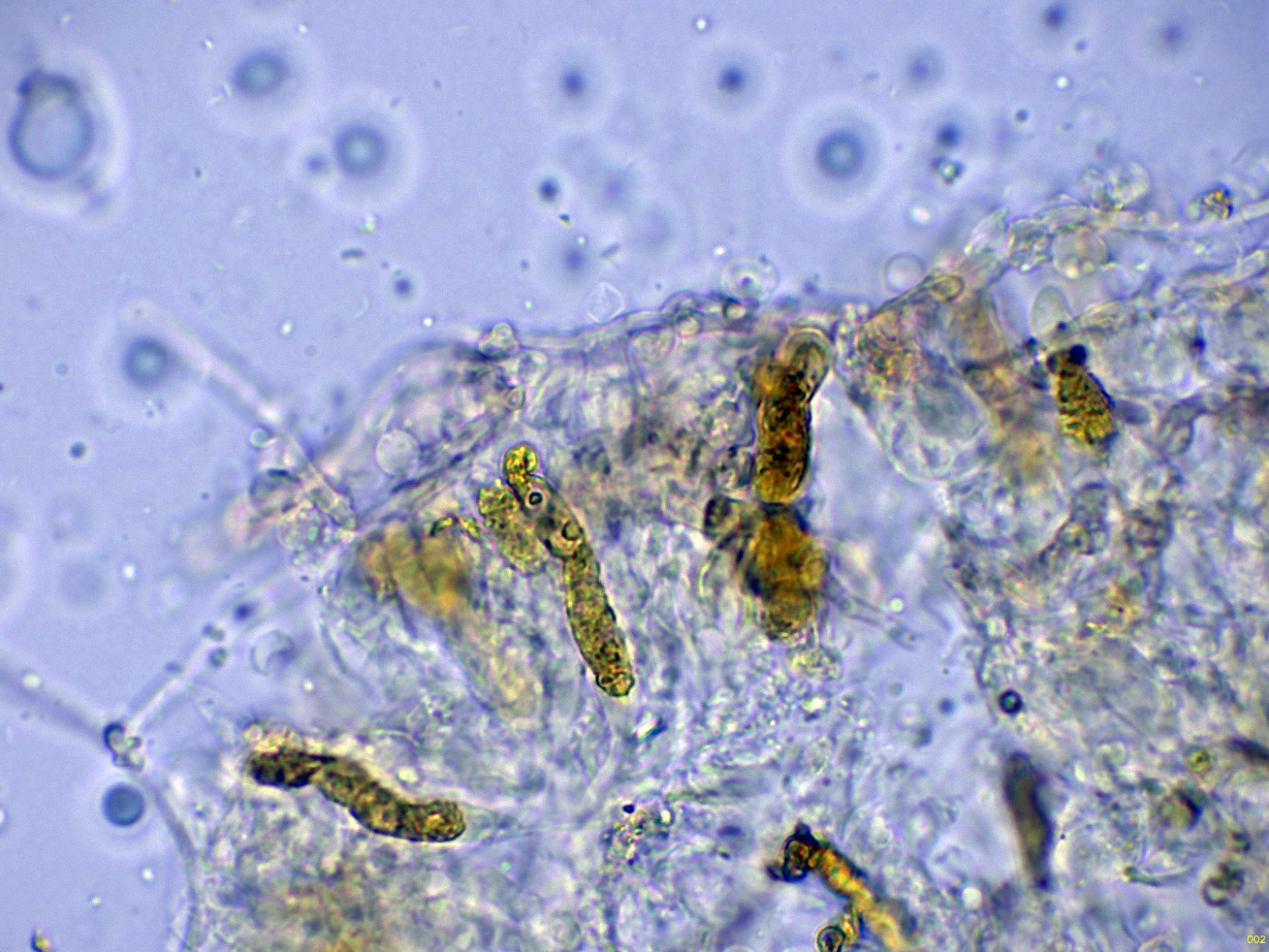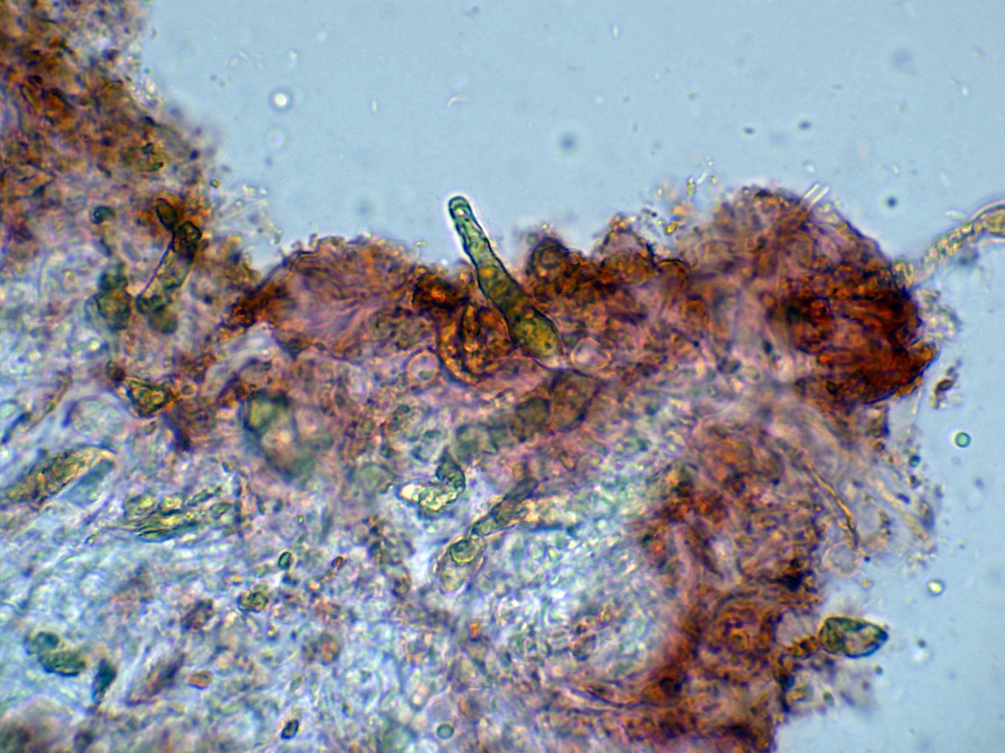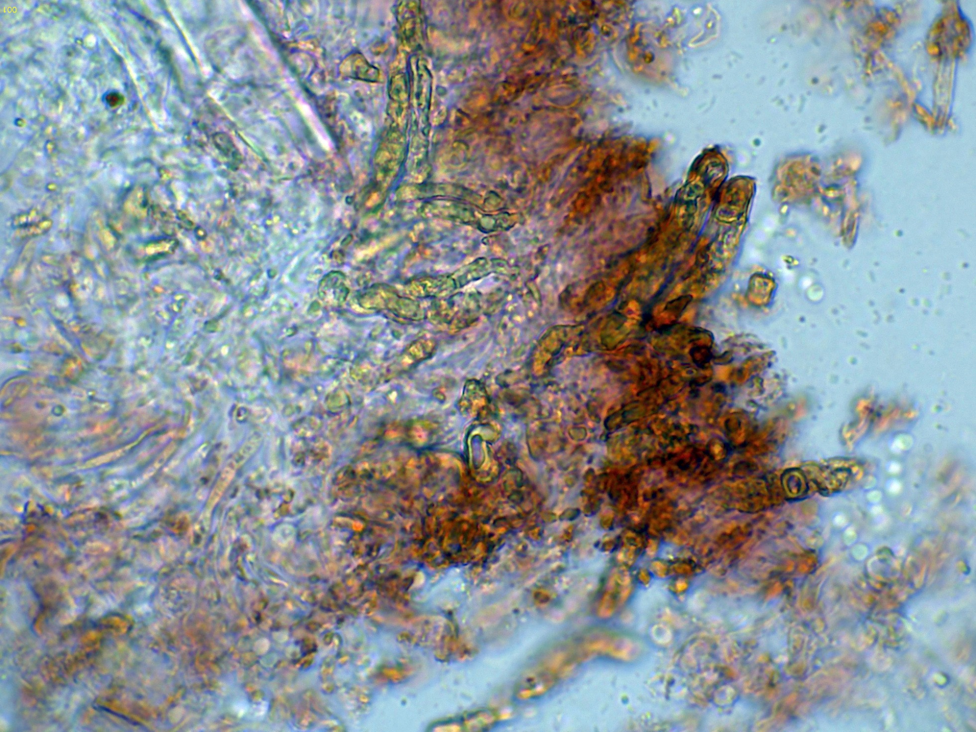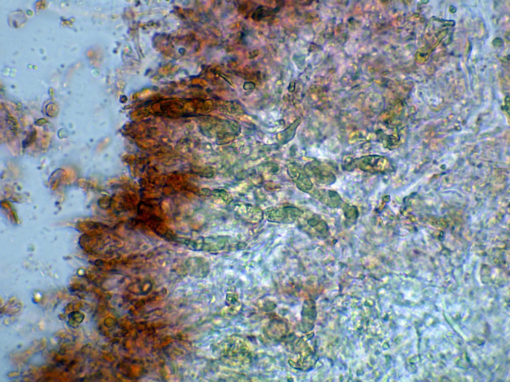 Debido a la presencia de numerosos gloeocistidios, decidí probar con la Sulfovainillina, curiosamente no se colorearon en este medio.