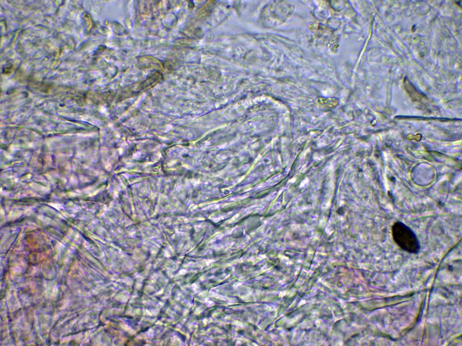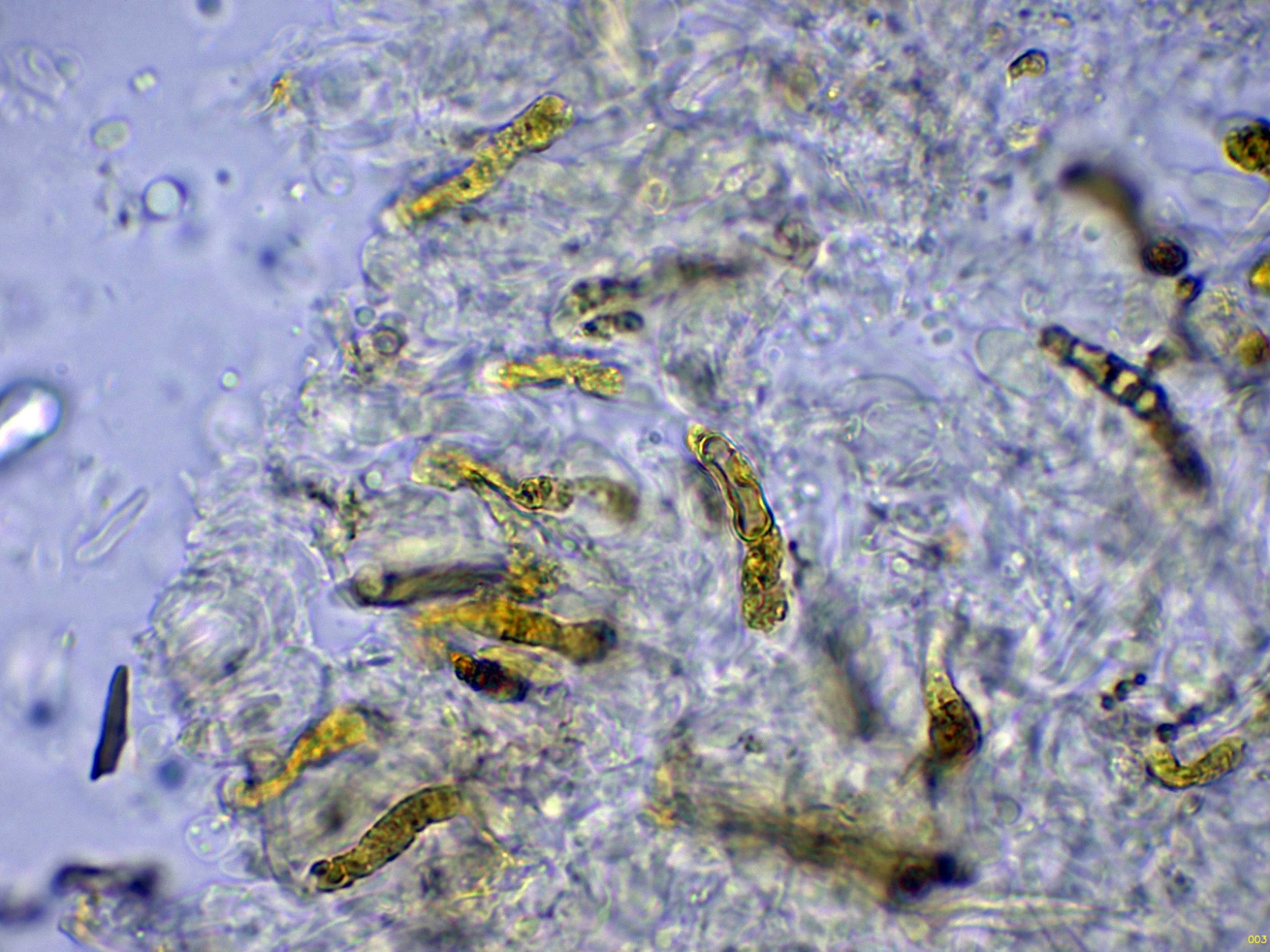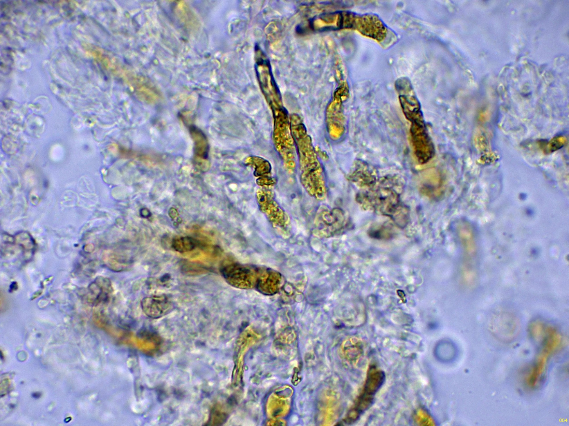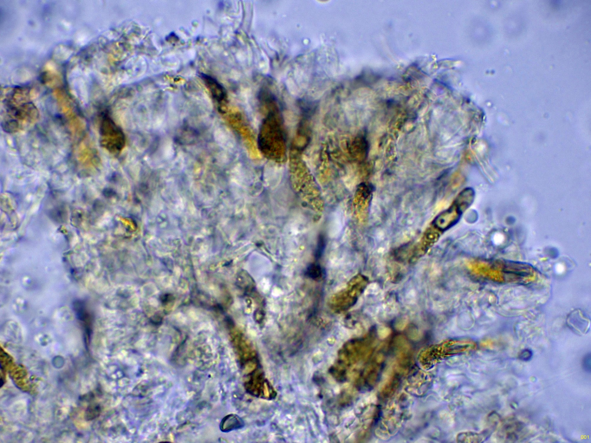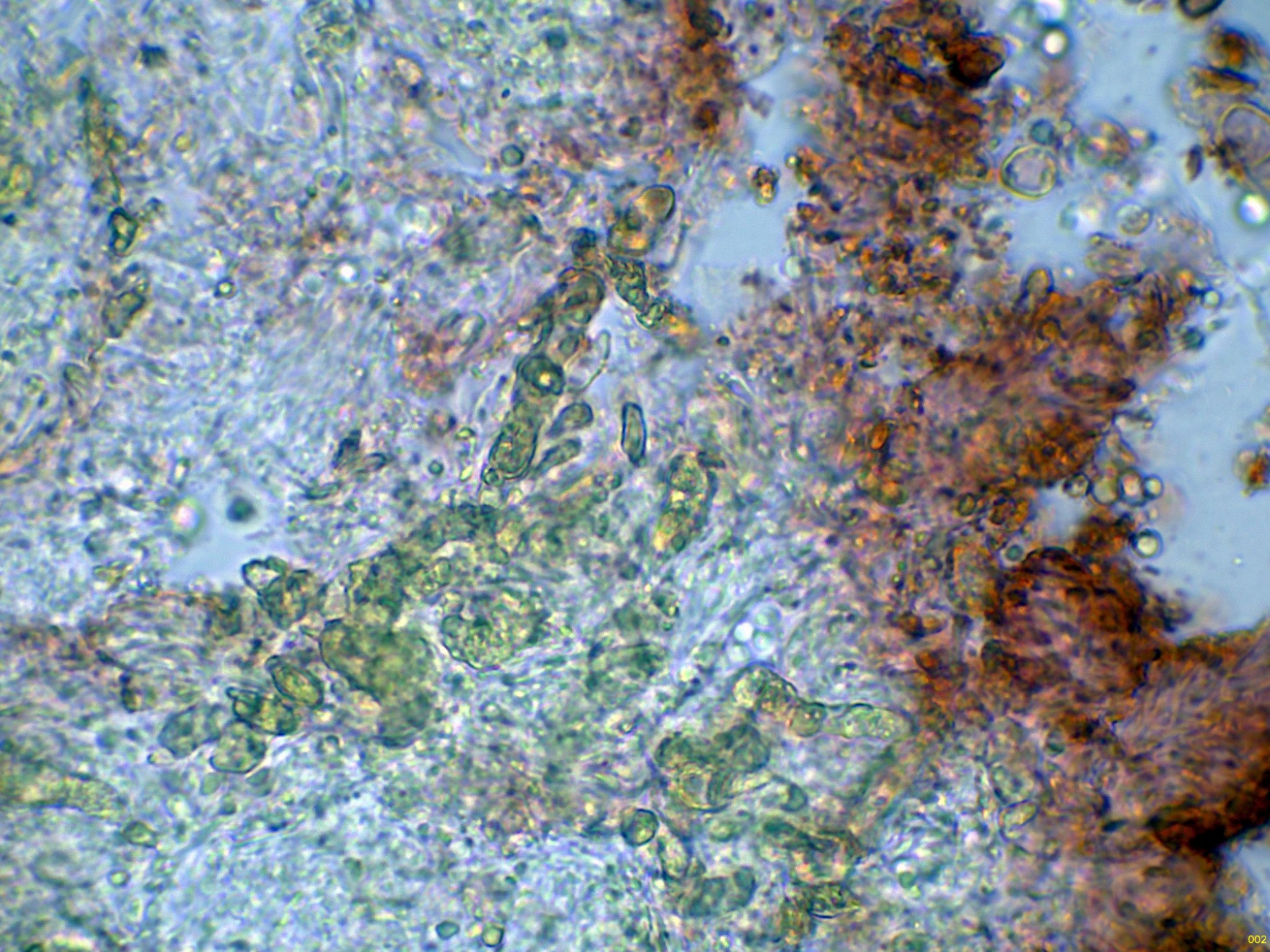 Debido a la presencia de numerosos gloeocistidios, decidí probar con la Sulfovainillina, curiosamente no se colorearon en este medio.