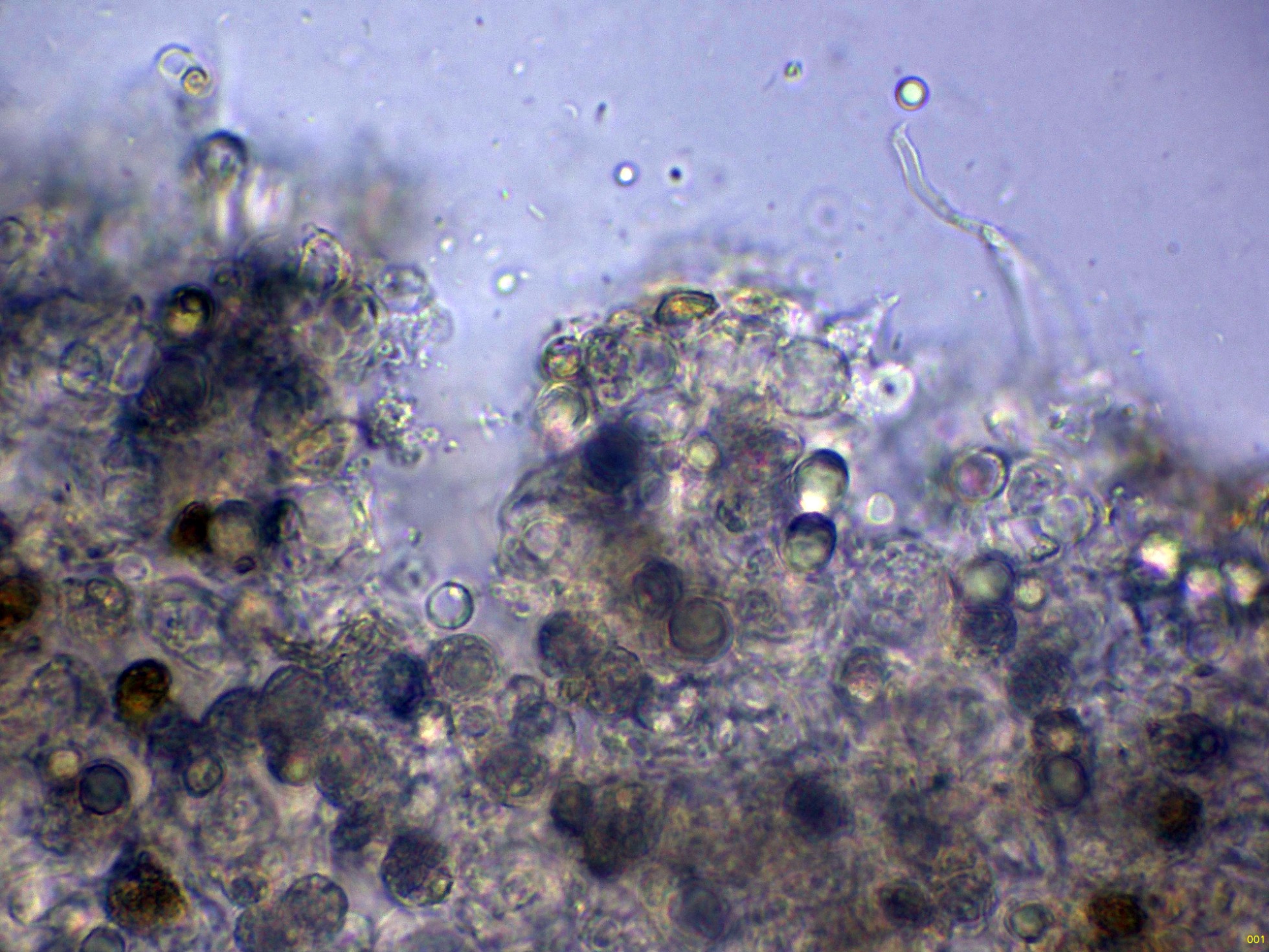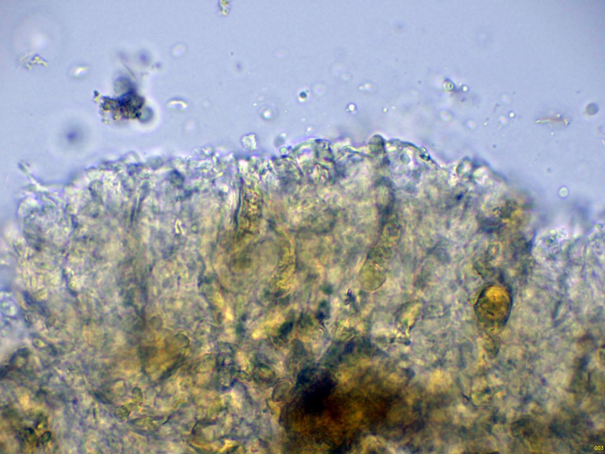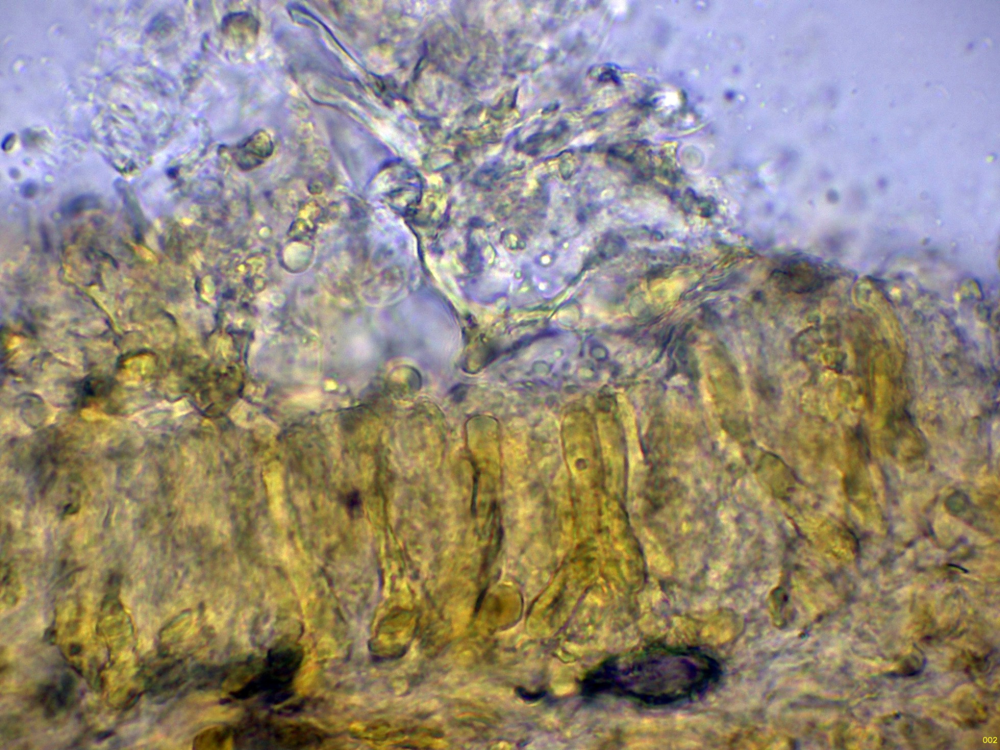 El himenio utilizando solo agua, donde se pueden intuir sus basidios de difícil observación: