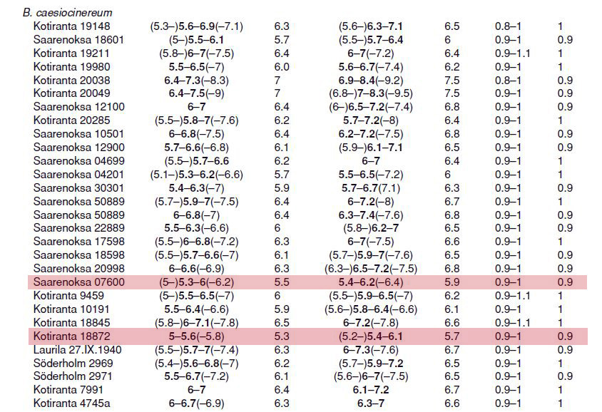Tremellales) in Finland", y si bien las medidas esporales del presente estudio, se encuentran por debajo de las citadas mayoritariamente por los autores, entiendo que esto puede ser debido a una gran variabilidad dentro de la especie, en cuanto a las medidas esporales se refiere, ya que se corresponde bastante bien con las medidas indicadas por Saarenoksa 07600 y Kotiranta 18872, añado una captura de pantalla con las diferentes medidas esporales en función de la recolecta: