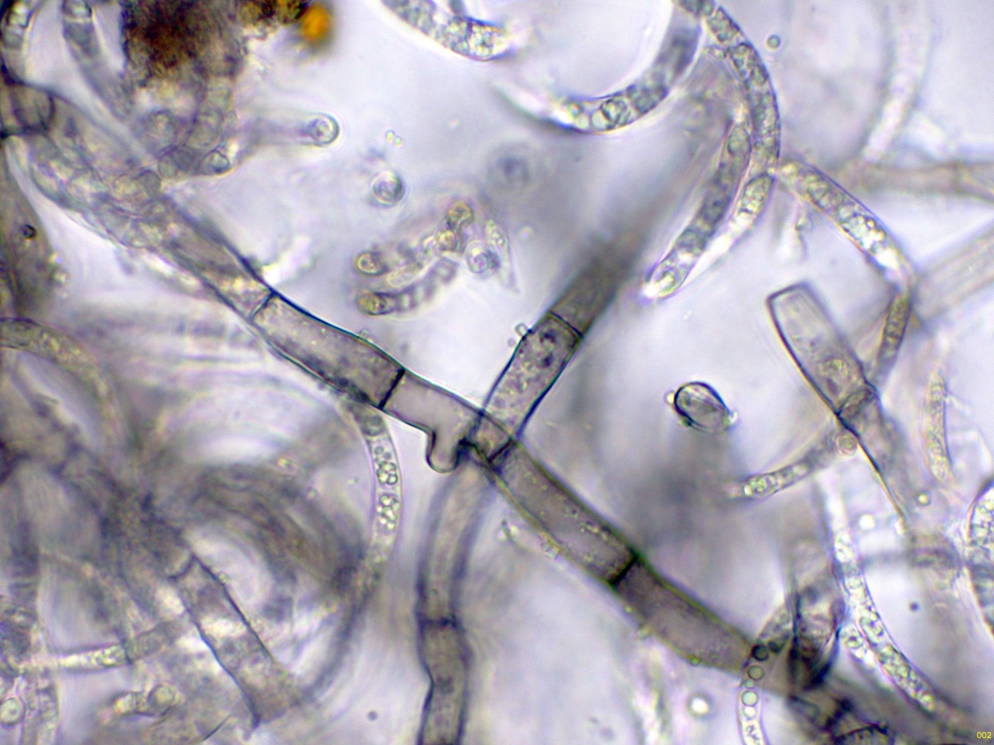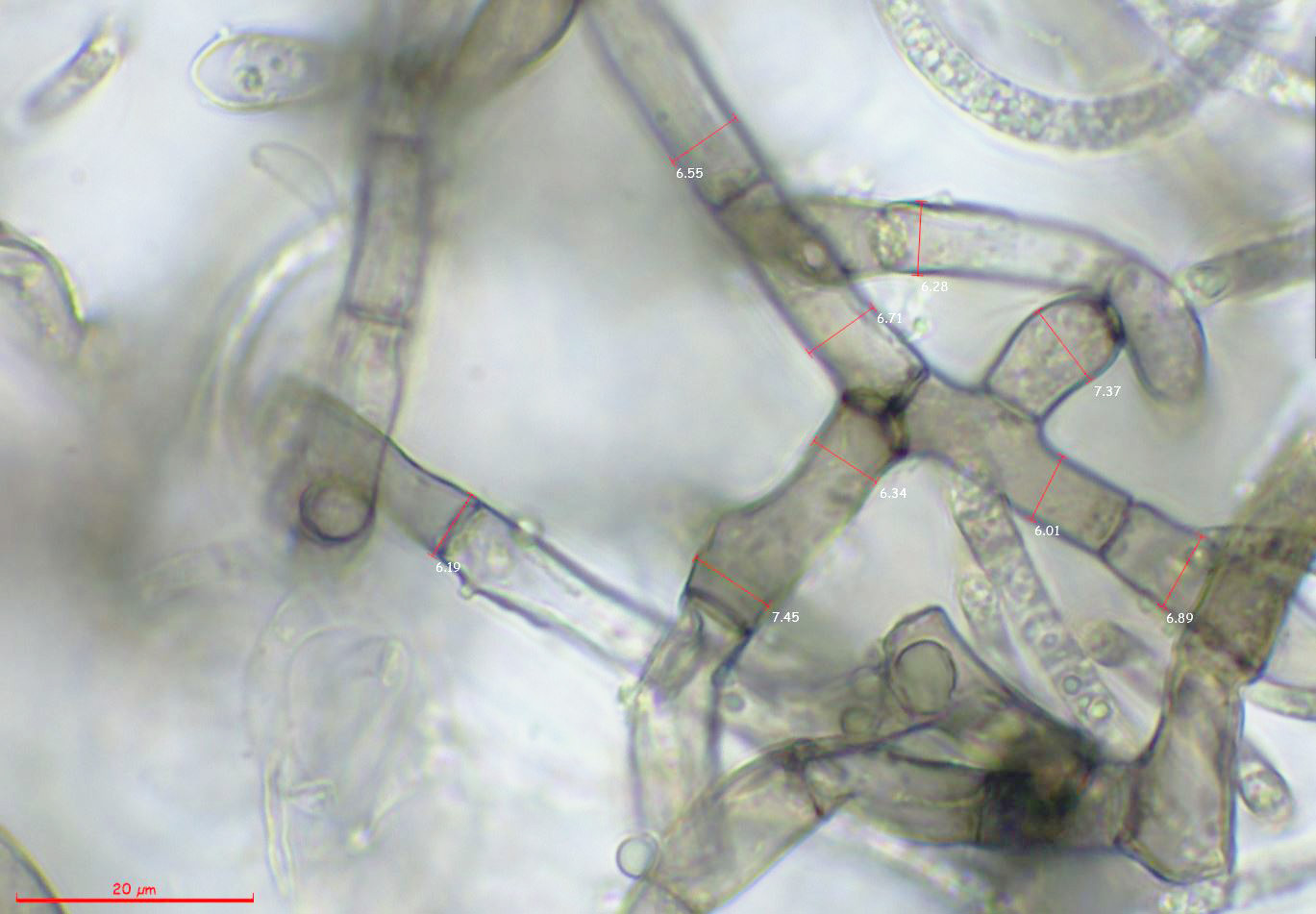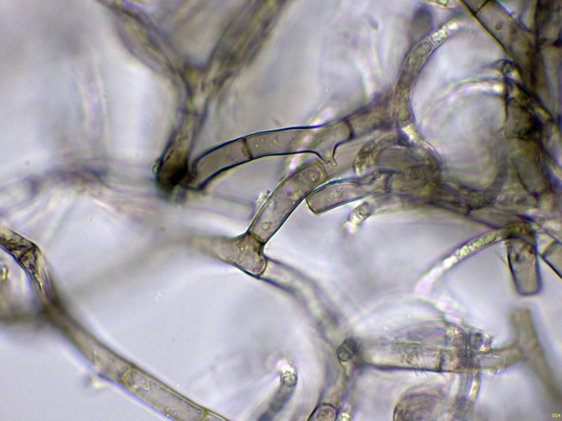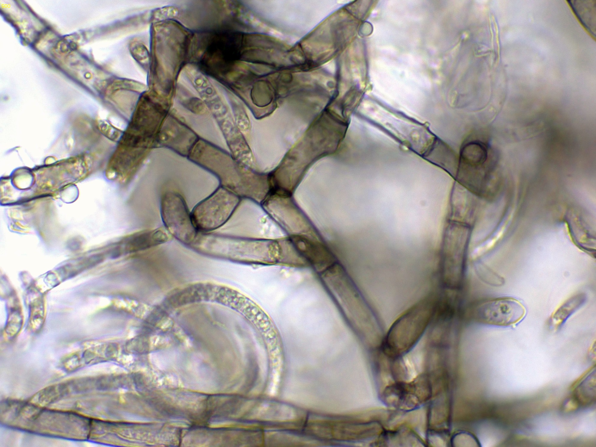 Hifas conidiógenas mayoritariamente superficiales, parcialmente inmersas, compuestas por hifas ramificadas, septadas, de color subhialino a marrón pálido: