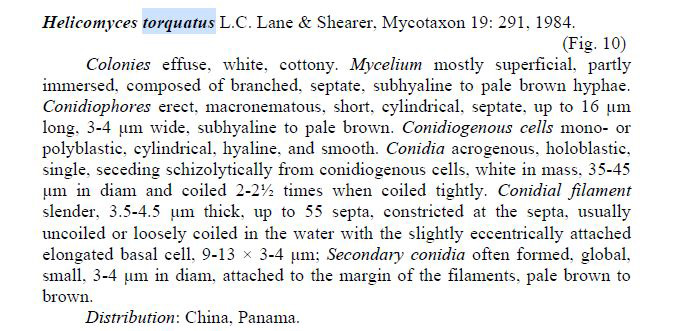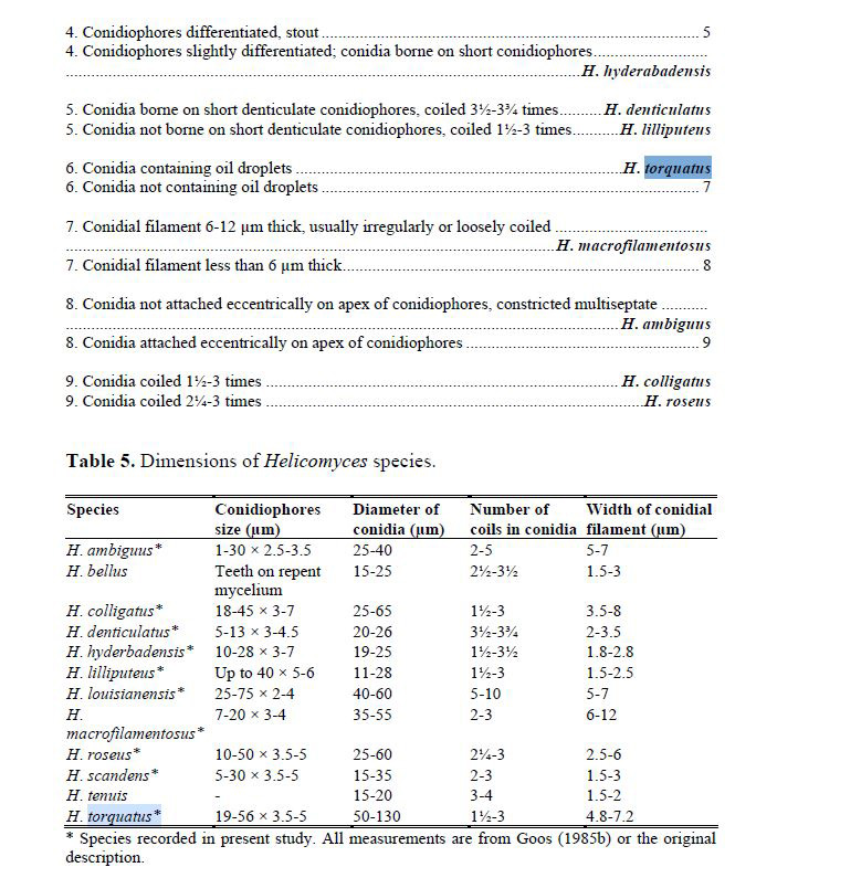 Determinación hecha atendiendo a la información del documento "Helicosporous hyphomycetes from China", en el que ya tan solo por las hifas conidiógenas bastante hialinas y las medidas de los conidios, prácticamente todos con un diámetro por encima de las 30 micras, ya descarto Helicosporium (con conidios más pequeños e hifas conidiógenas pigmentadas) y debo centrarme en Helicomyces, dentro del género Helicomyces con conidios con gotitas de aceite en su interior y un diámetro de entre 35 a 45 µm., conducen rápidamente al Helicomyces torquatus propuesto, añado un pantallazo de las Claves: